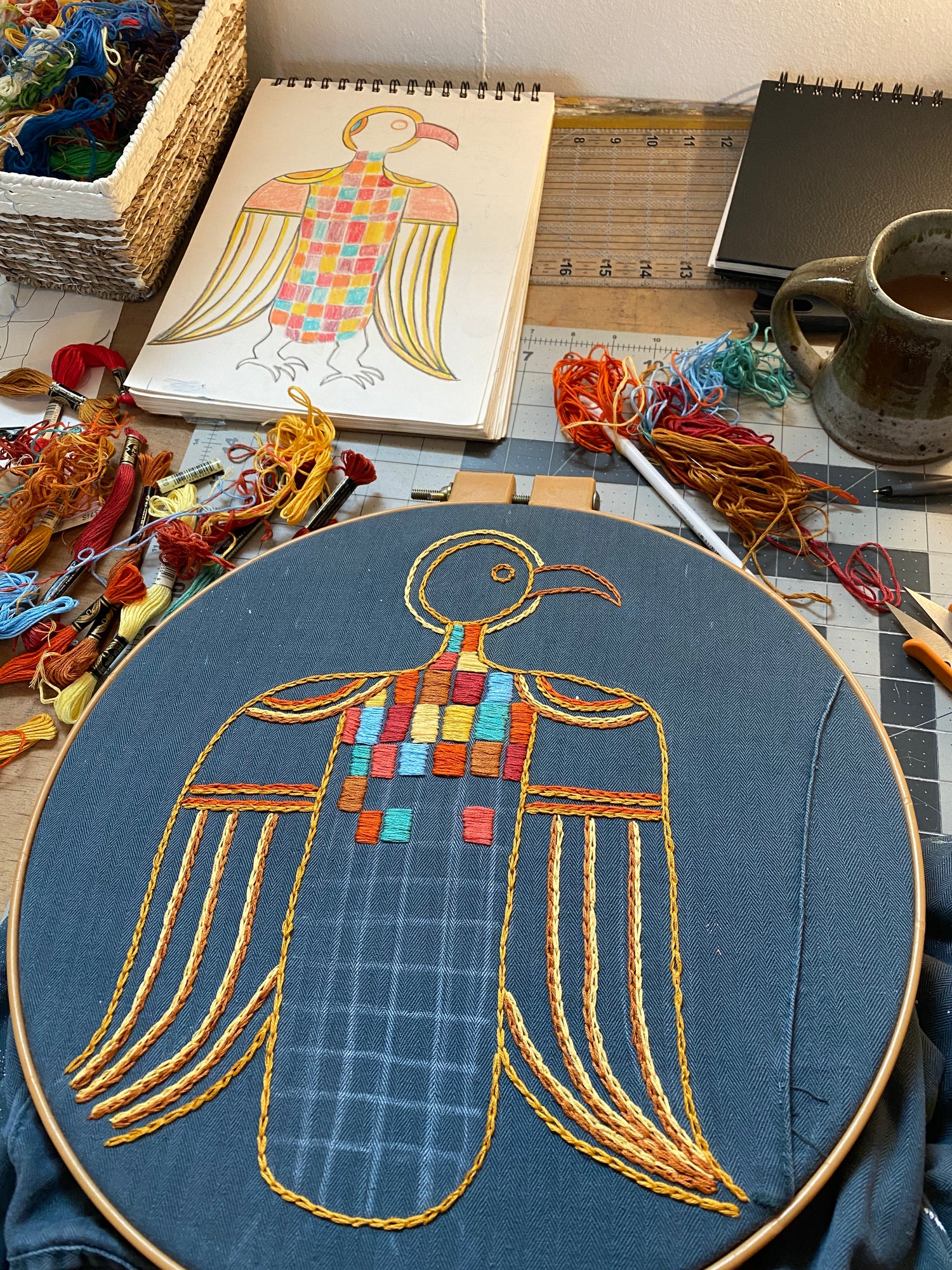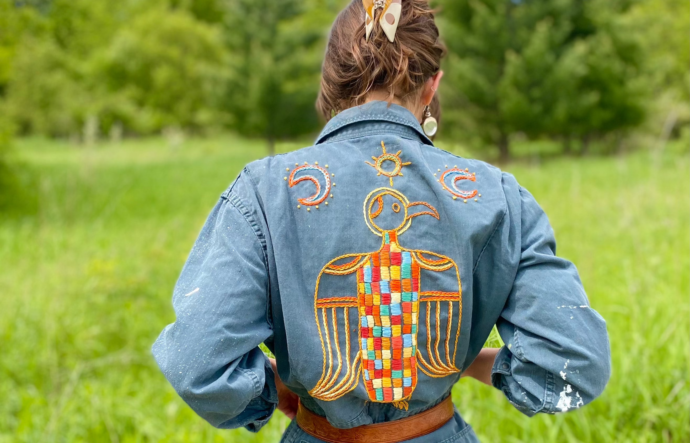 Each embroidered garment is hand stitched using a needle, floss and a hoop. Sara intentionally combines the thread color and stitch texture onto clothing to create each unique design.