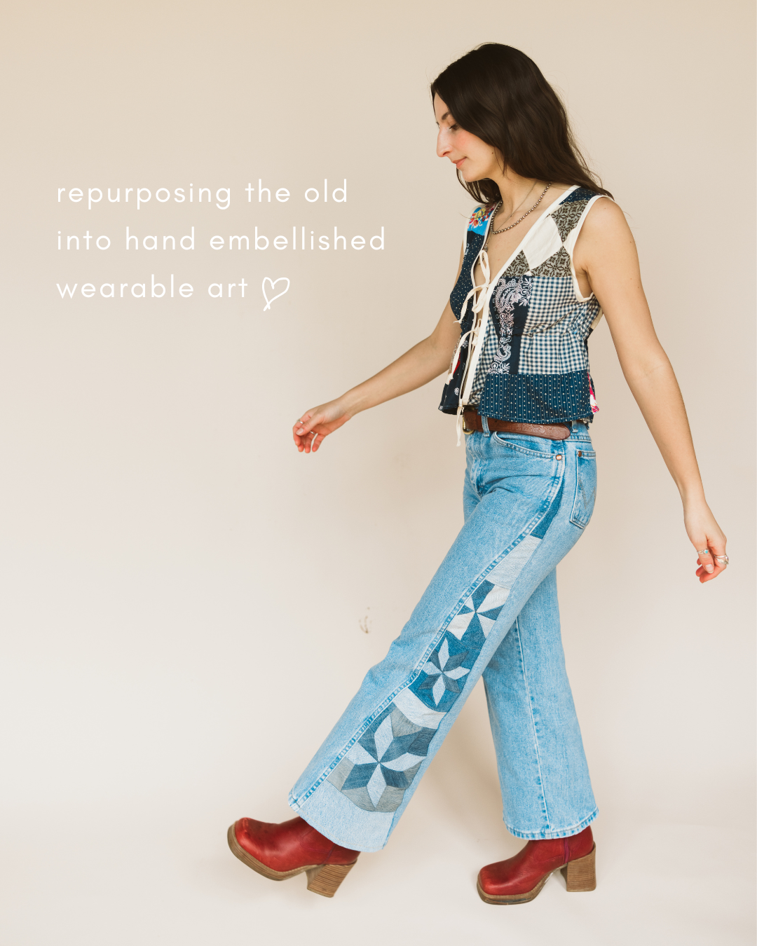 Quilted, hand-embroidered and appliquéd vintage heirlooms, embellished using forgotten textiles and repurposed denim. Each garment is a unique piece of wearable art, crafted with intention, with the goal of being as eco-friendly as possible. ♡ ♲