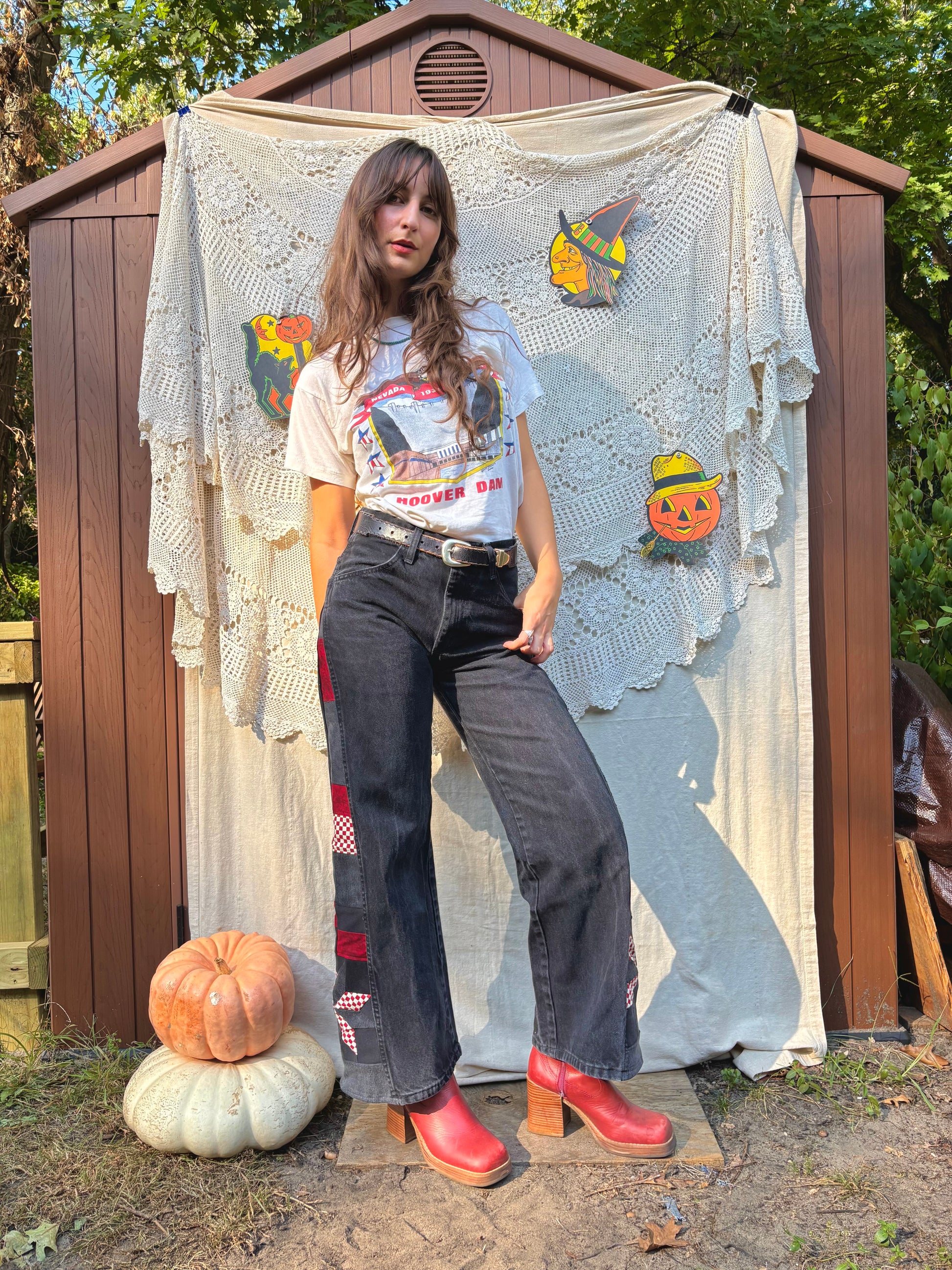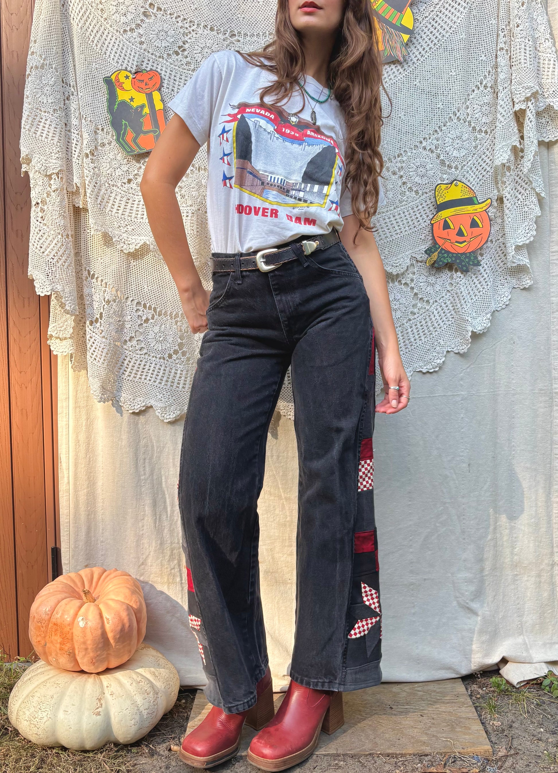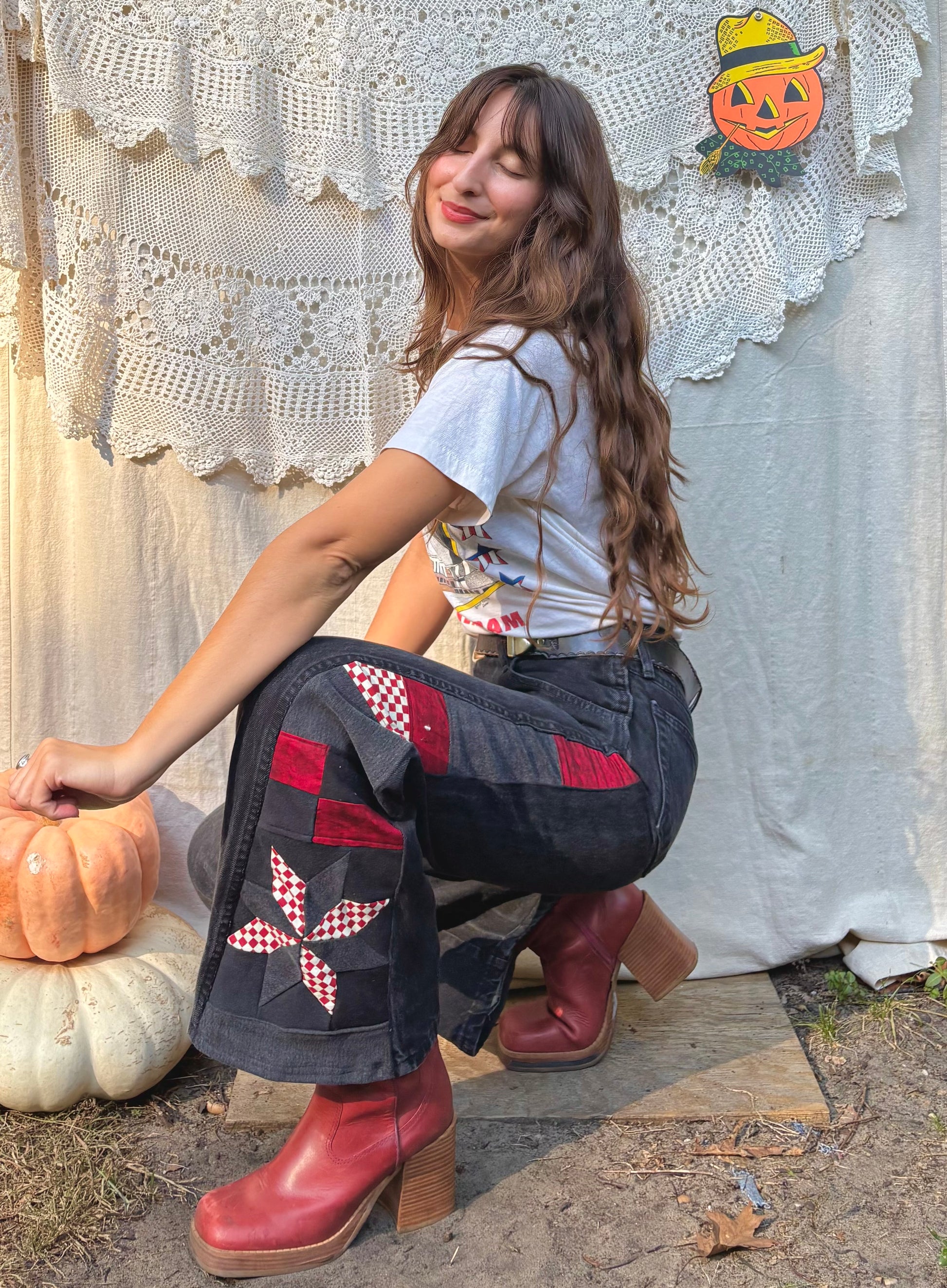 - Quilt star & checker panel on side legs, constructed out of red checker print fabroc, red cotton black denim fabric