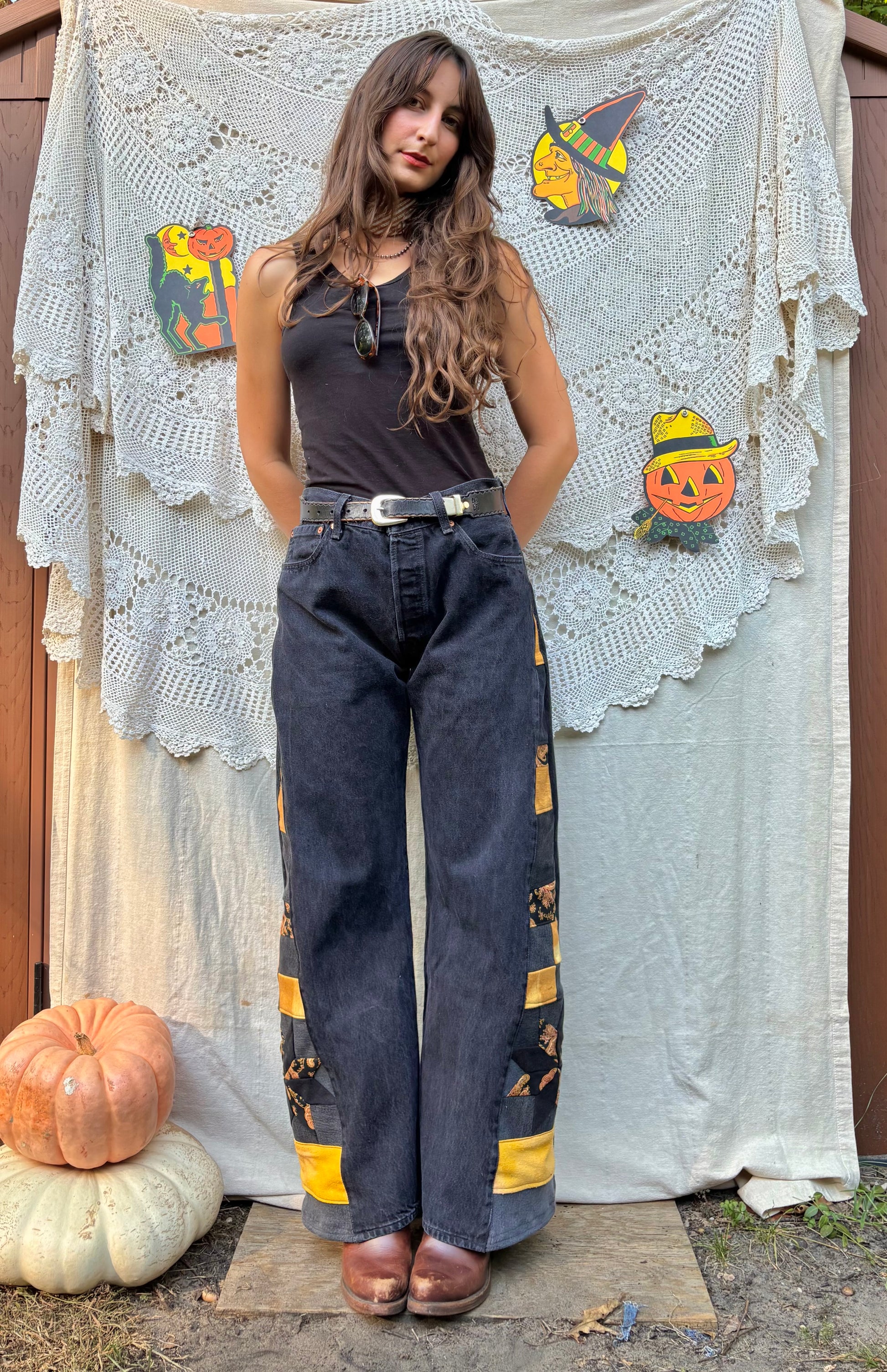 - Quilt star & checker panel on side legs, constructed out of vintage gold paisley, yellow hand dyed fabric and black denim fabric