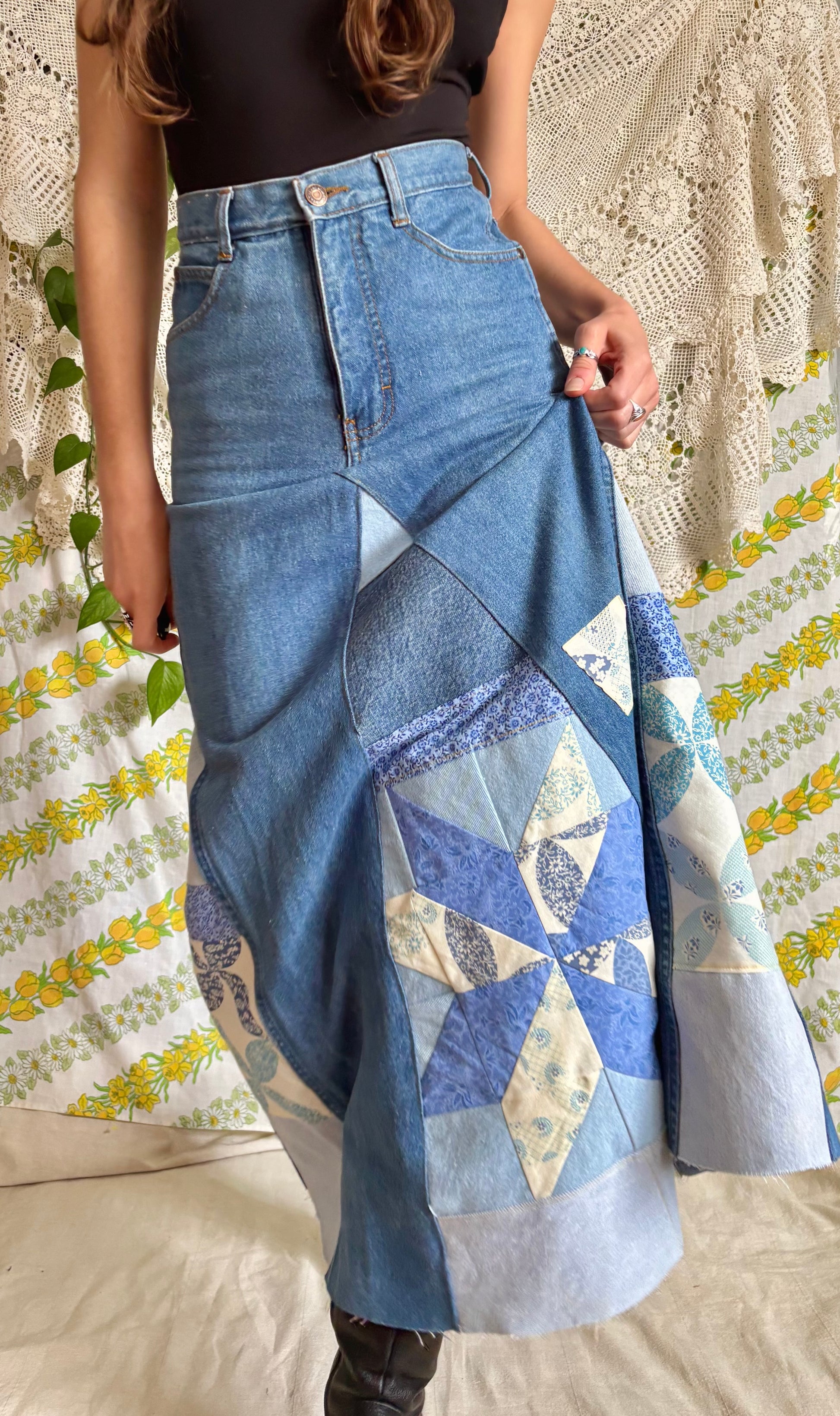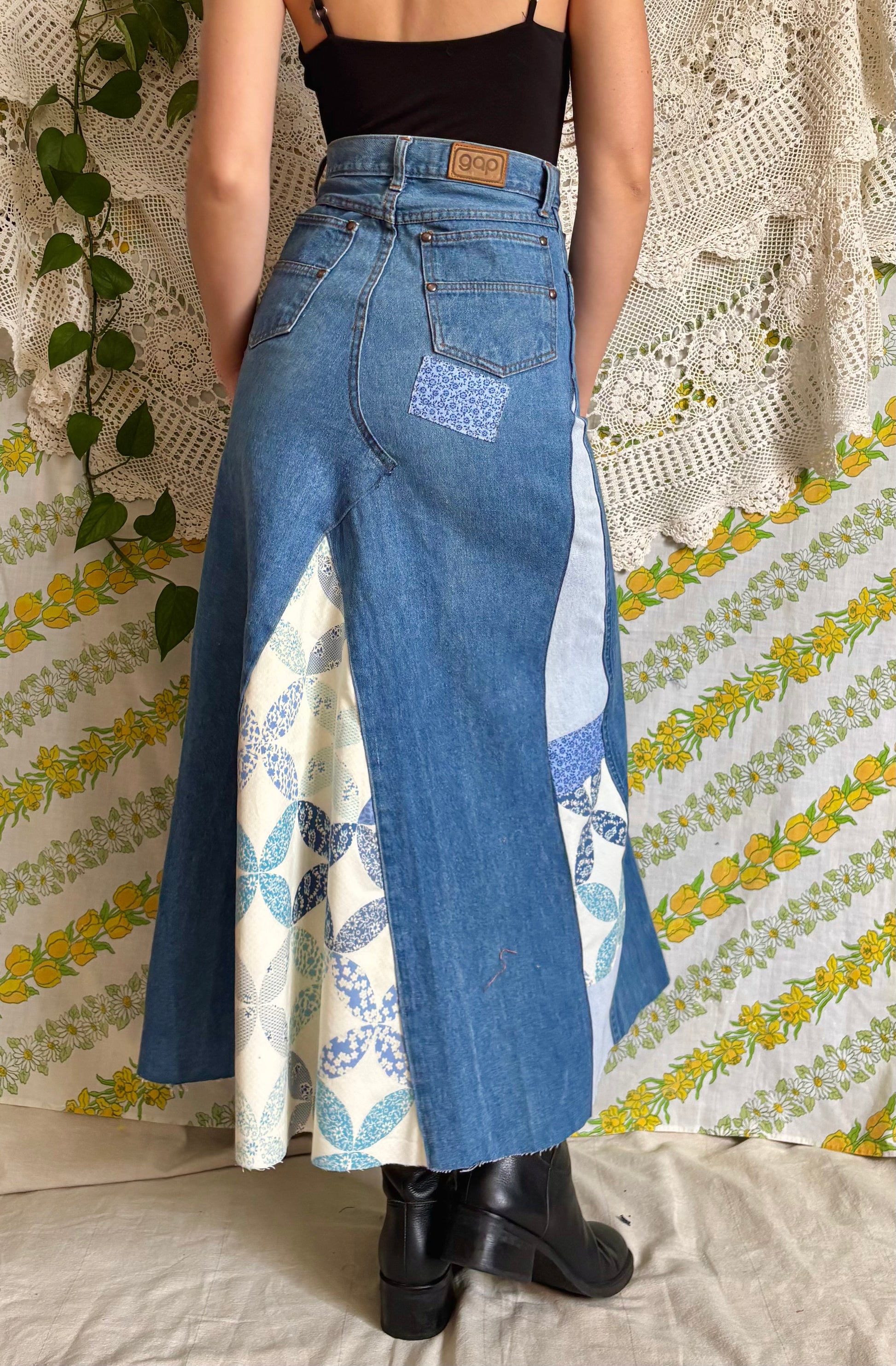 - Medium wash 70s vintage Gap jeans, converted into a sweet patchwork skirt