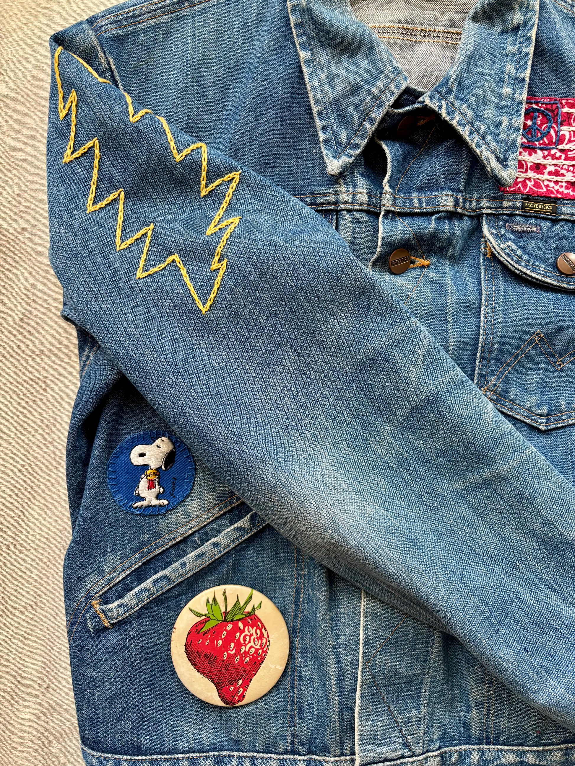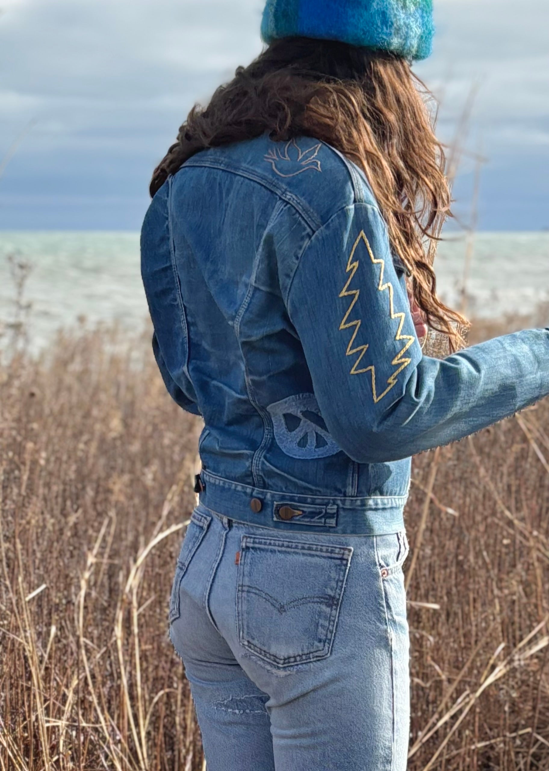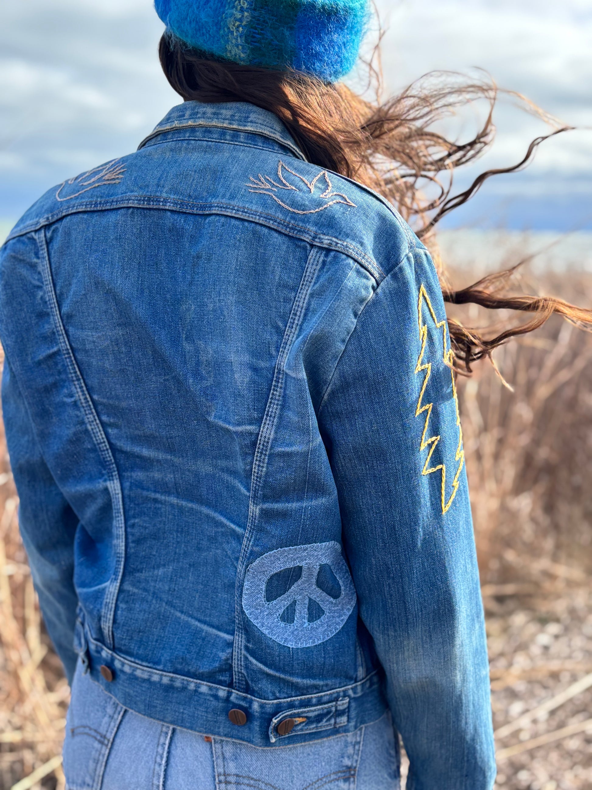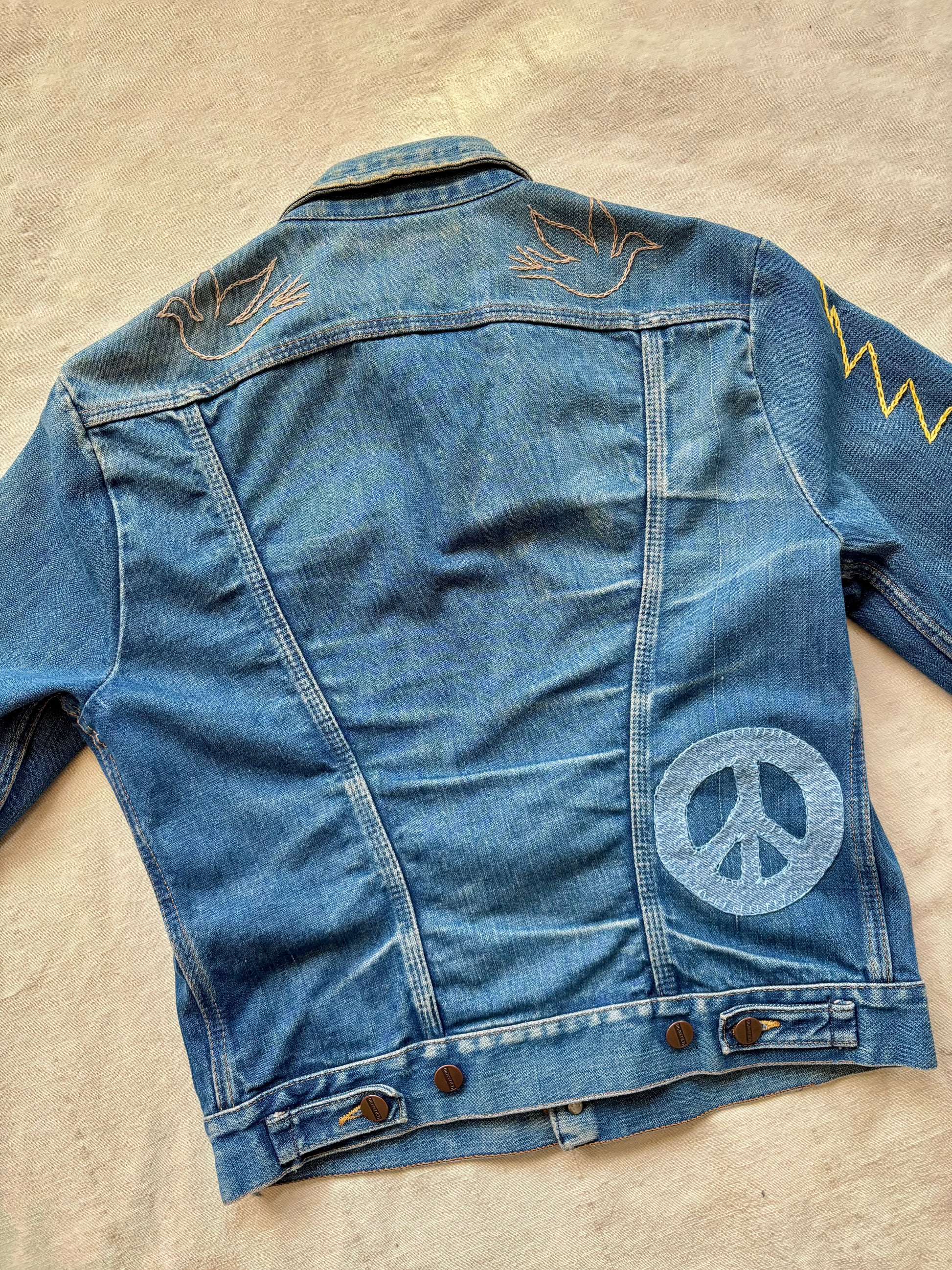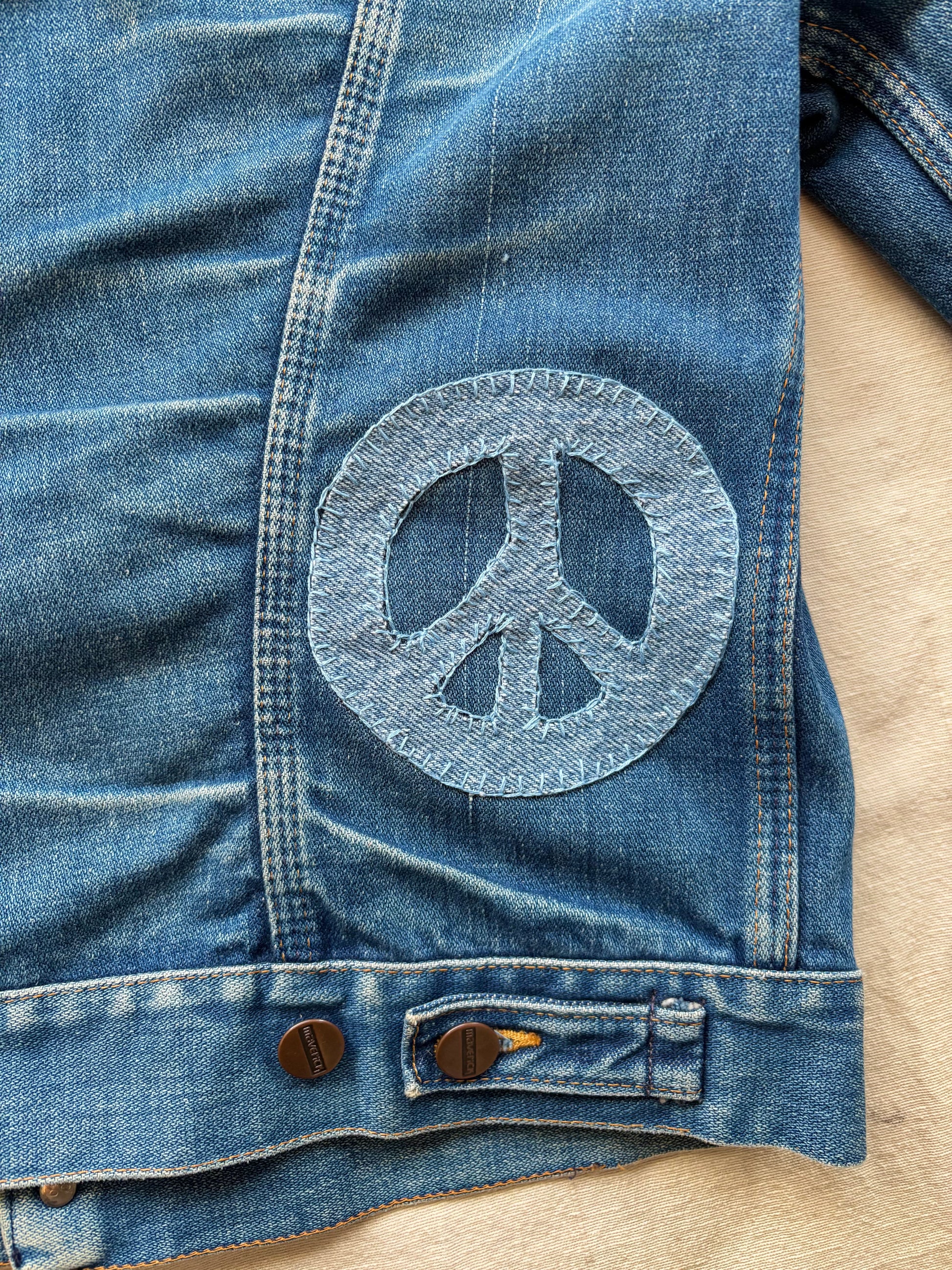 - Appliqué peace flag above left front pocket and denim peace sign on right back panel