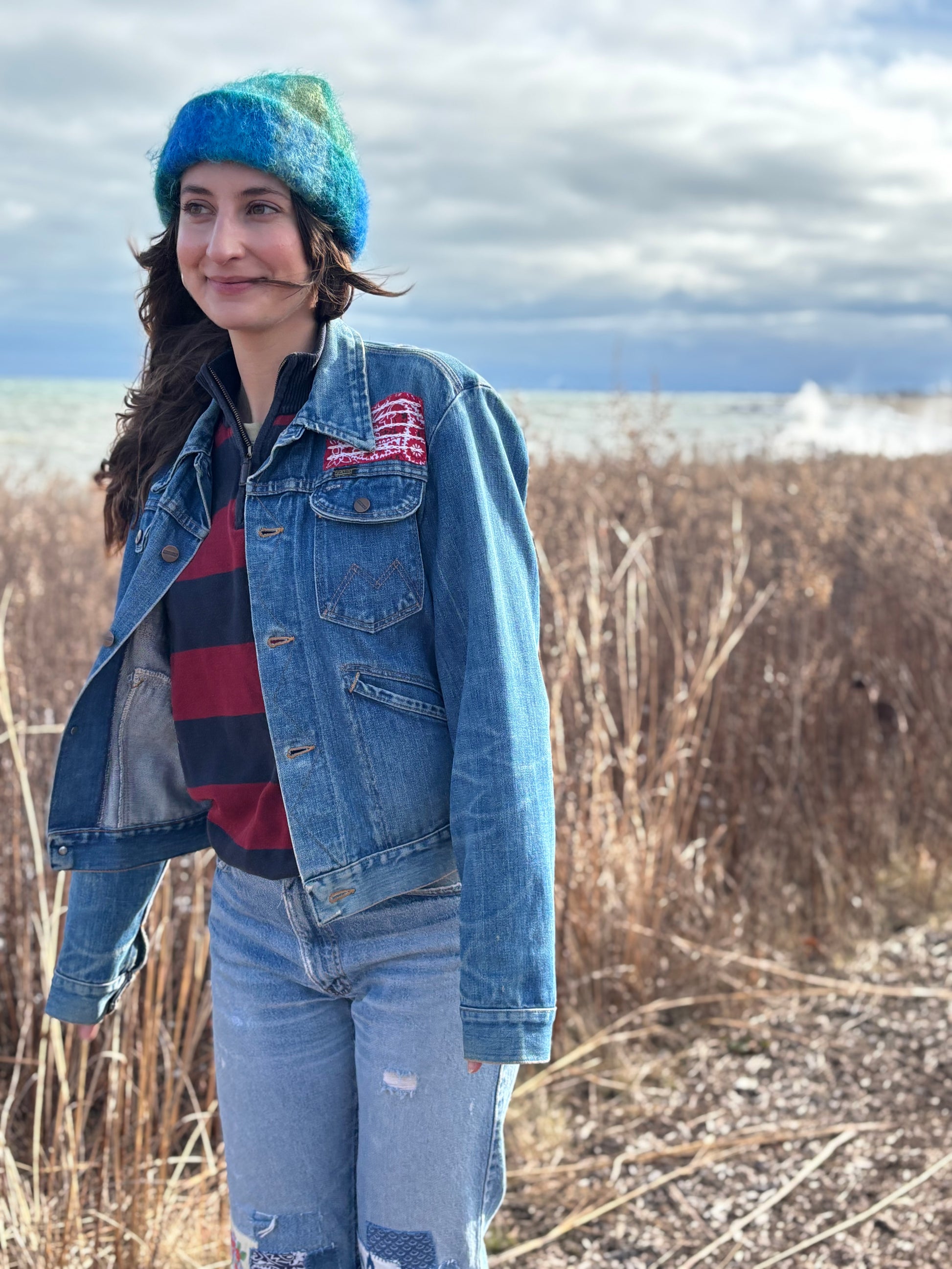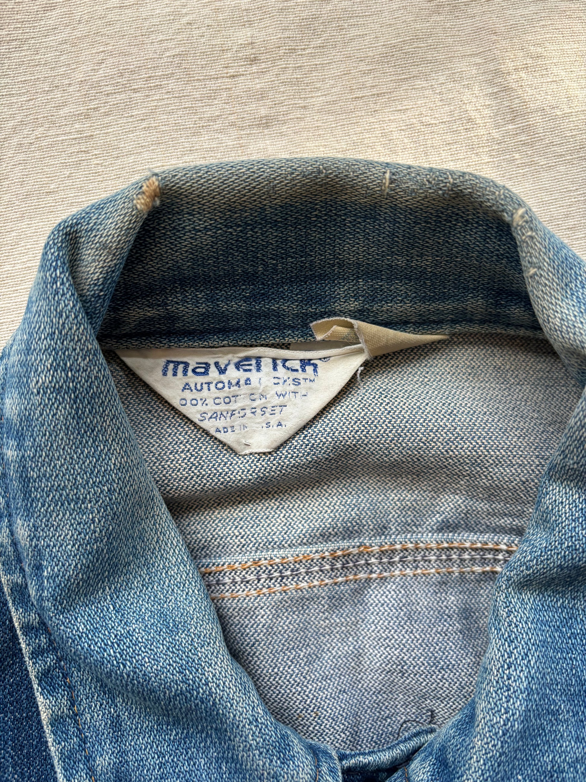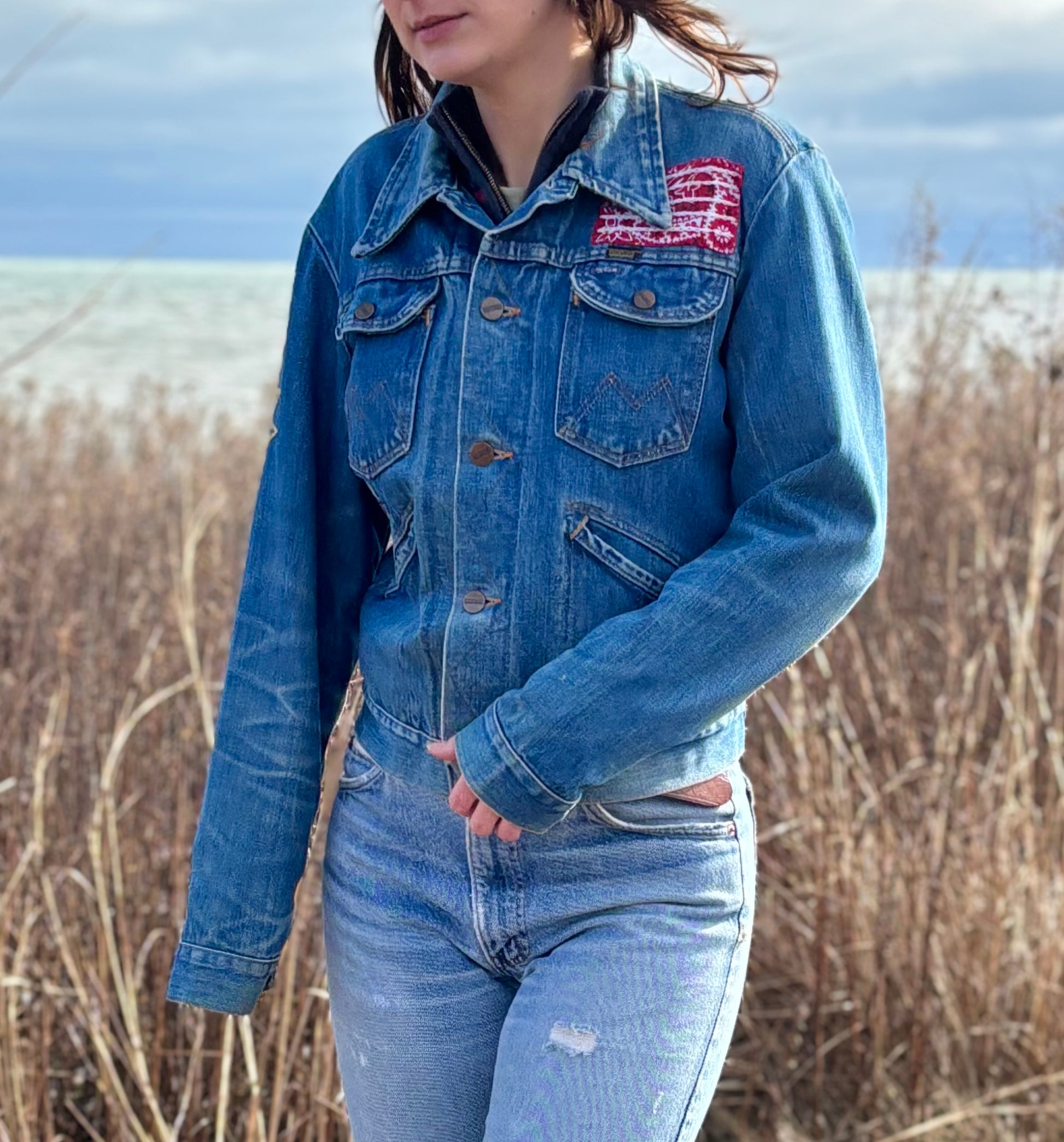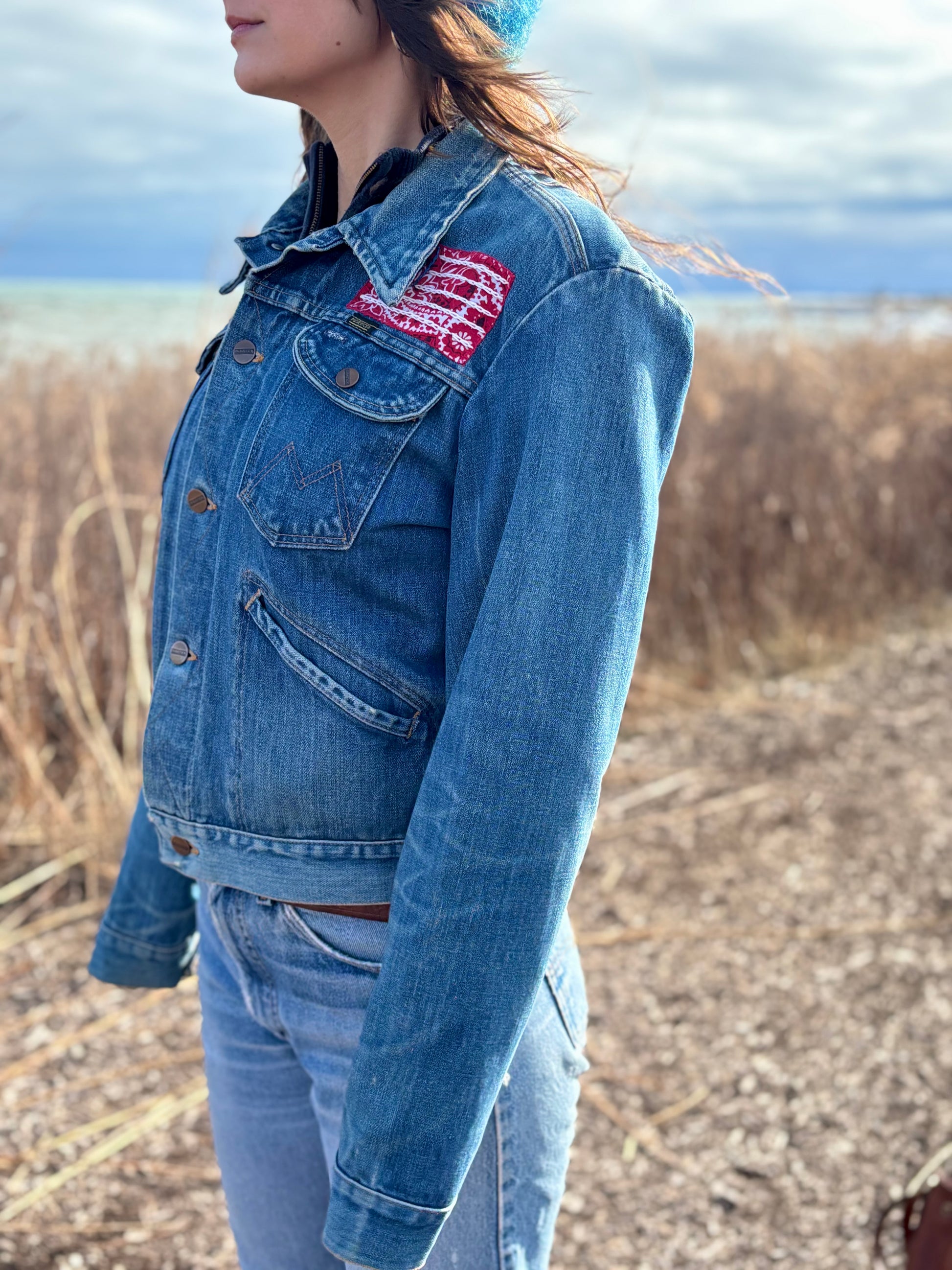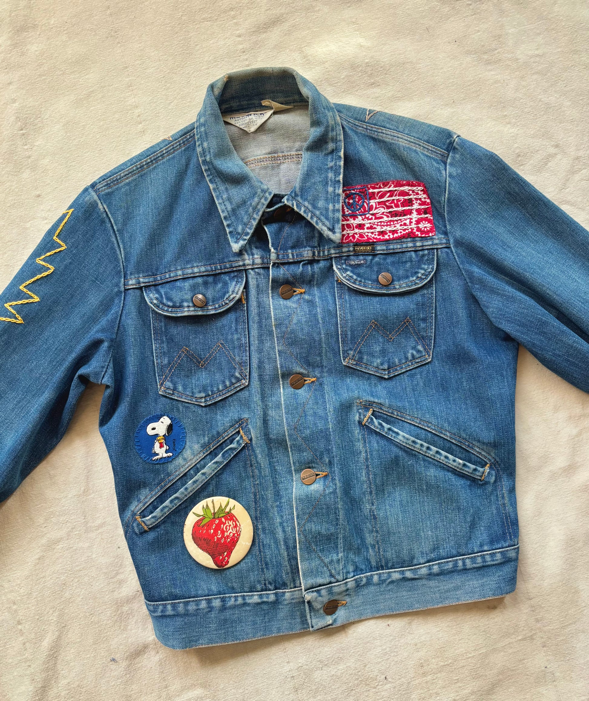 - Appliqué peace flag above left front pocket and denim peace sign on right back panel