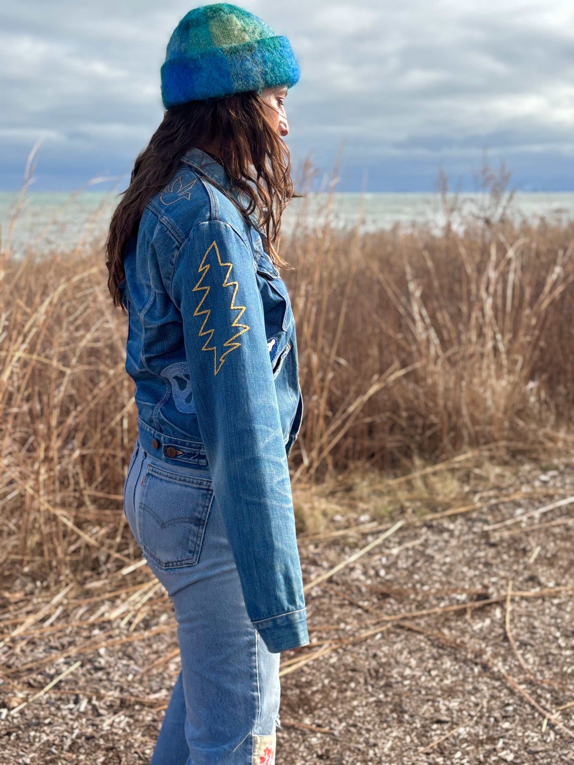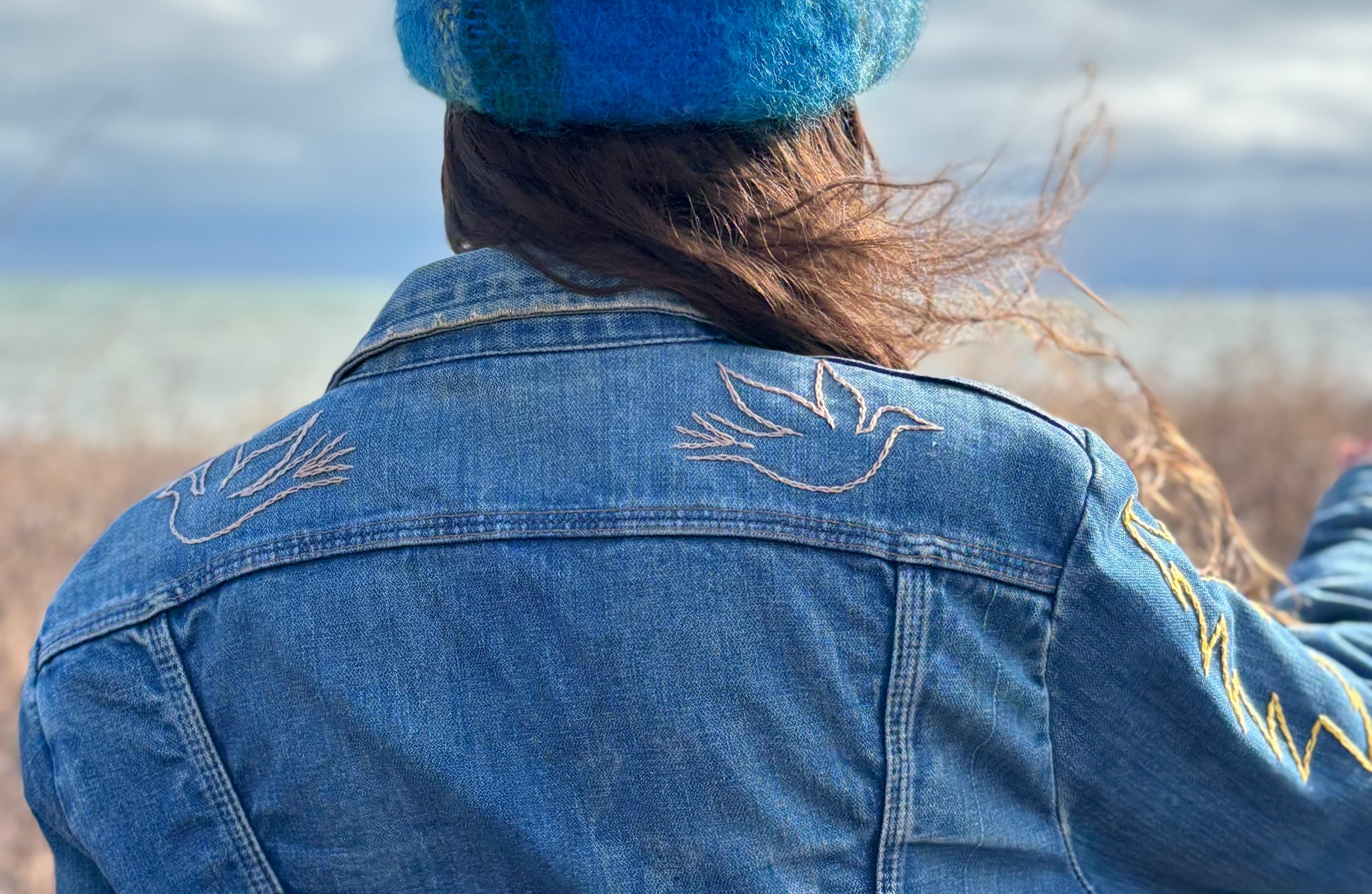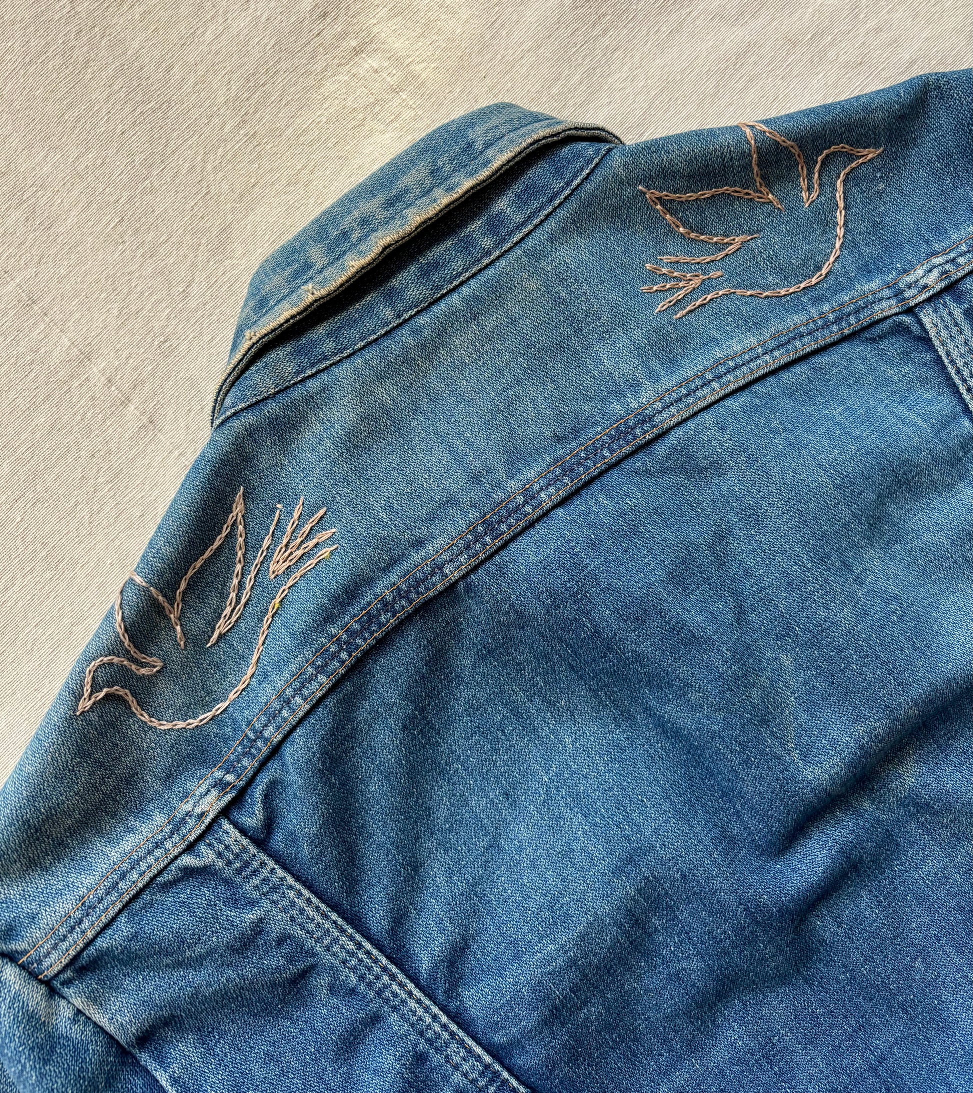 - Hand embroidered lighting bolt on right arm and doves on back shoulders