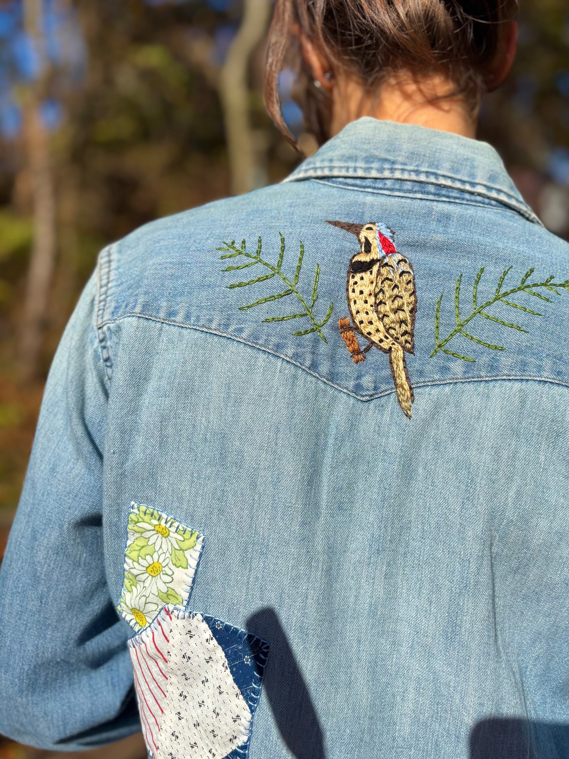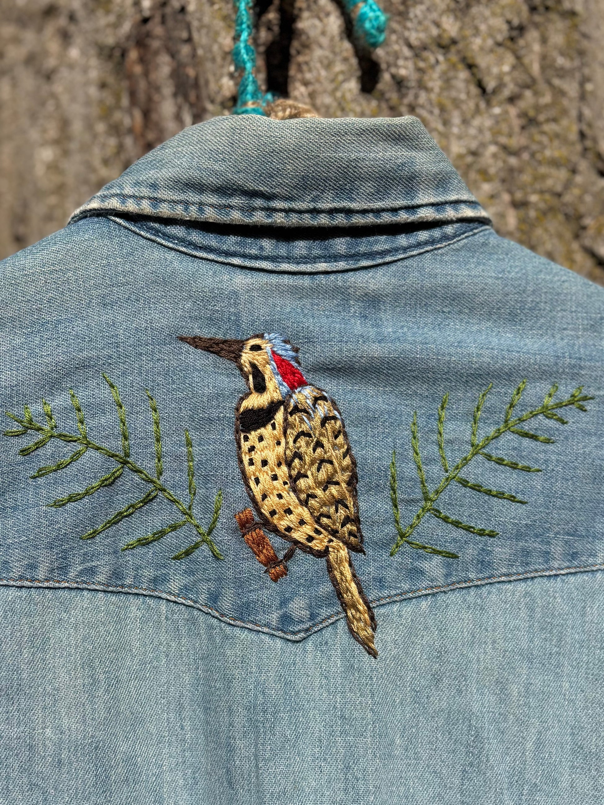 - Hand embroidered Northern Flicker bird nestled in pine branches on back panel