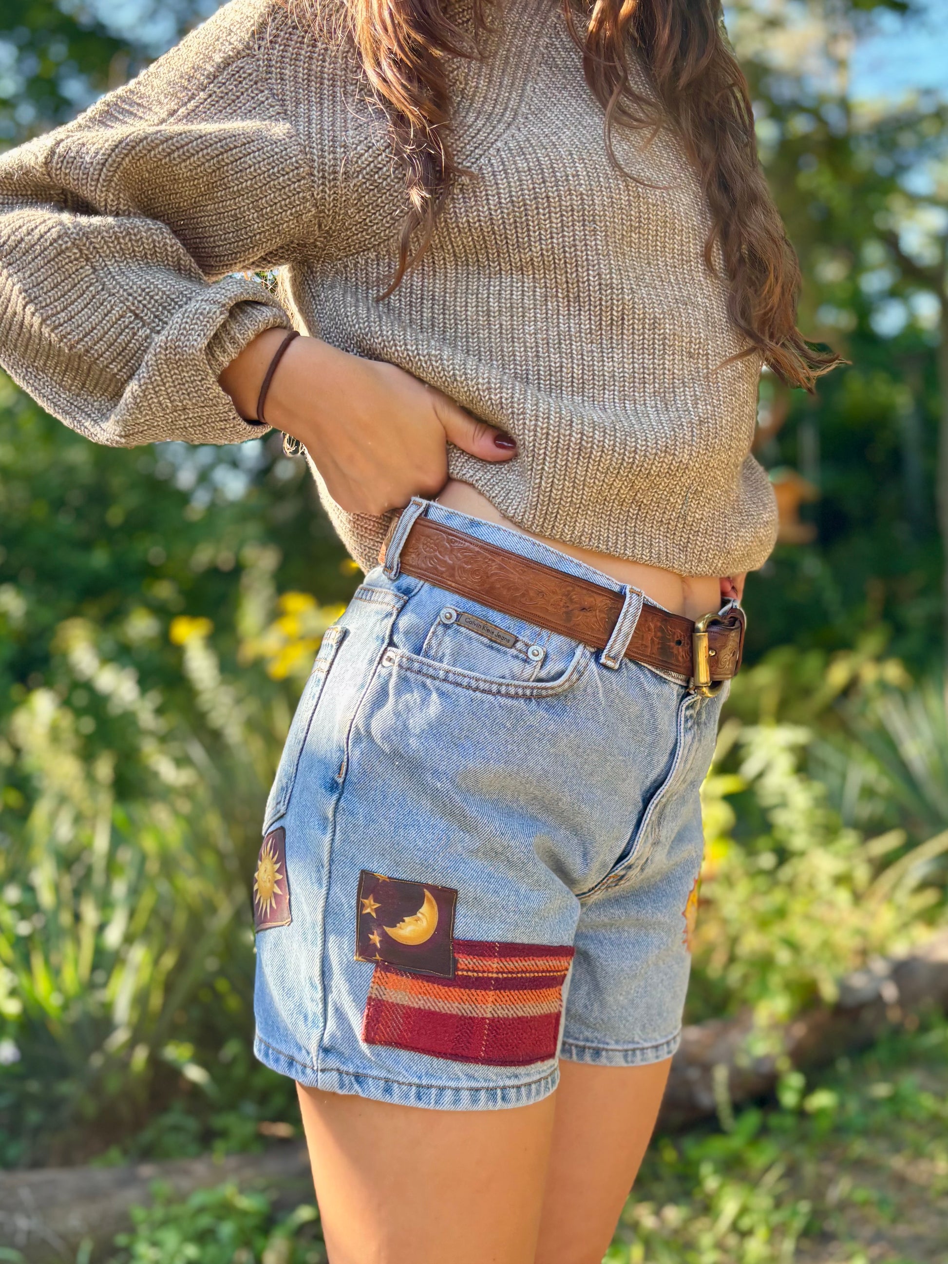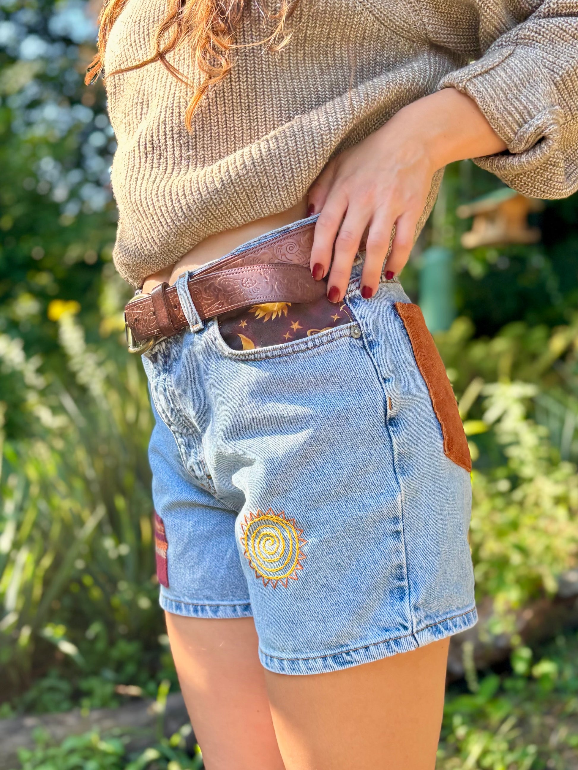 - Gold sun and moon fabric on front left pocket and patches throughout