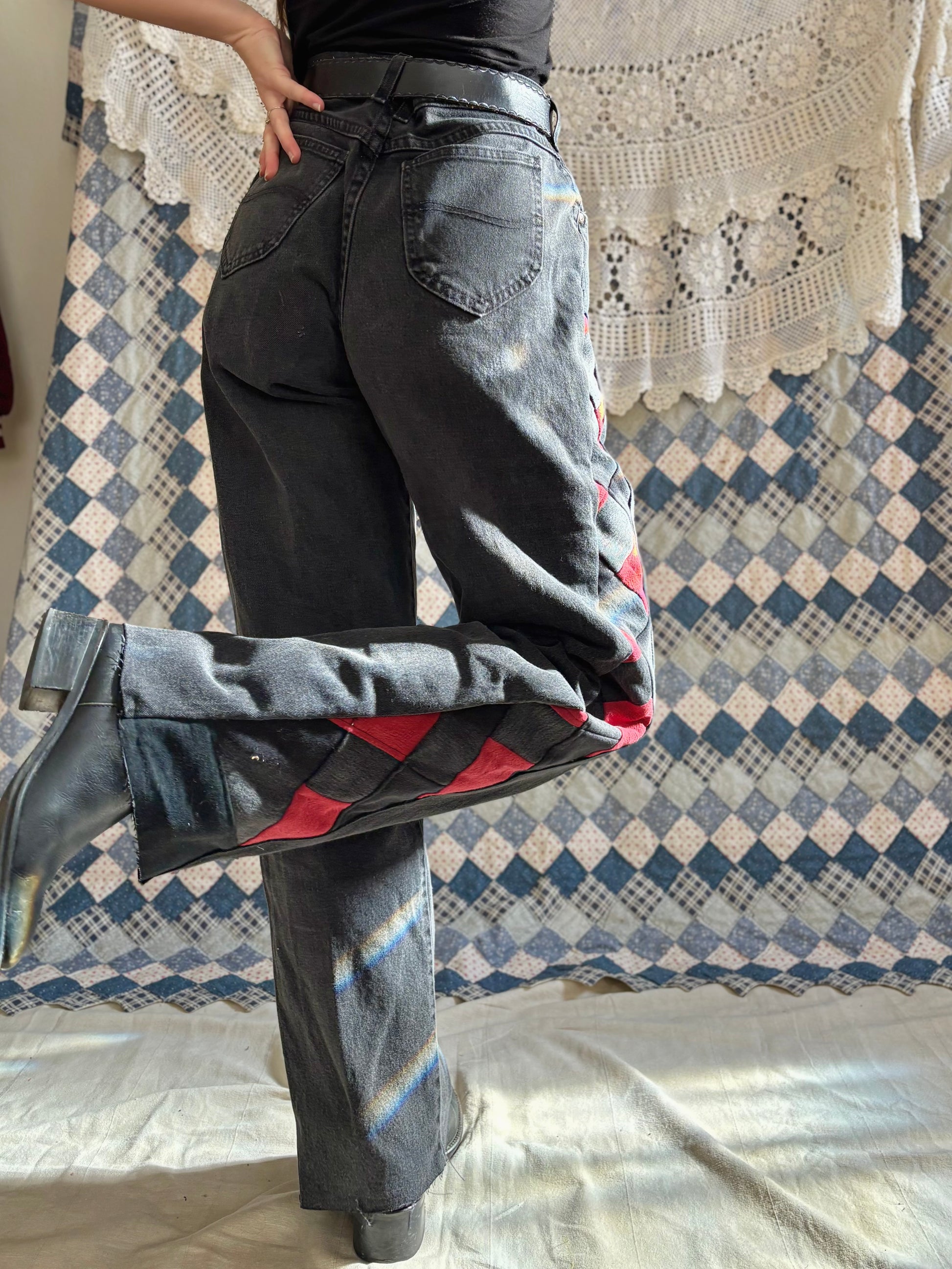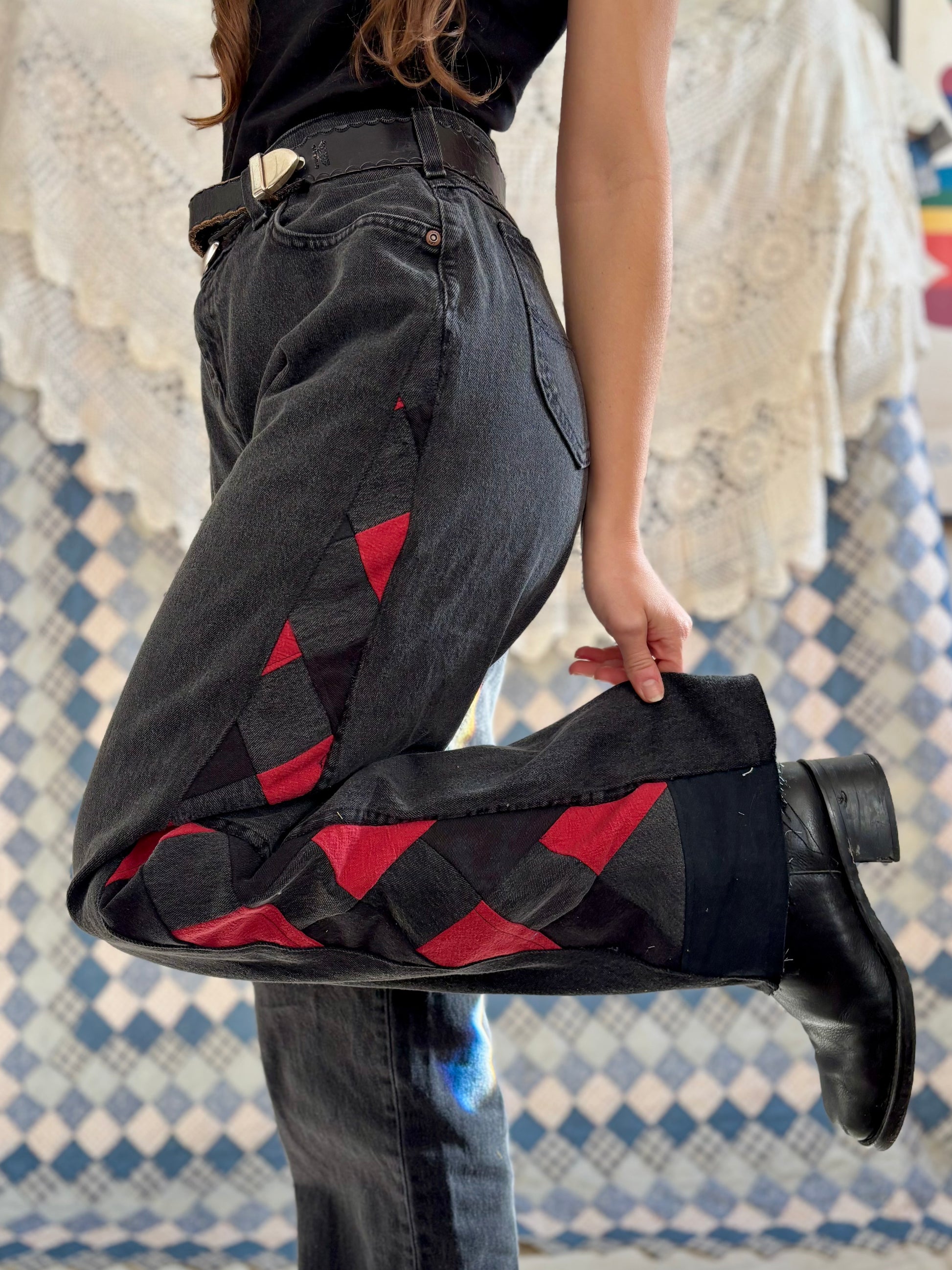 - Quilt diamond panel on side legs, constructed out of black and red salvaged denim fabric