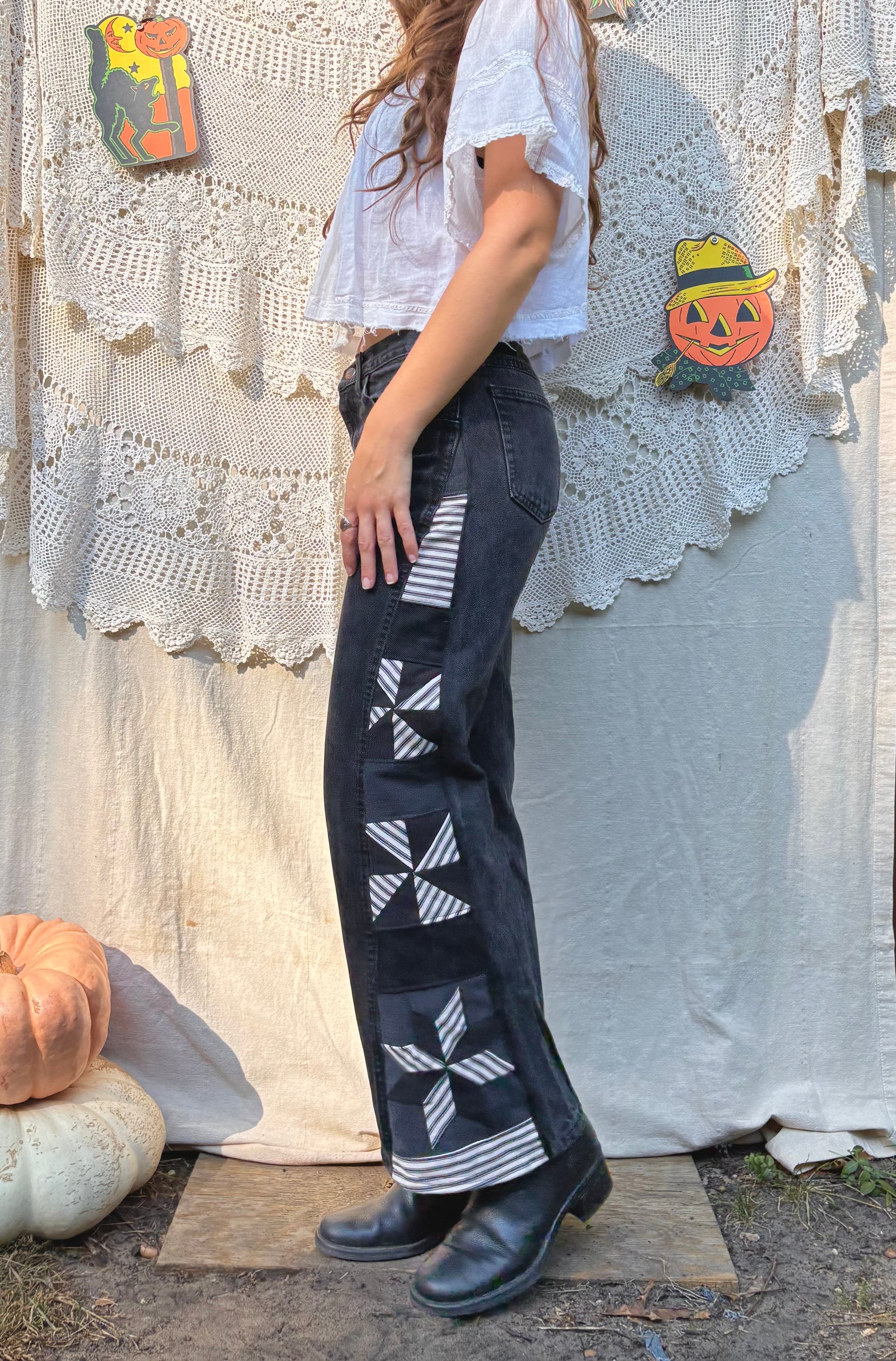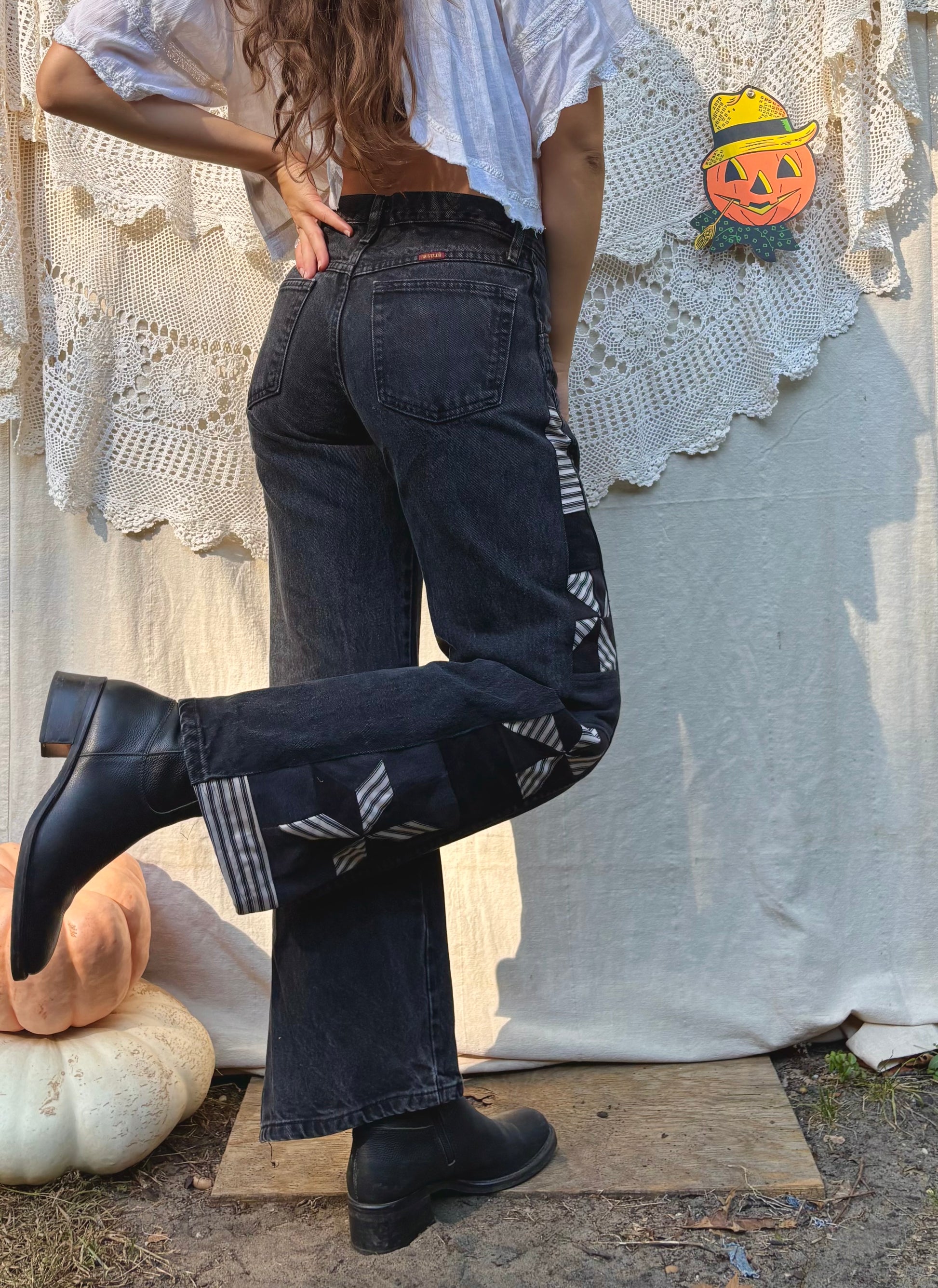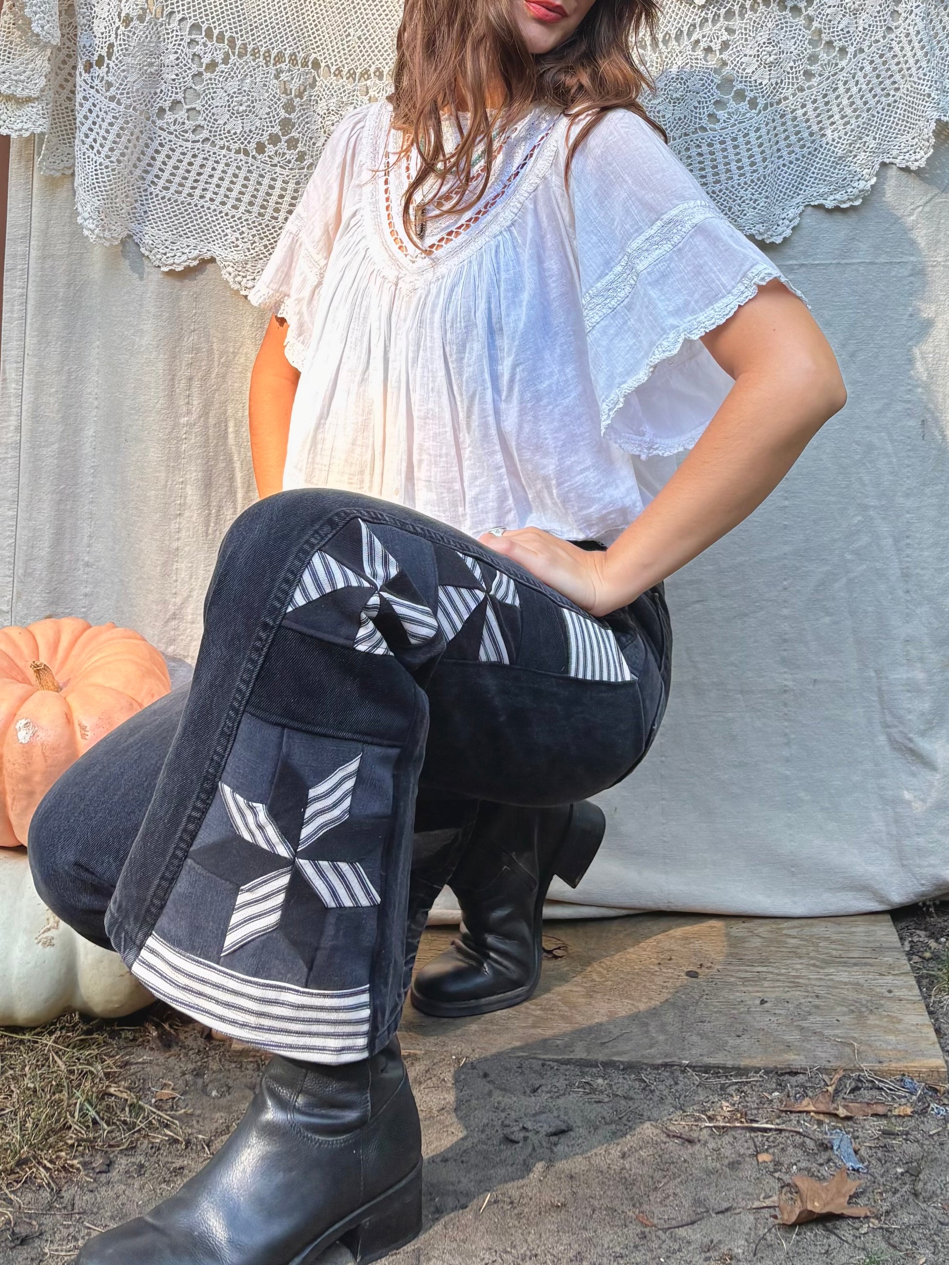 - Quilt star & pinwheel panel on side legs, constructed out of white stripe fabric and black denim fabric