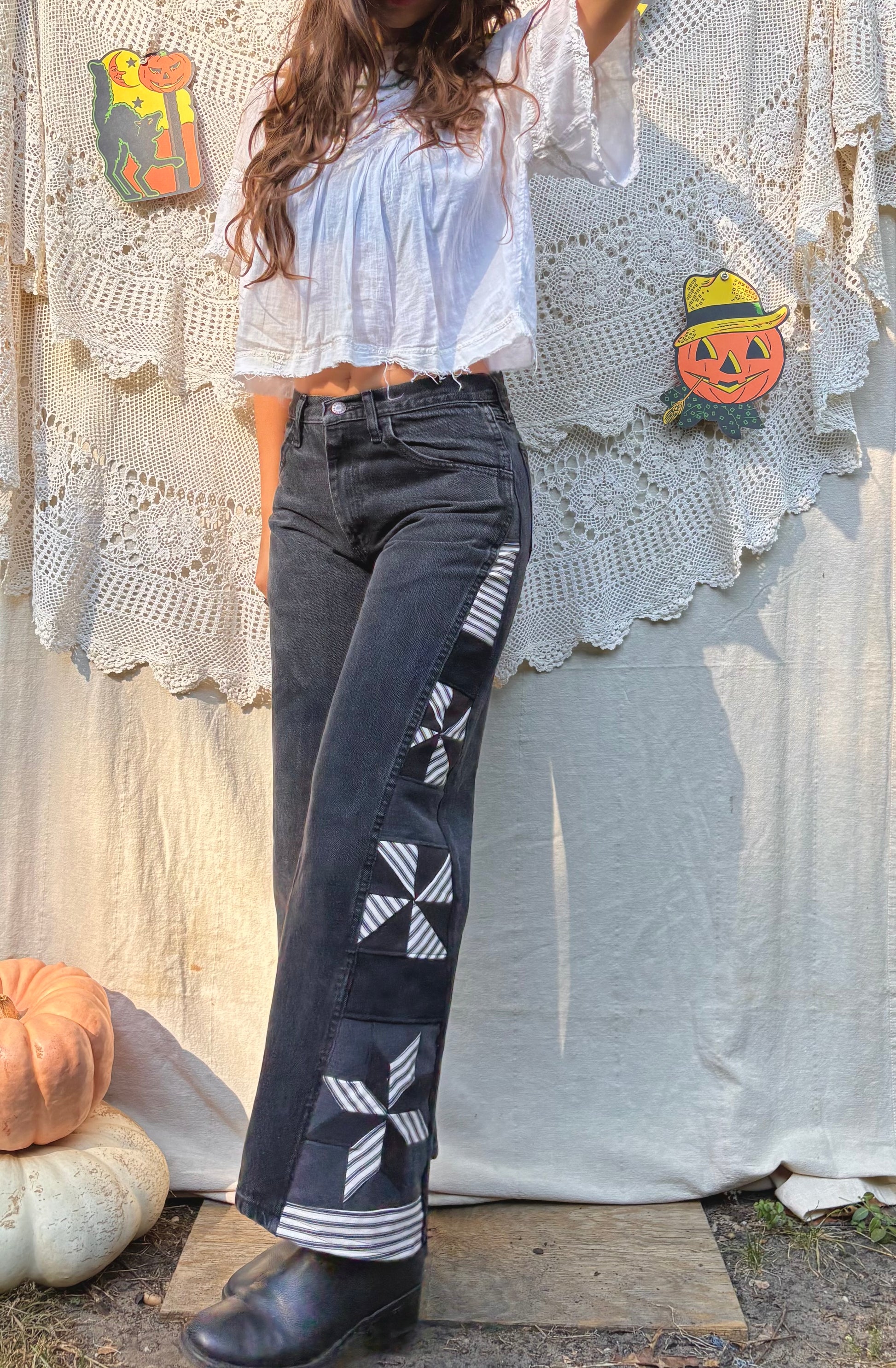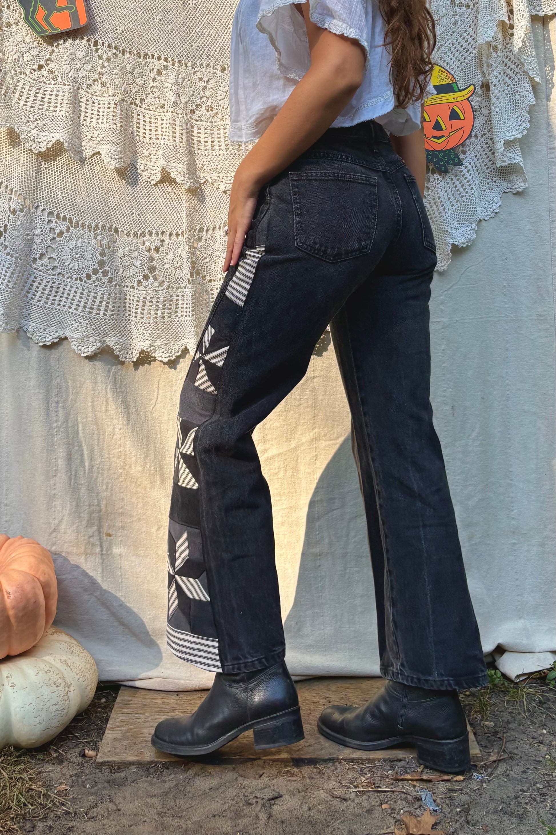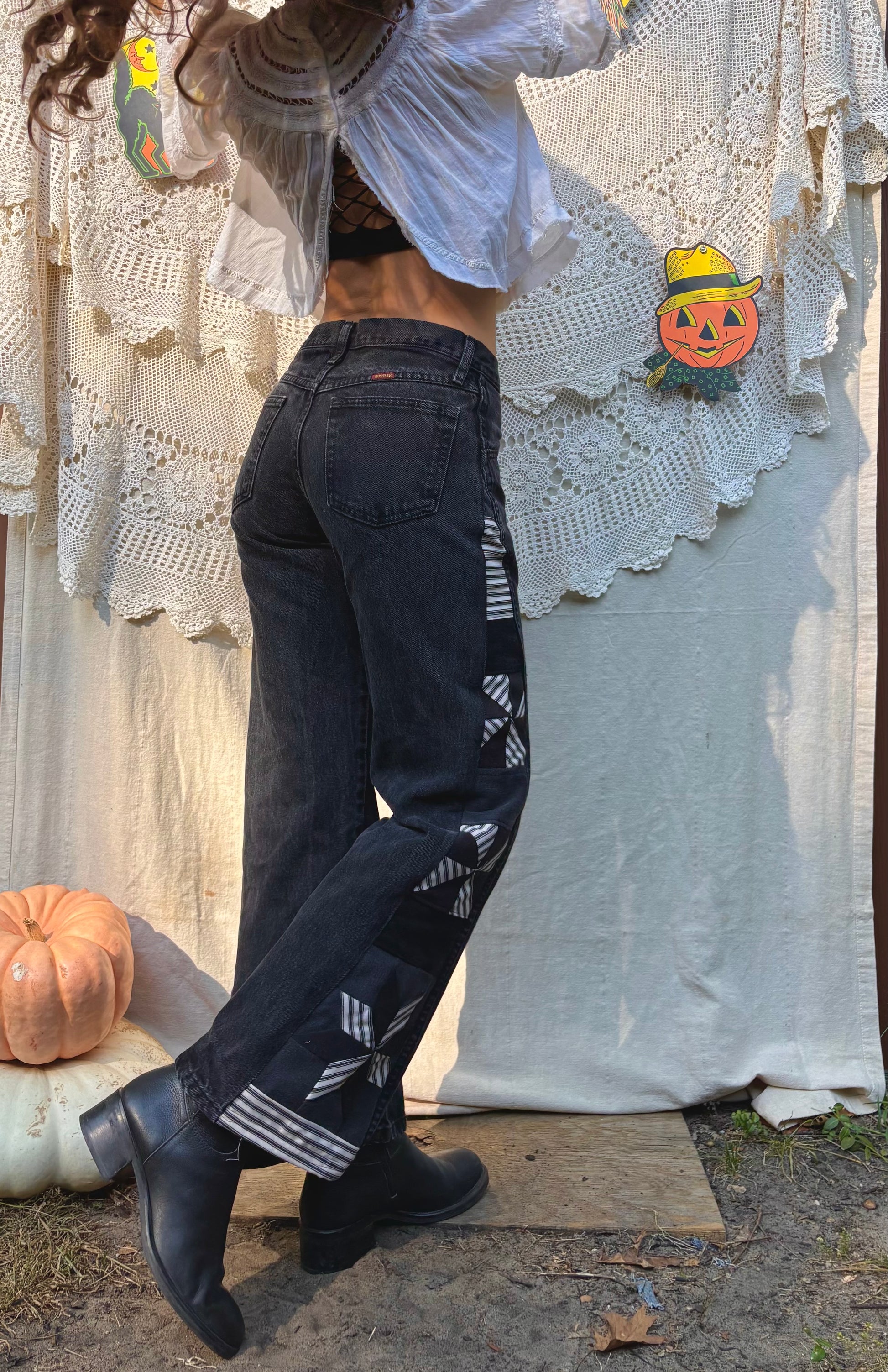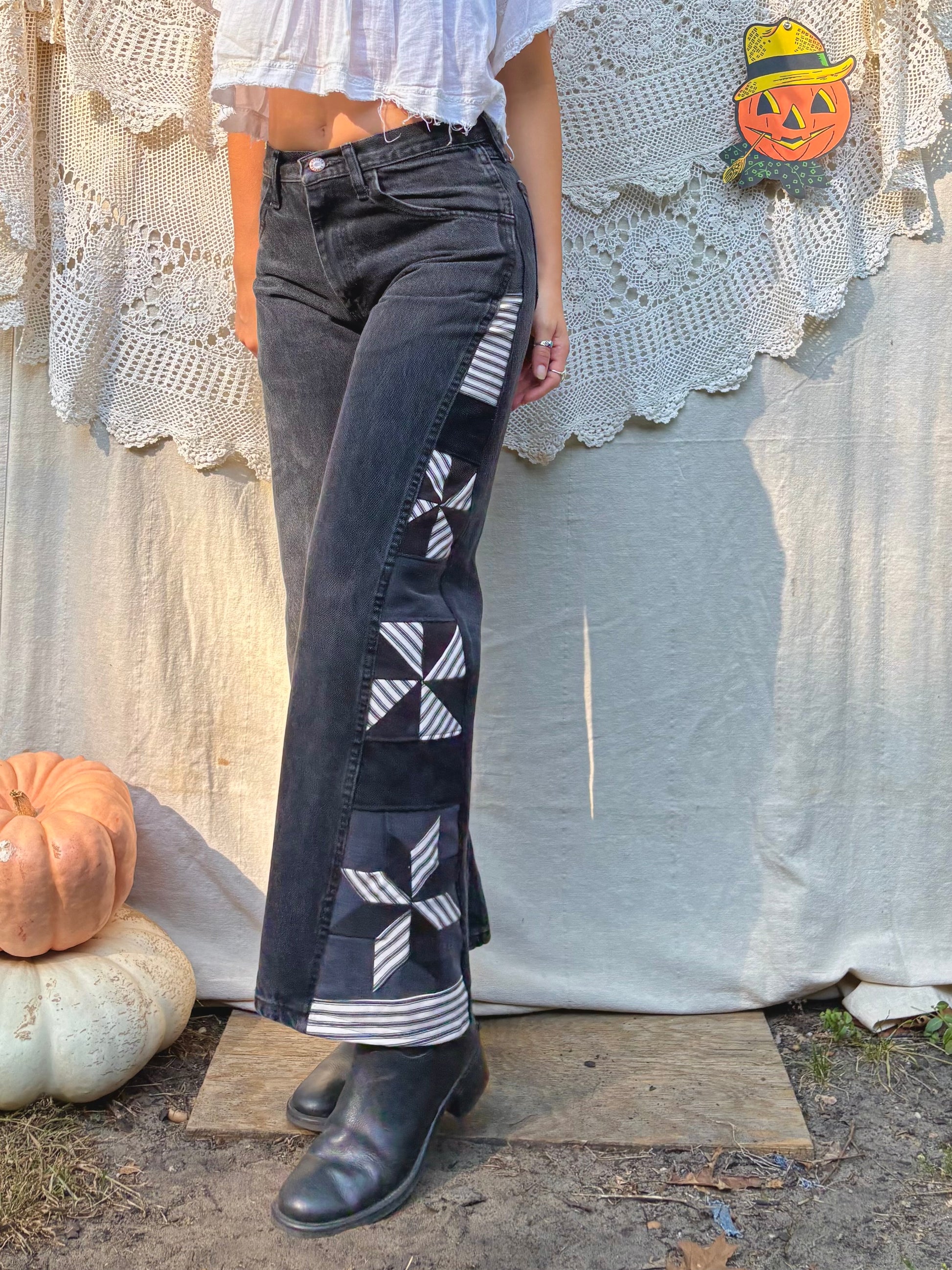 - Quilt star & pinwheel panel on side legs, constructed out of white stripe fabric and black denim fabric