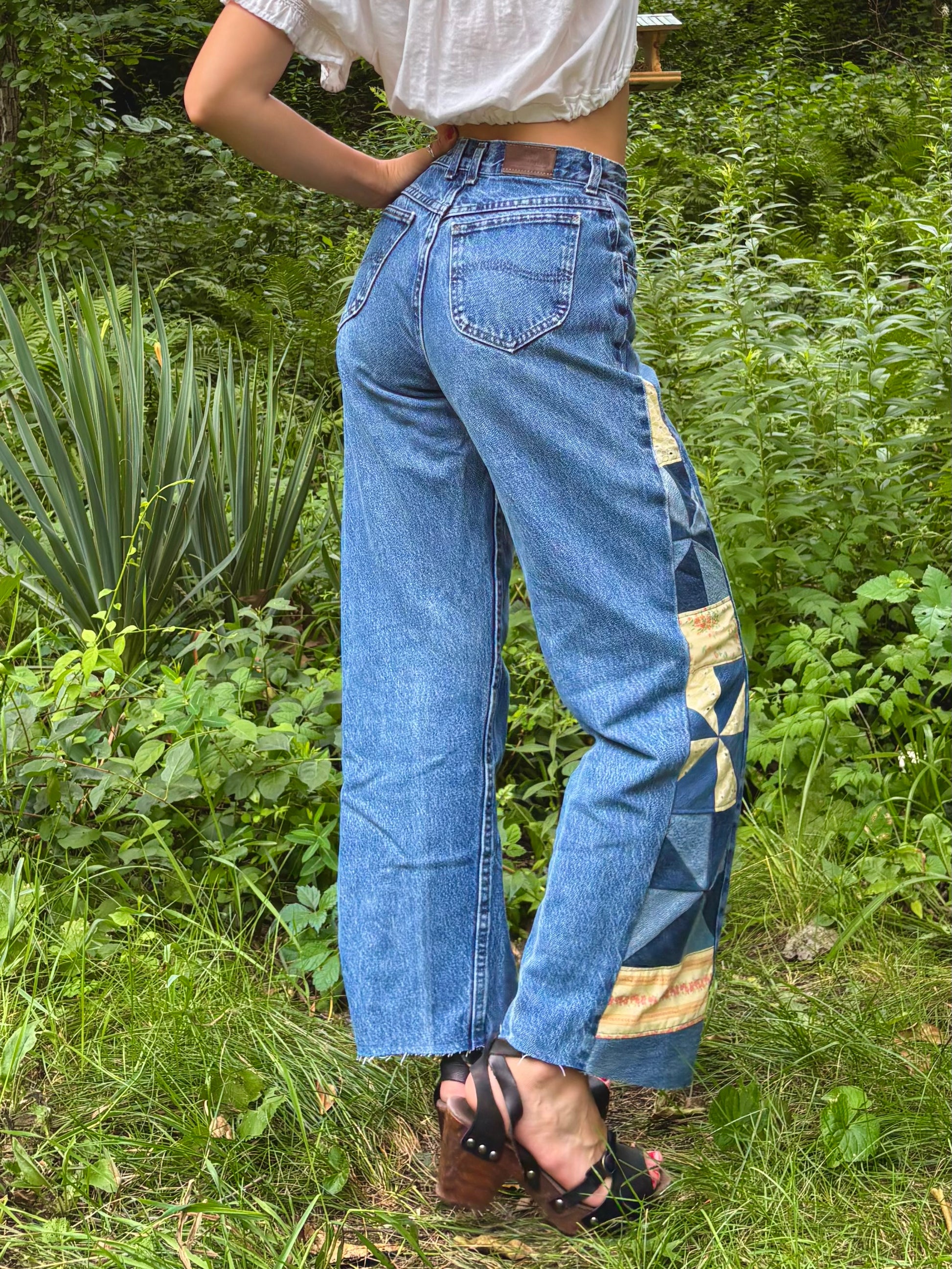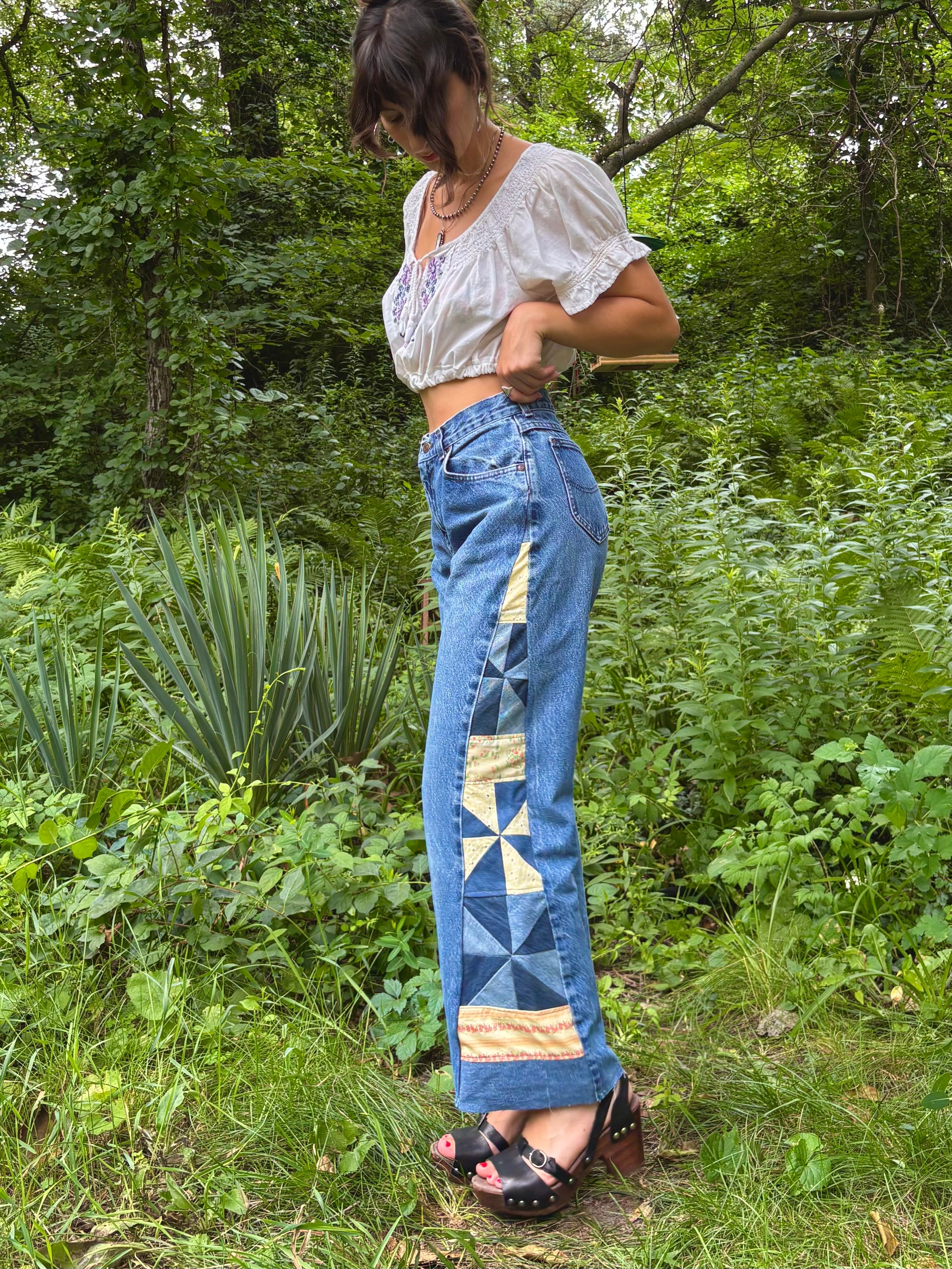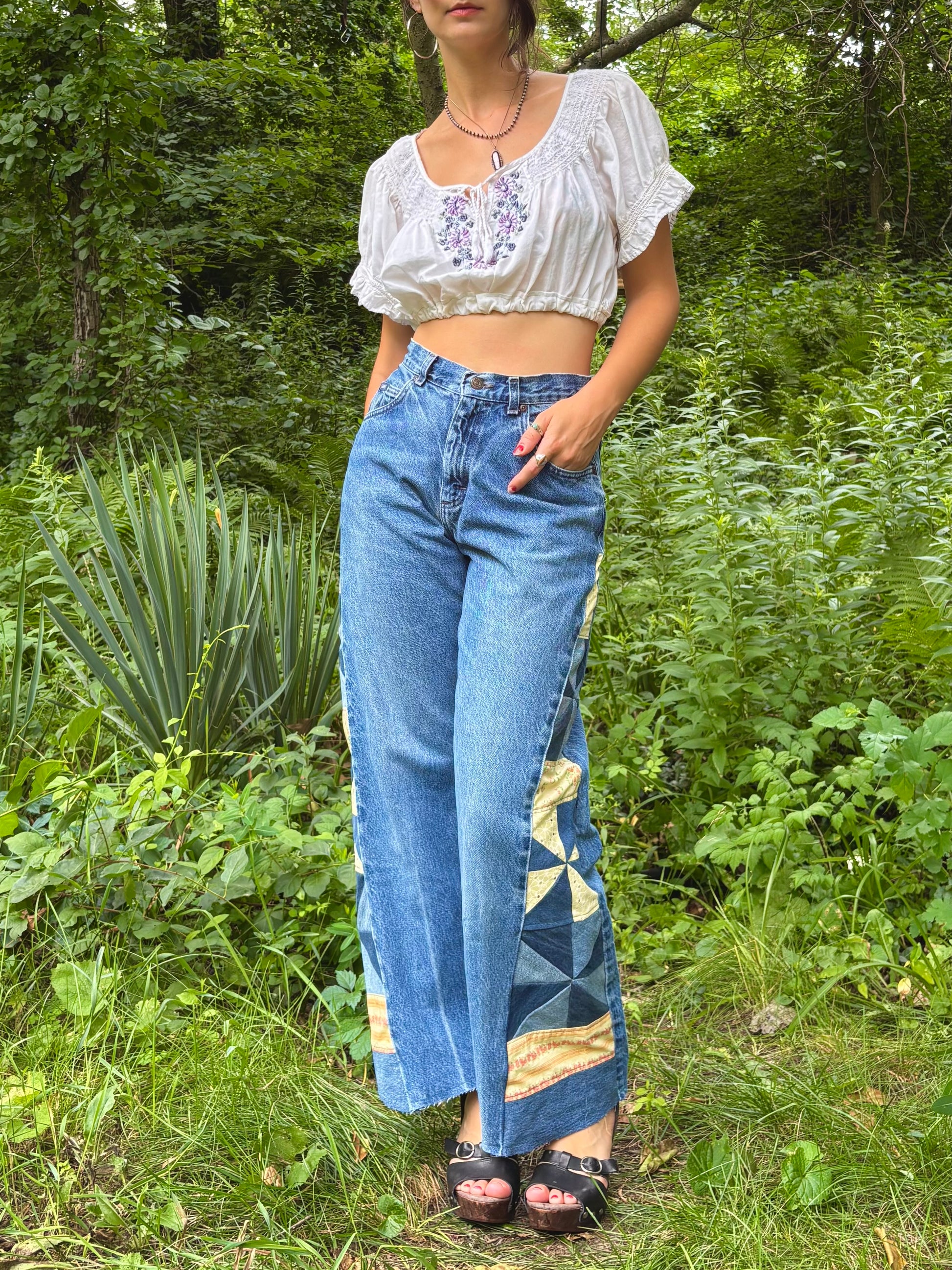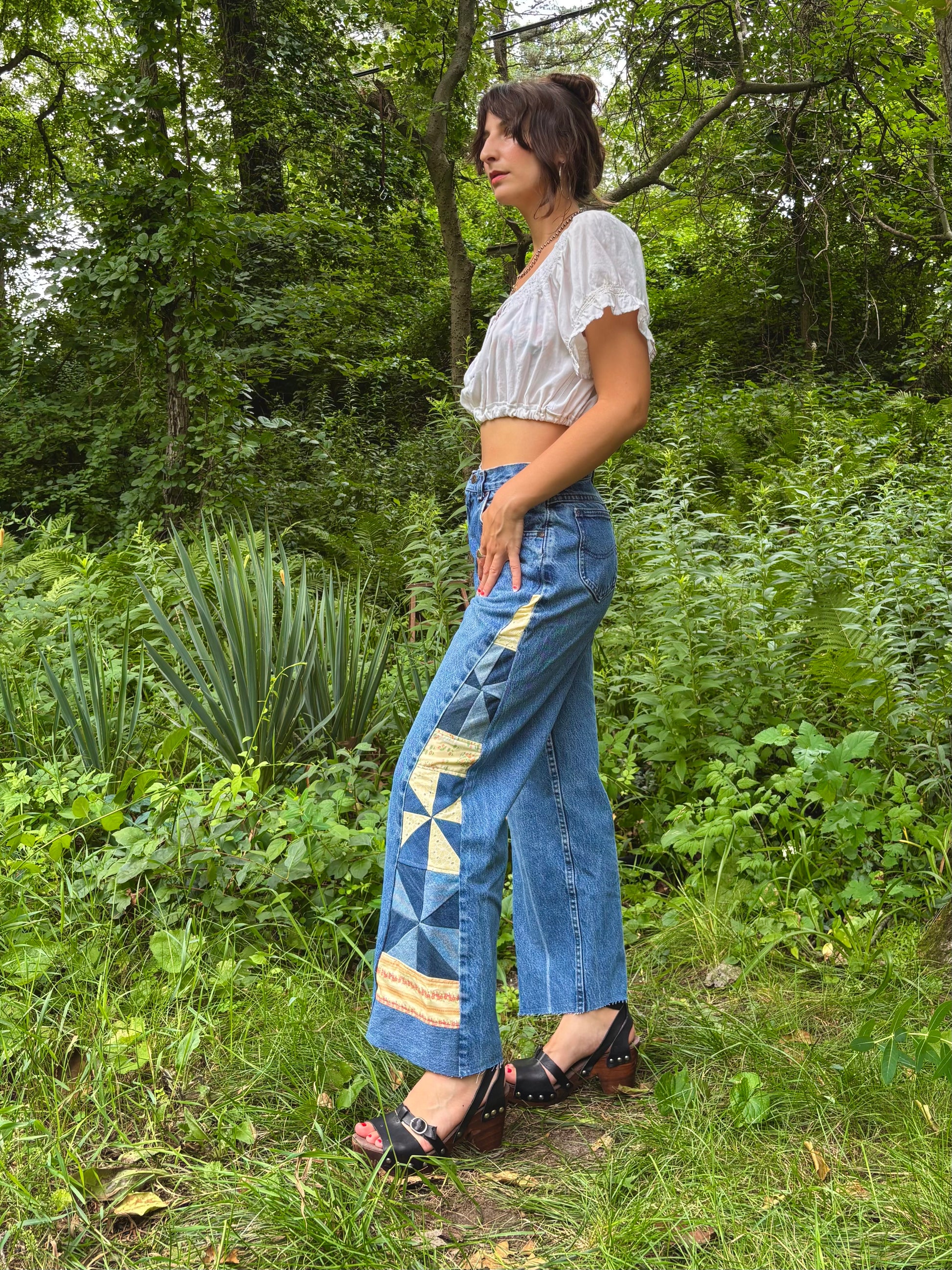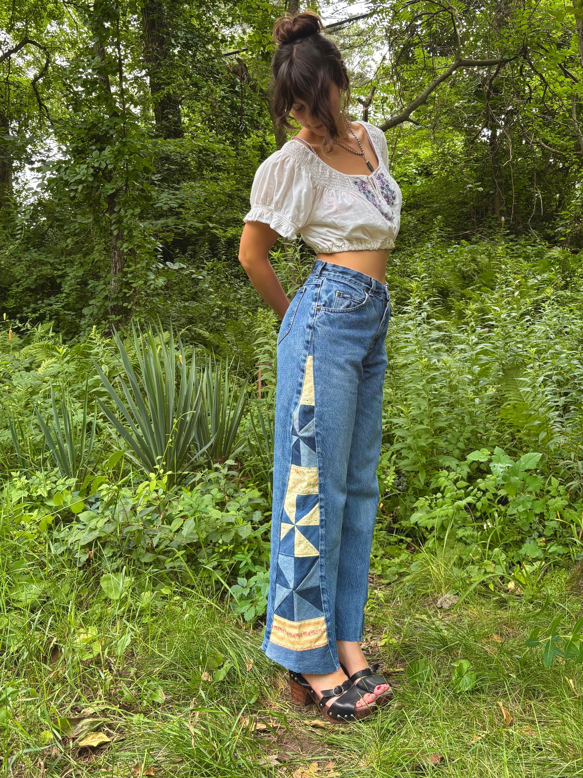 - Quilt pinwheel panel on side legs, constructed out of vintage yellow eyelet and floral cotton and blue denim fabric