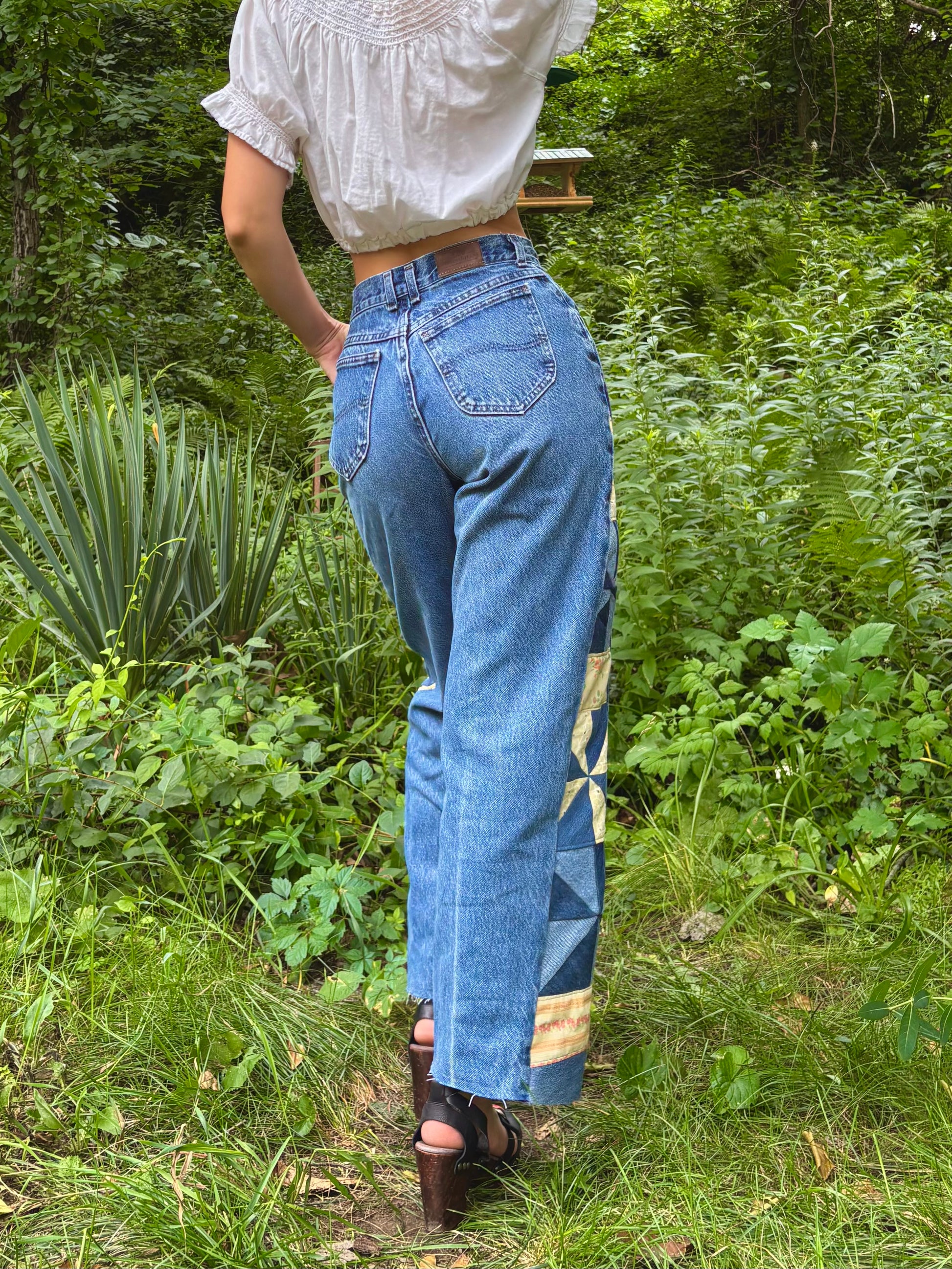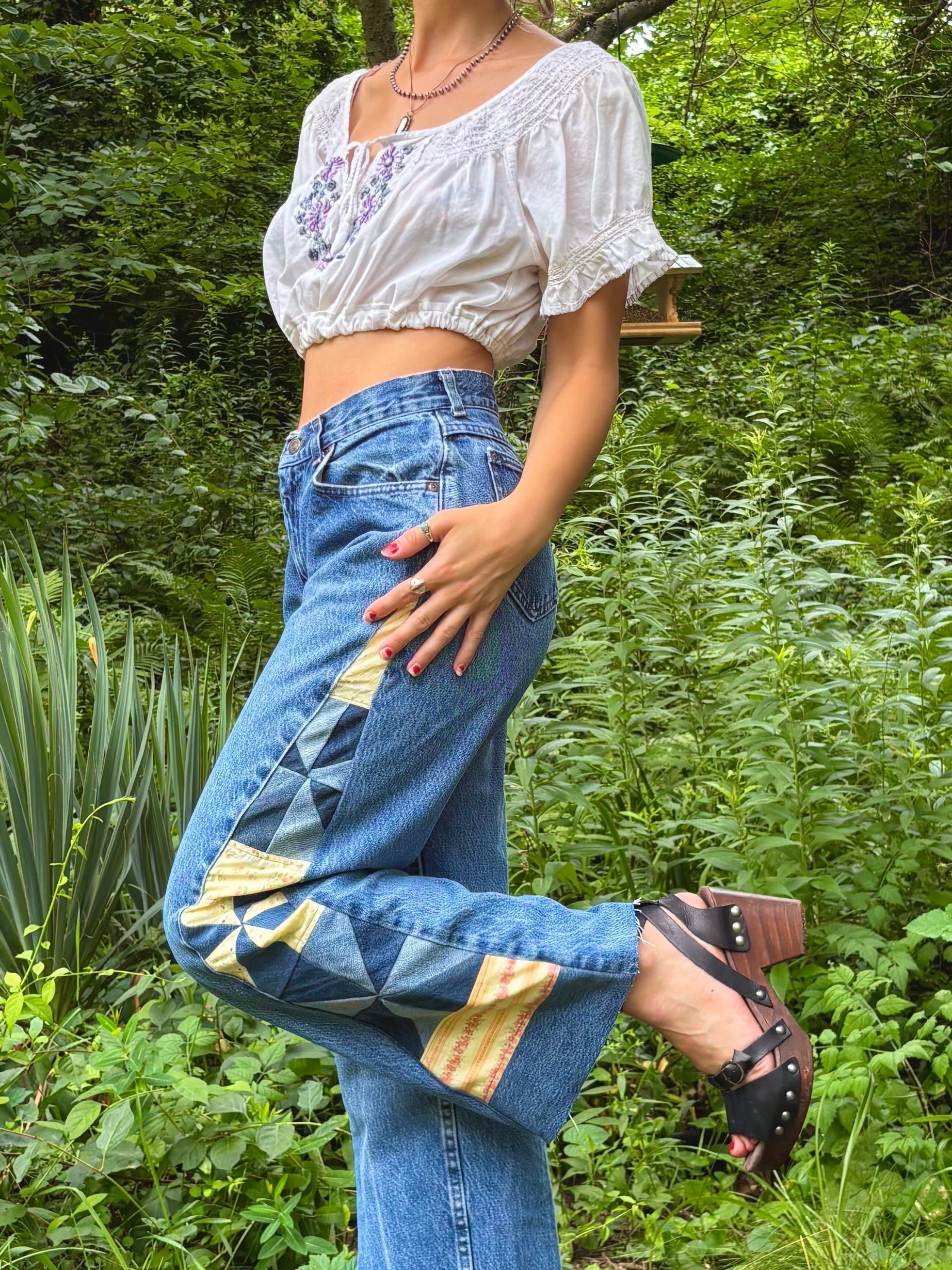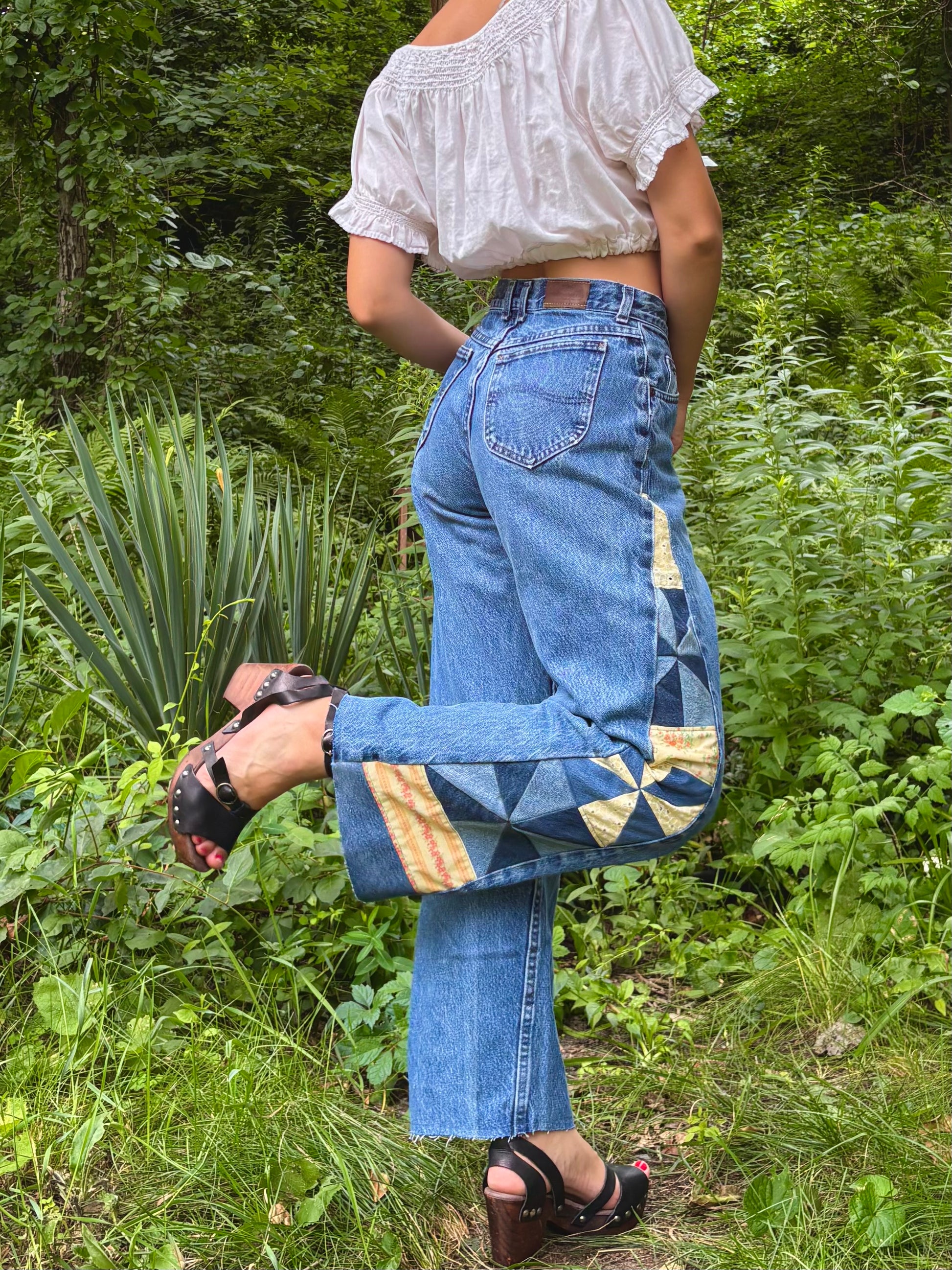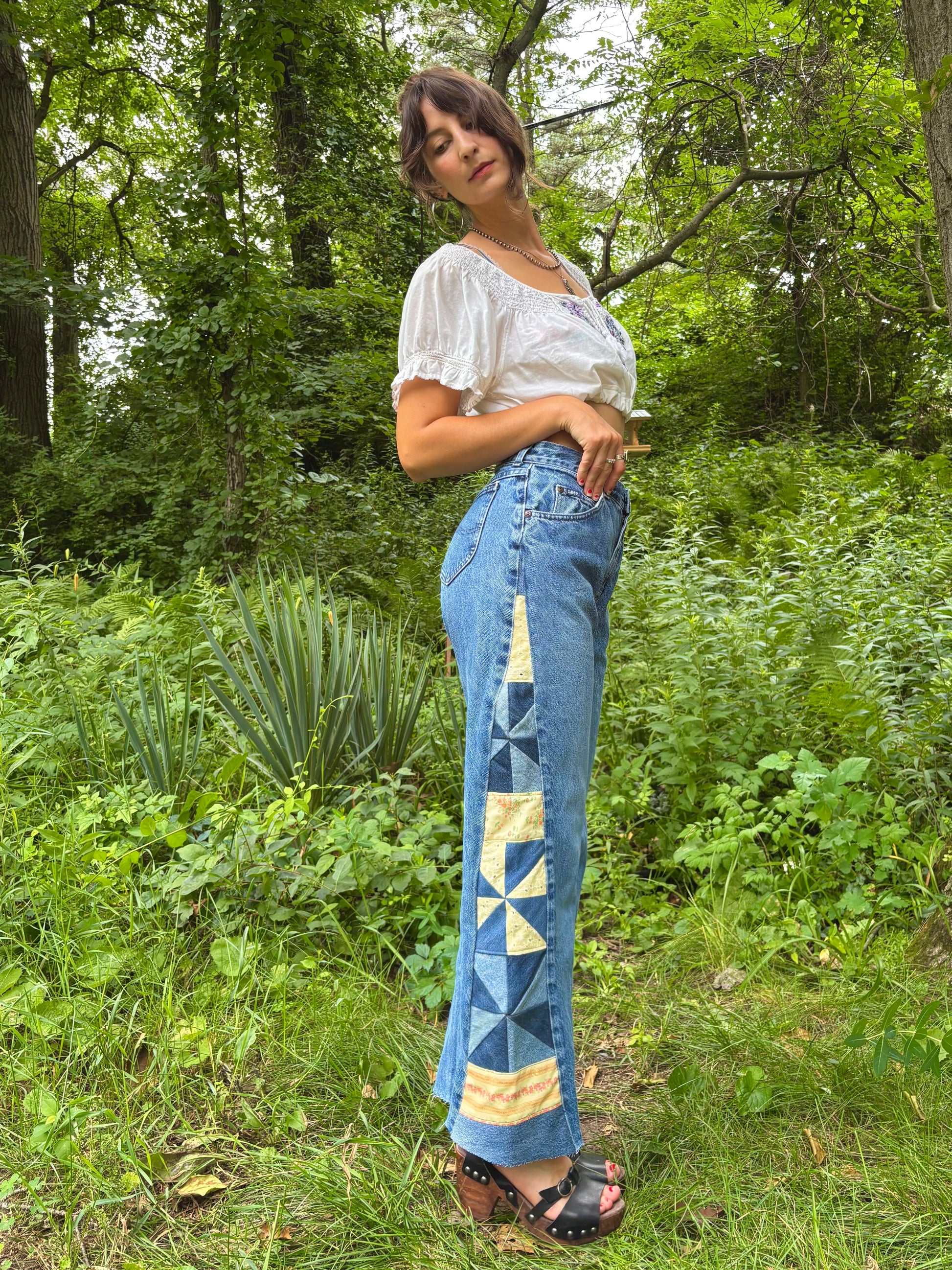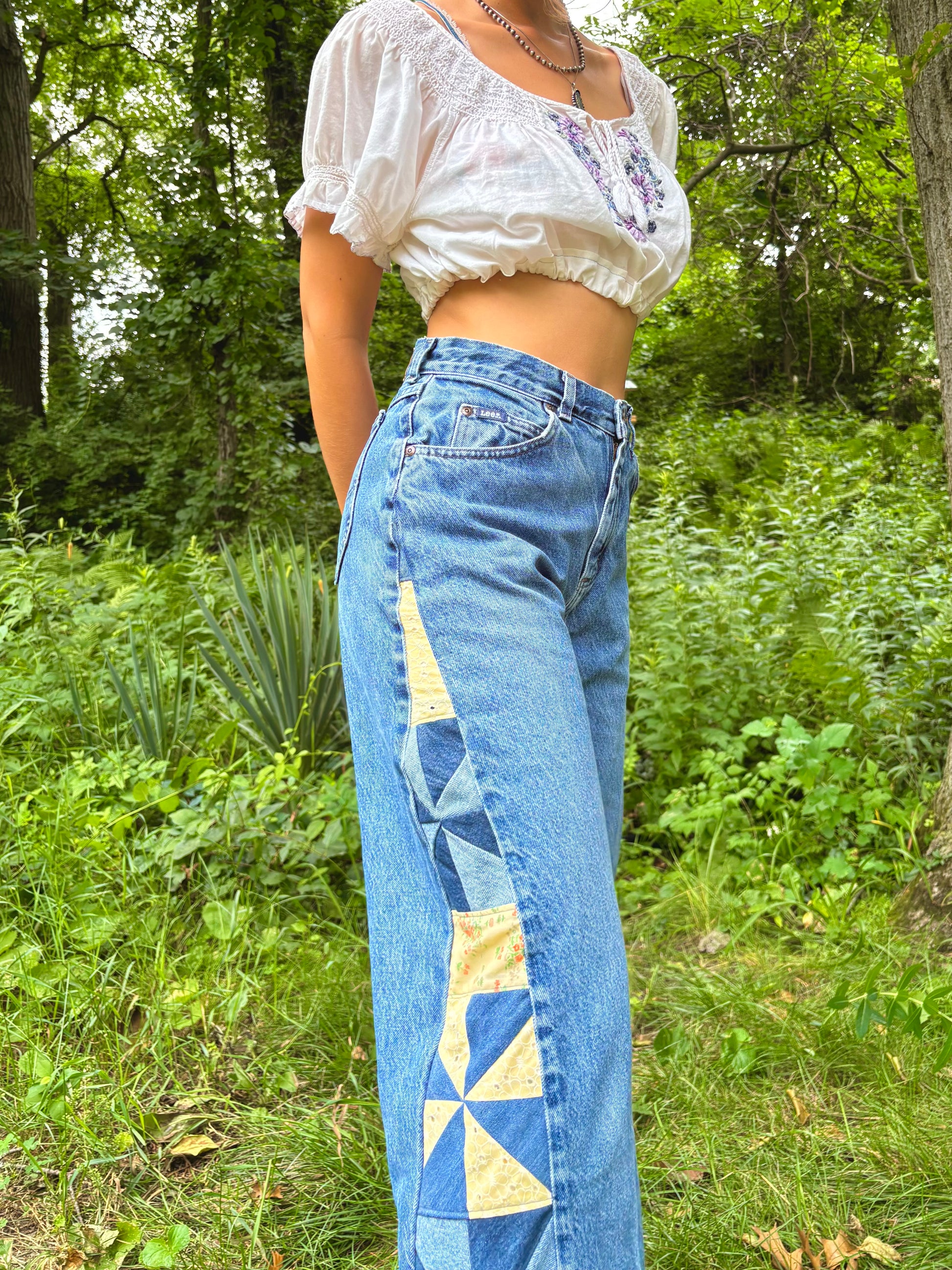 - Quilt pinwheel panel on side legs, constructed out of vintage yellow eyelet and floral cotton and blue denim fabric