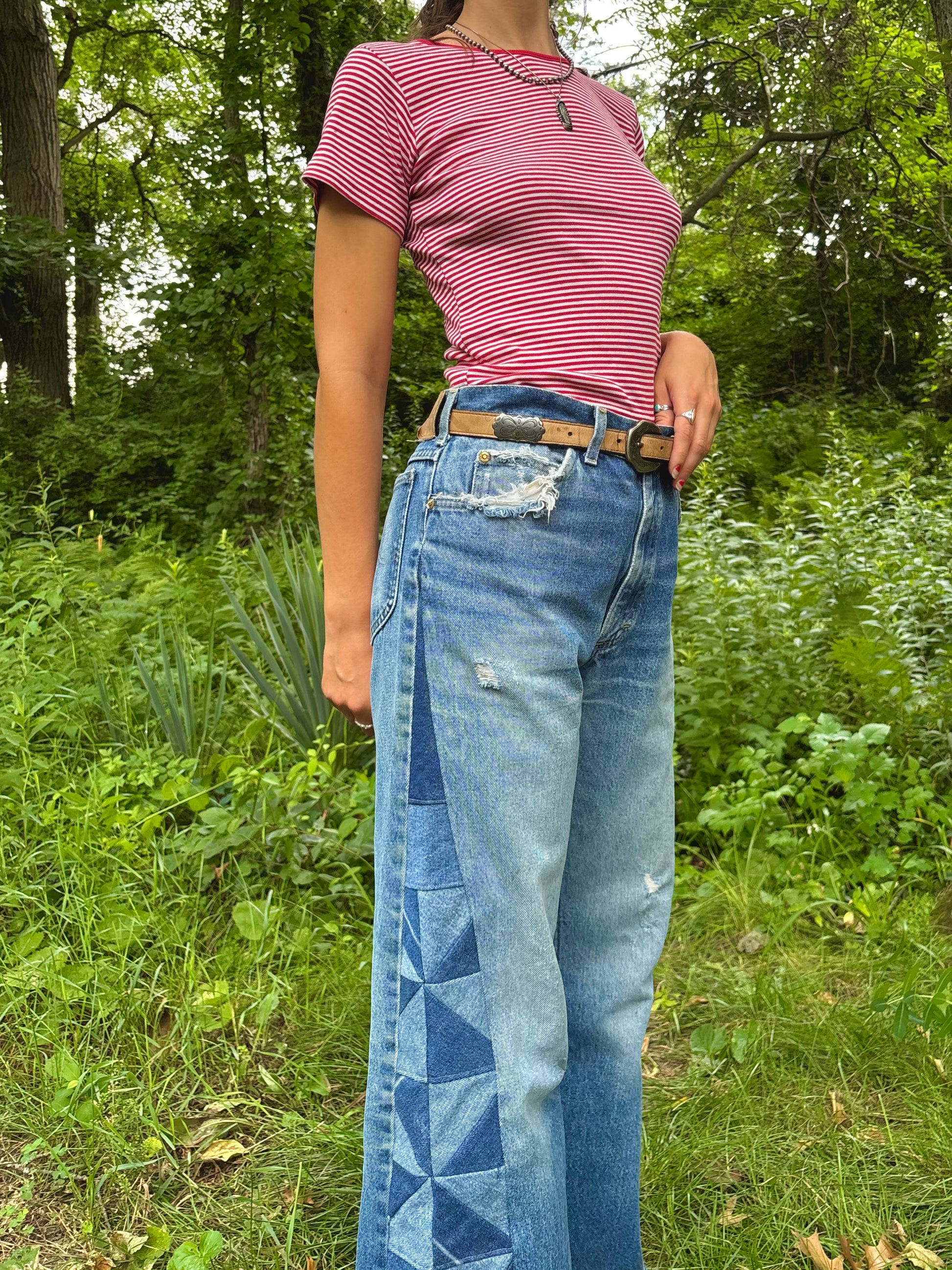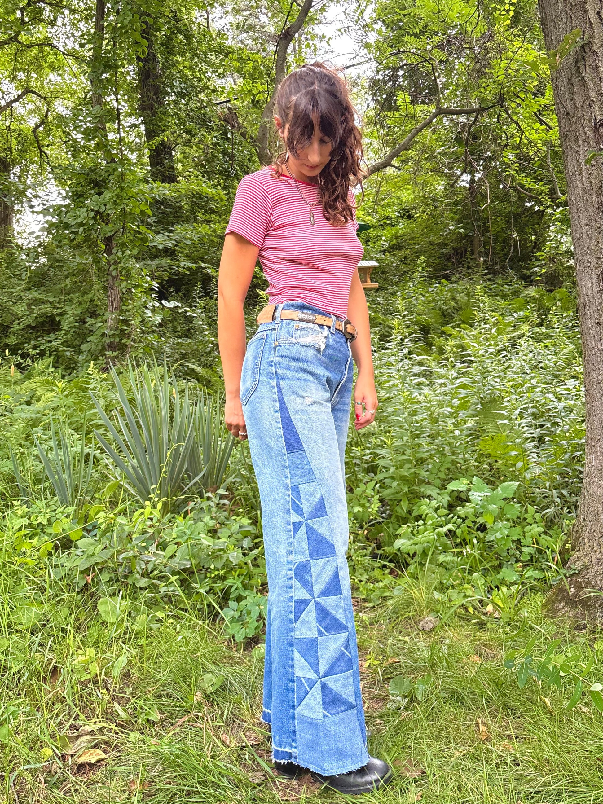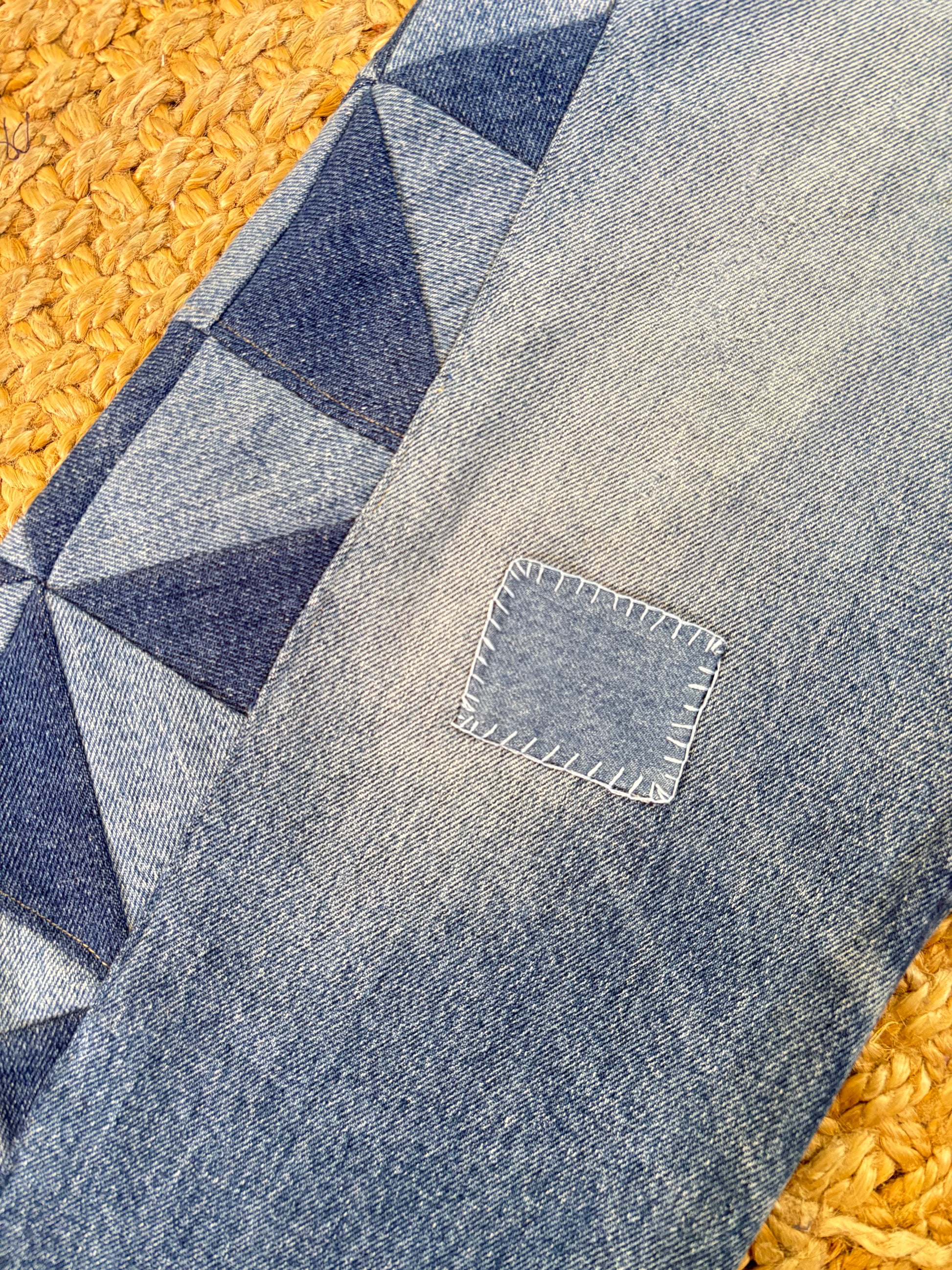 - Quilt pinwheel panel on side legs, salvaged blue denim fabric