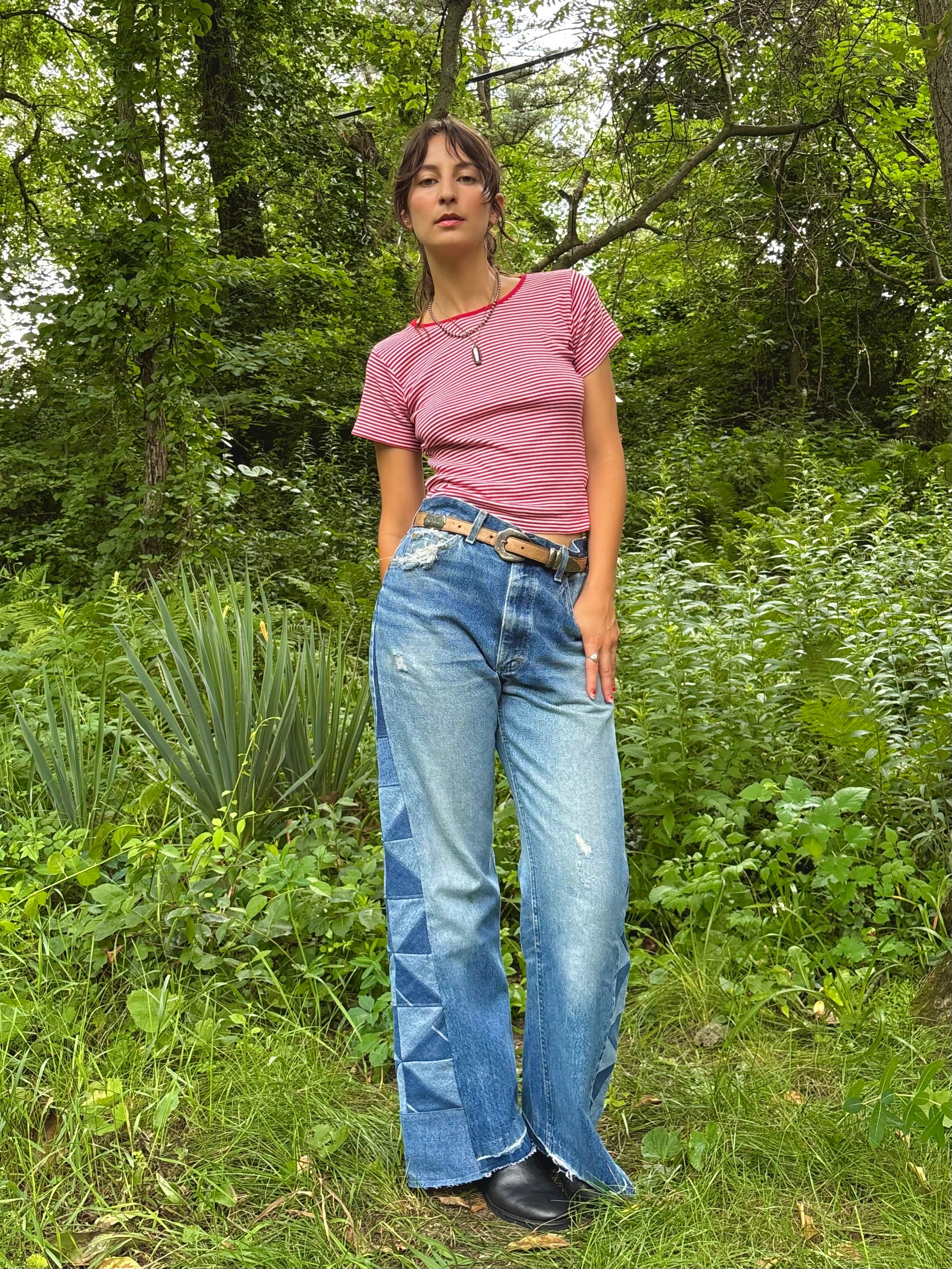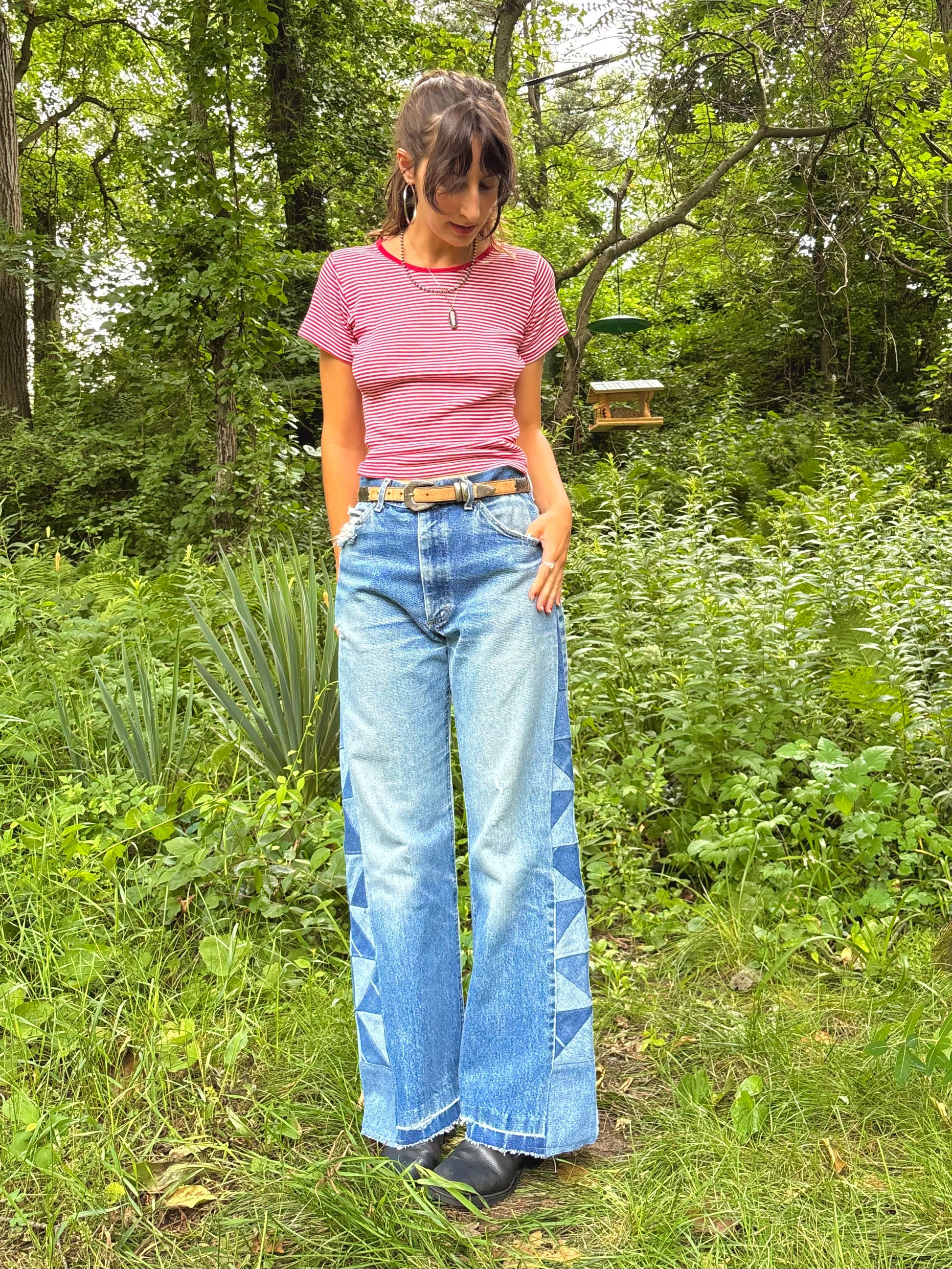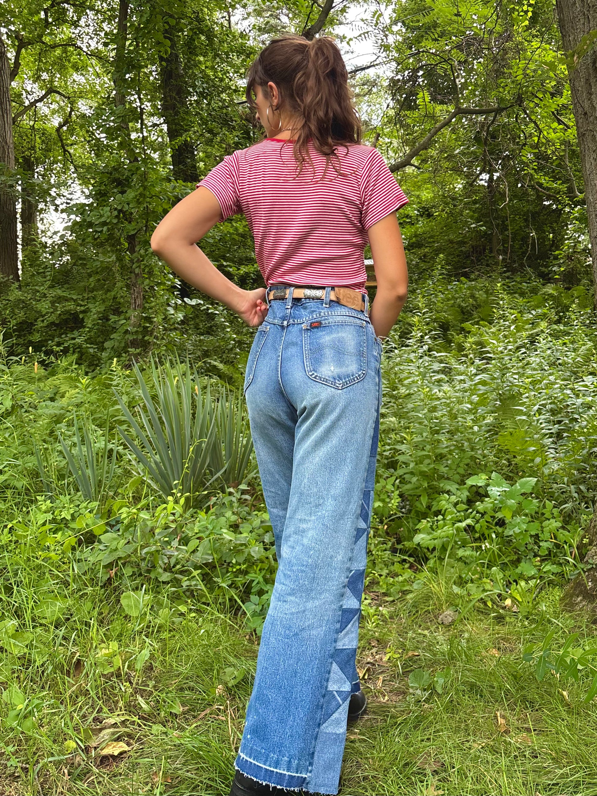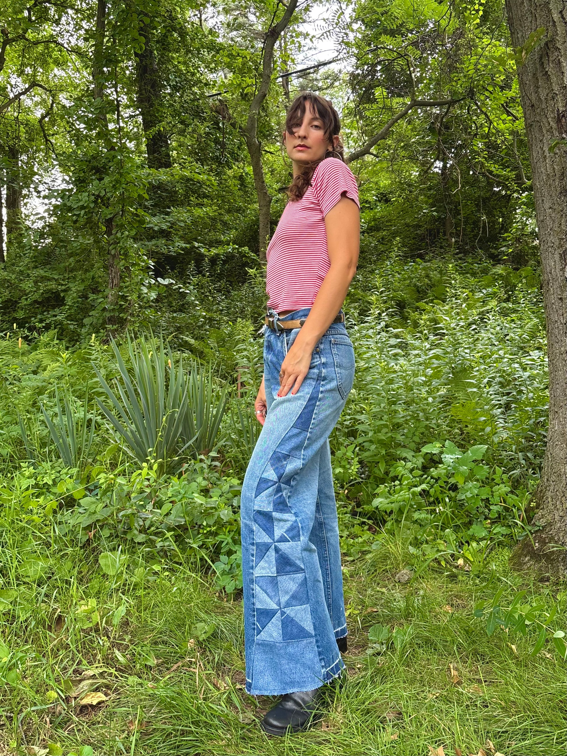 - Quilt pinwheel panel on side legs, salvaged blue denim fabric