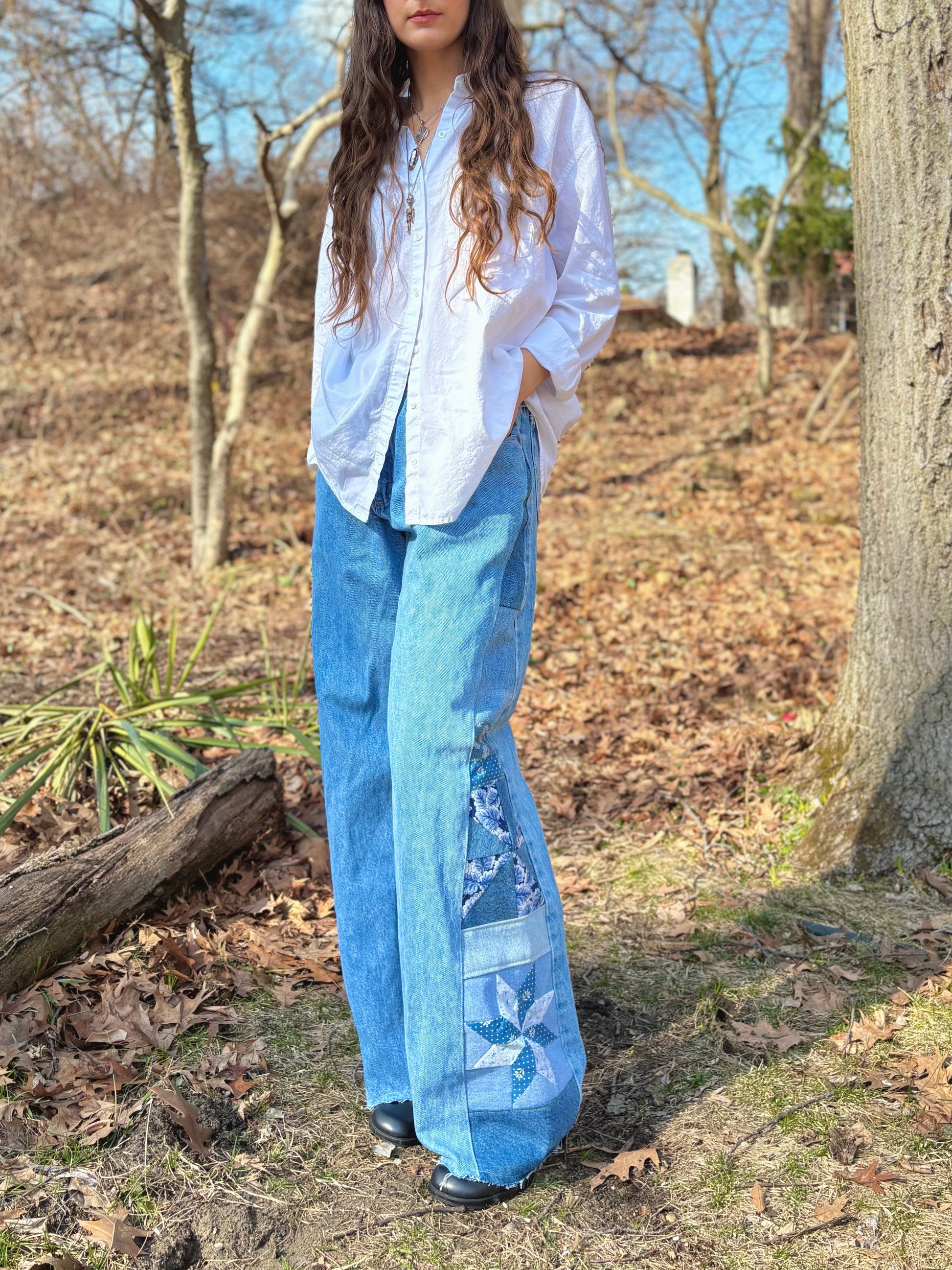 - Quilt star & pinwheel panel on side legs, constructed out of blue denim fabric and dark blue cotton floral print