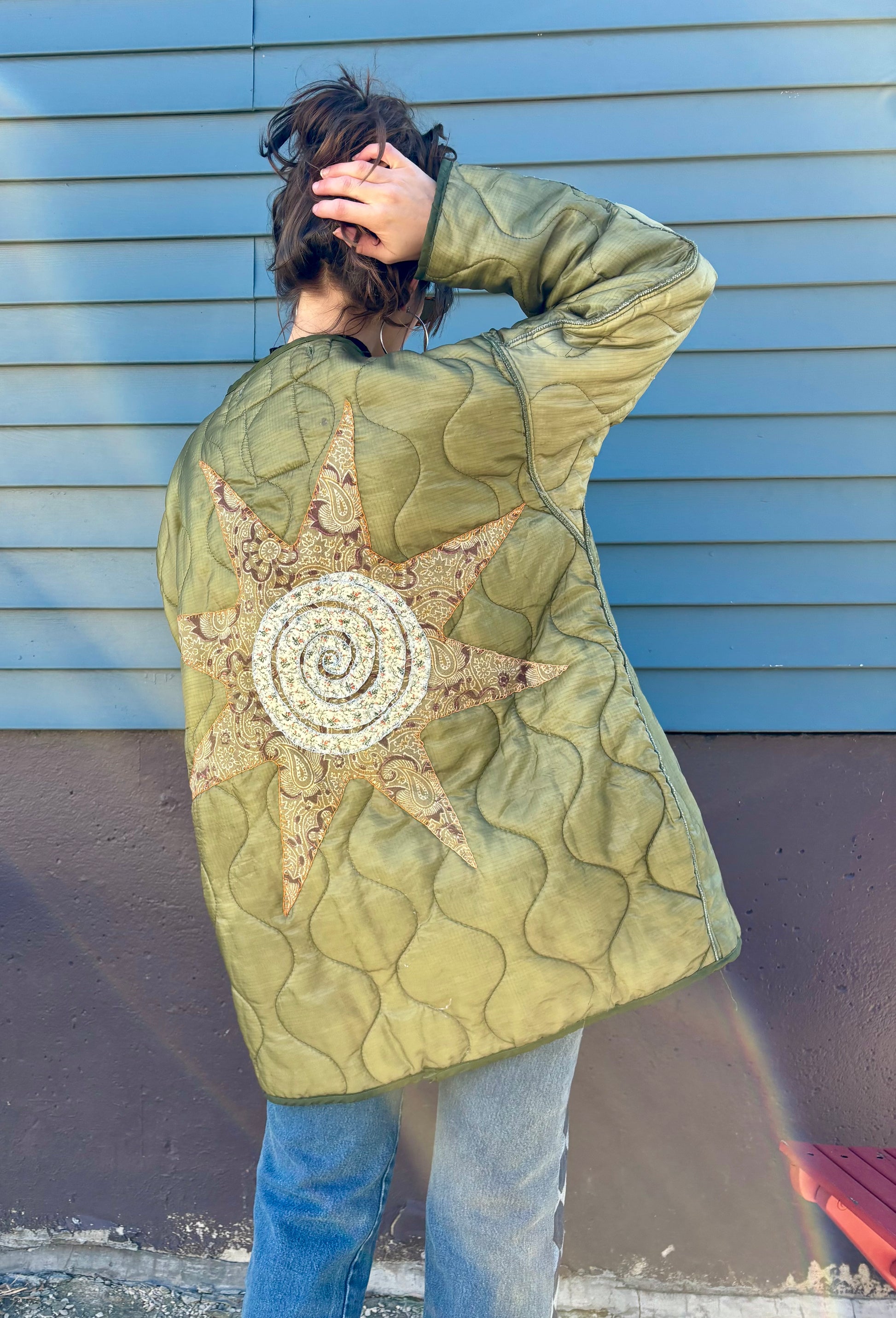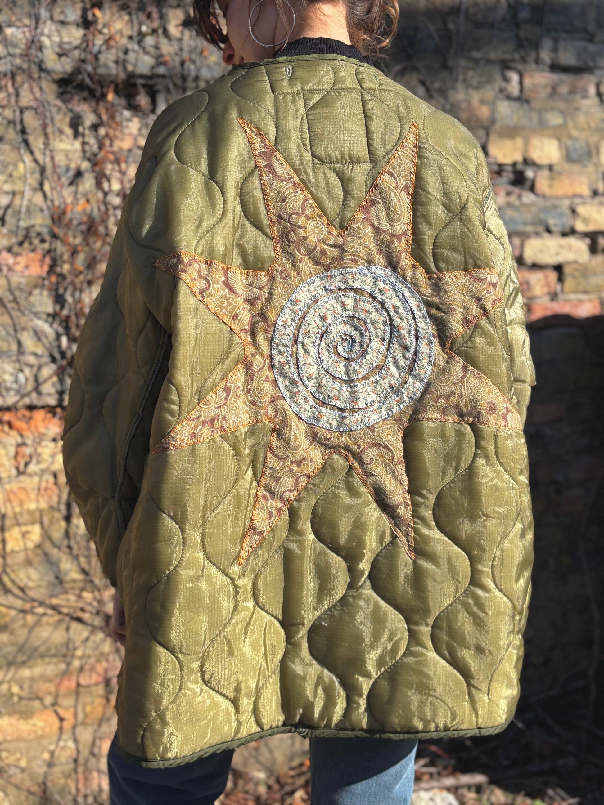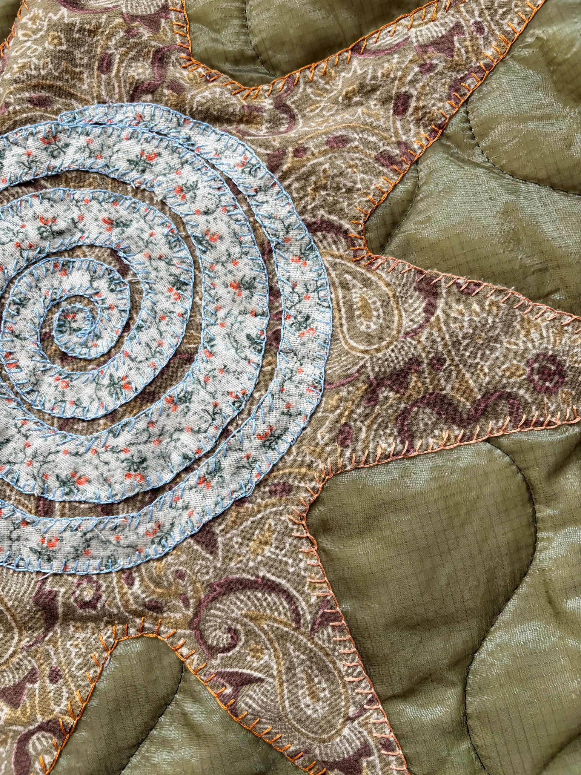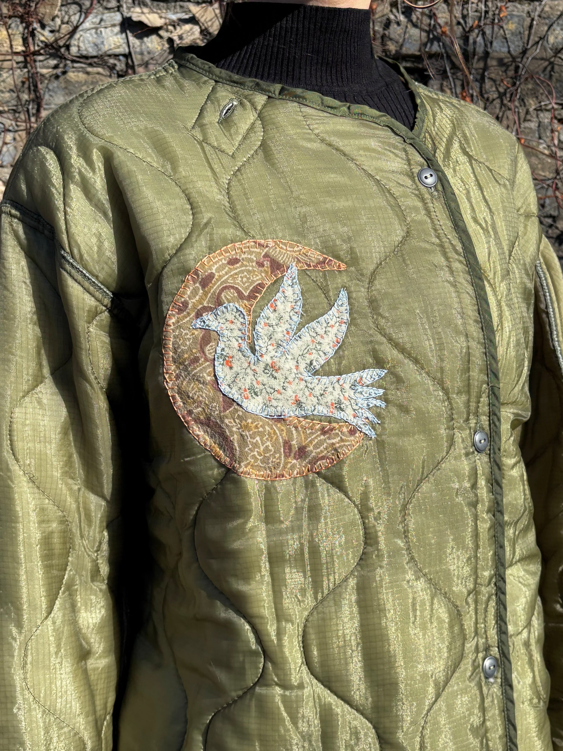 - Appliqué sun on back and dove on moon on front, applied by hand with blanket stitch