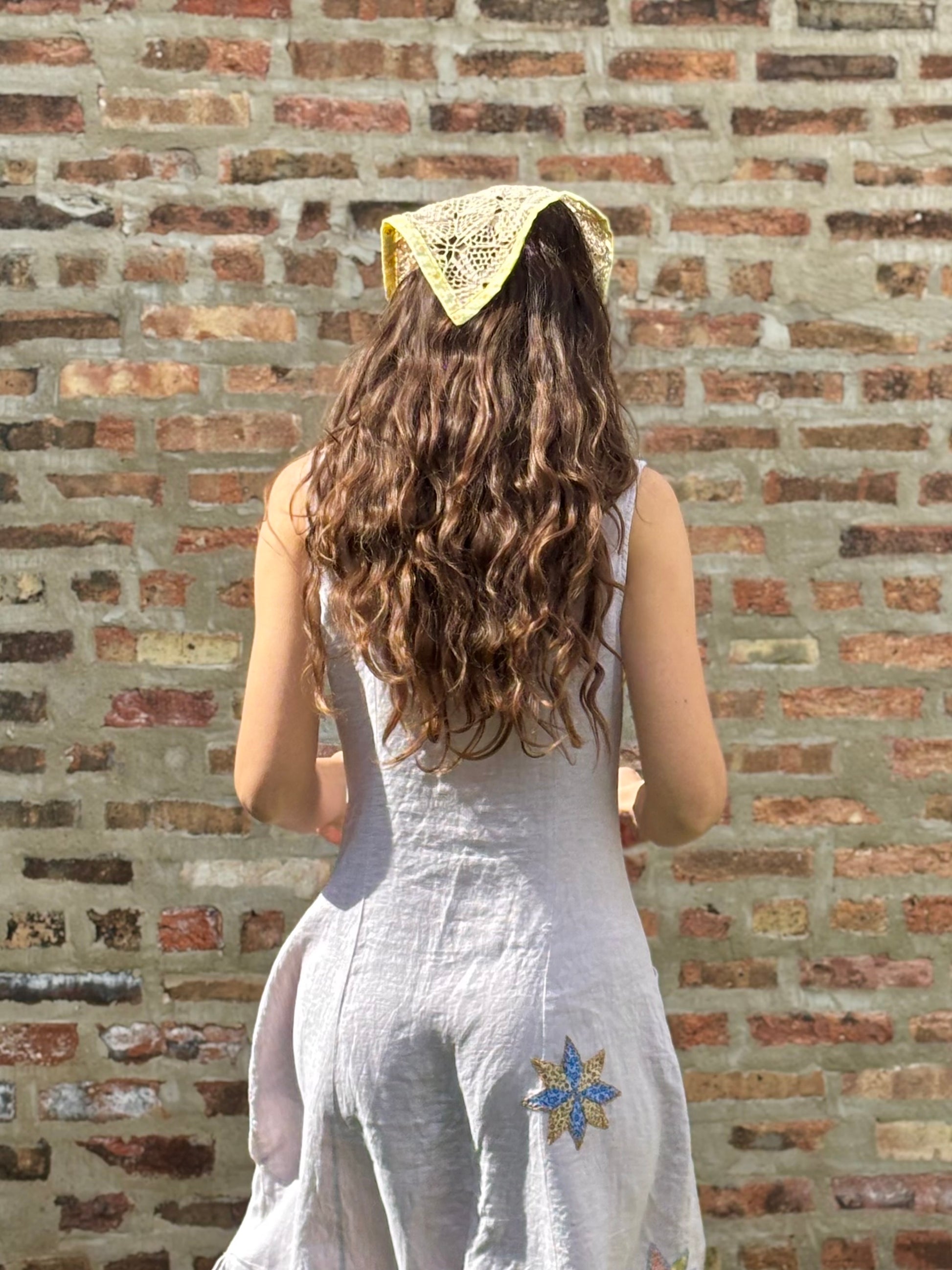 - Sweet triangular scarf lovingly made from antique crochet table cloth with 1970s gingham floral cotton trim