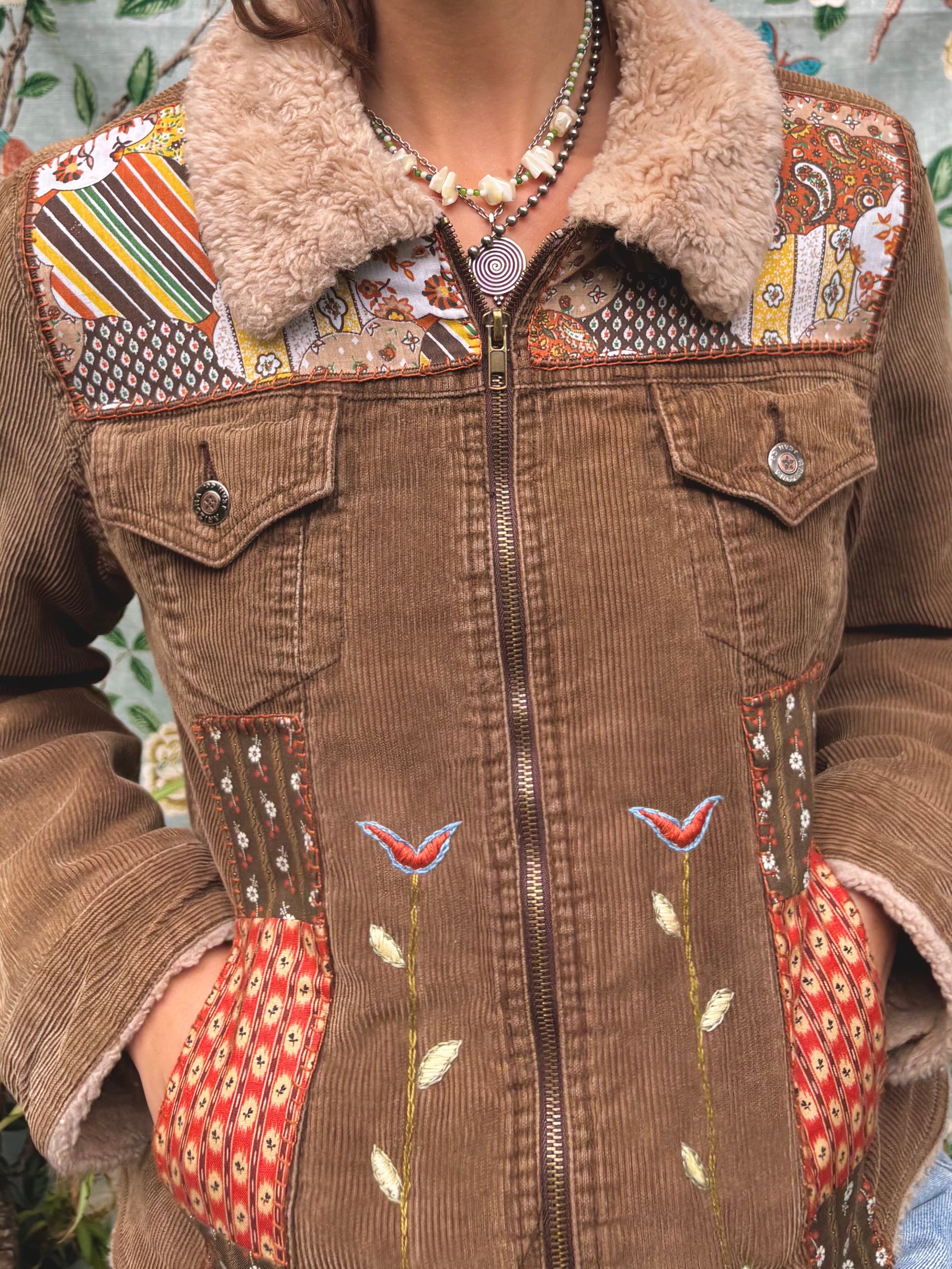 - Patched with vintage fabric, including a cute 1970s trippy cotton print