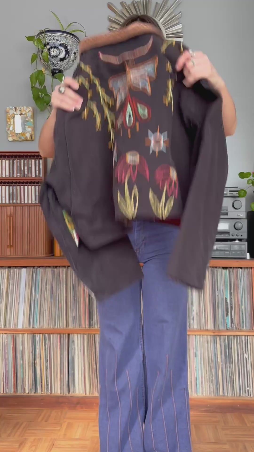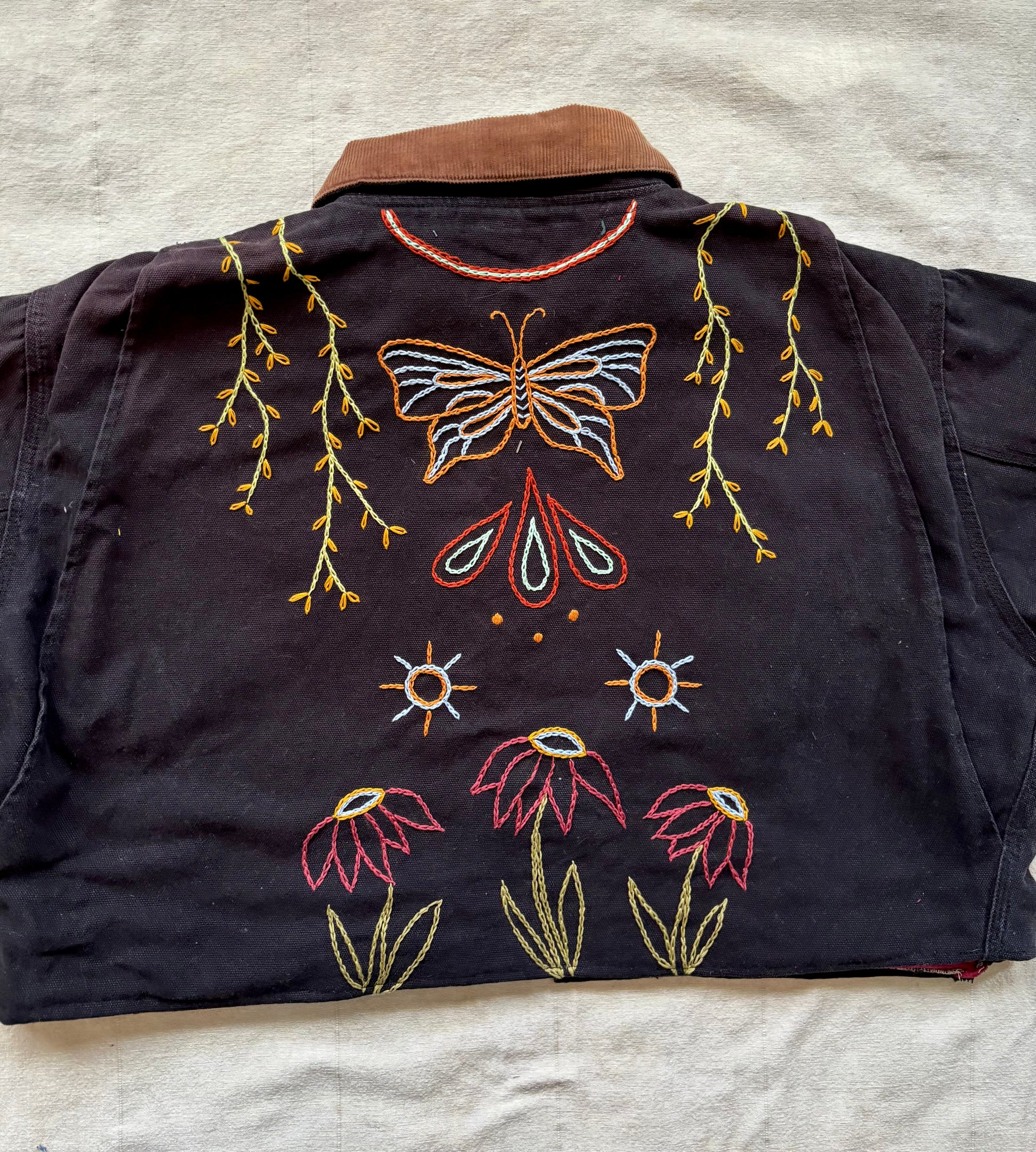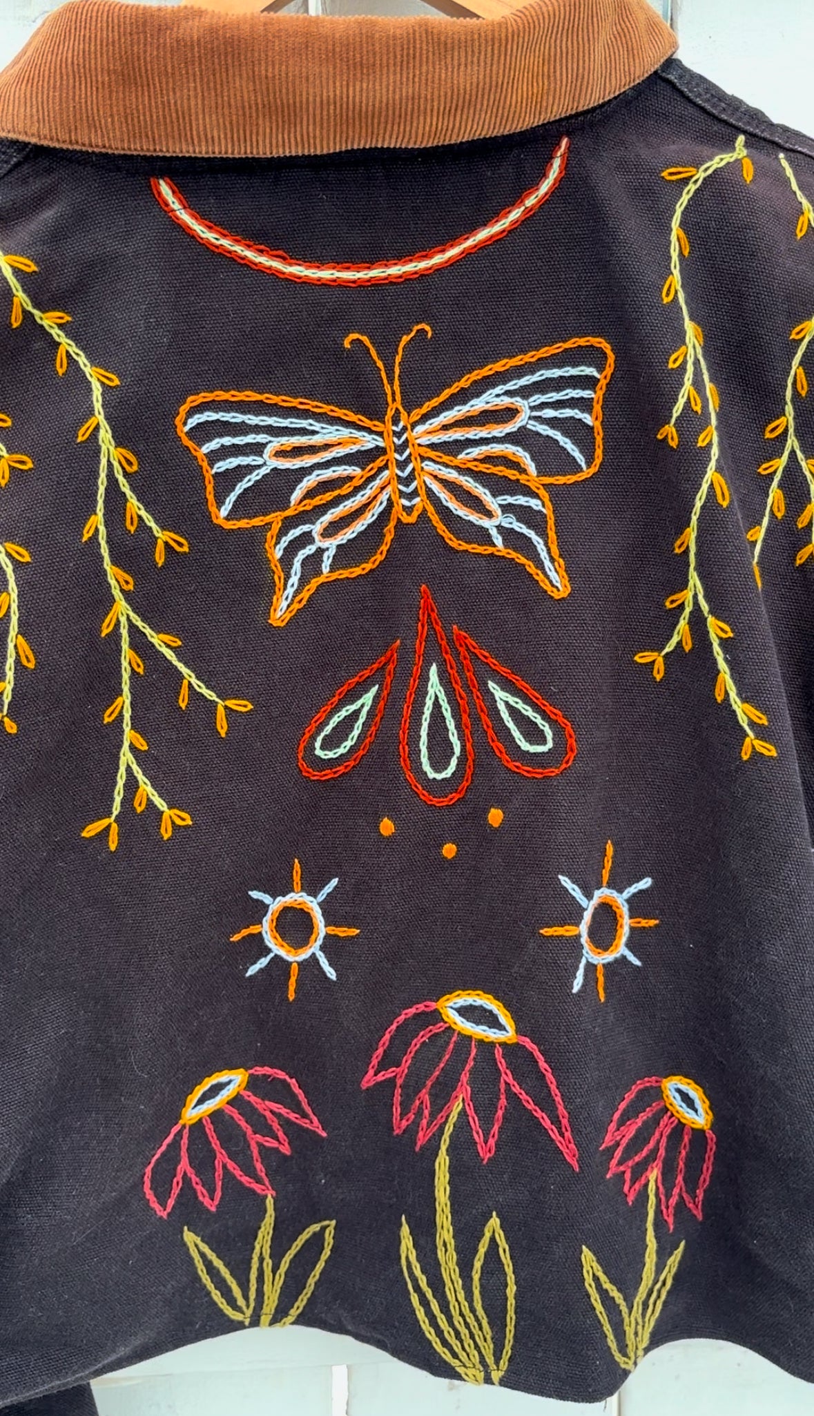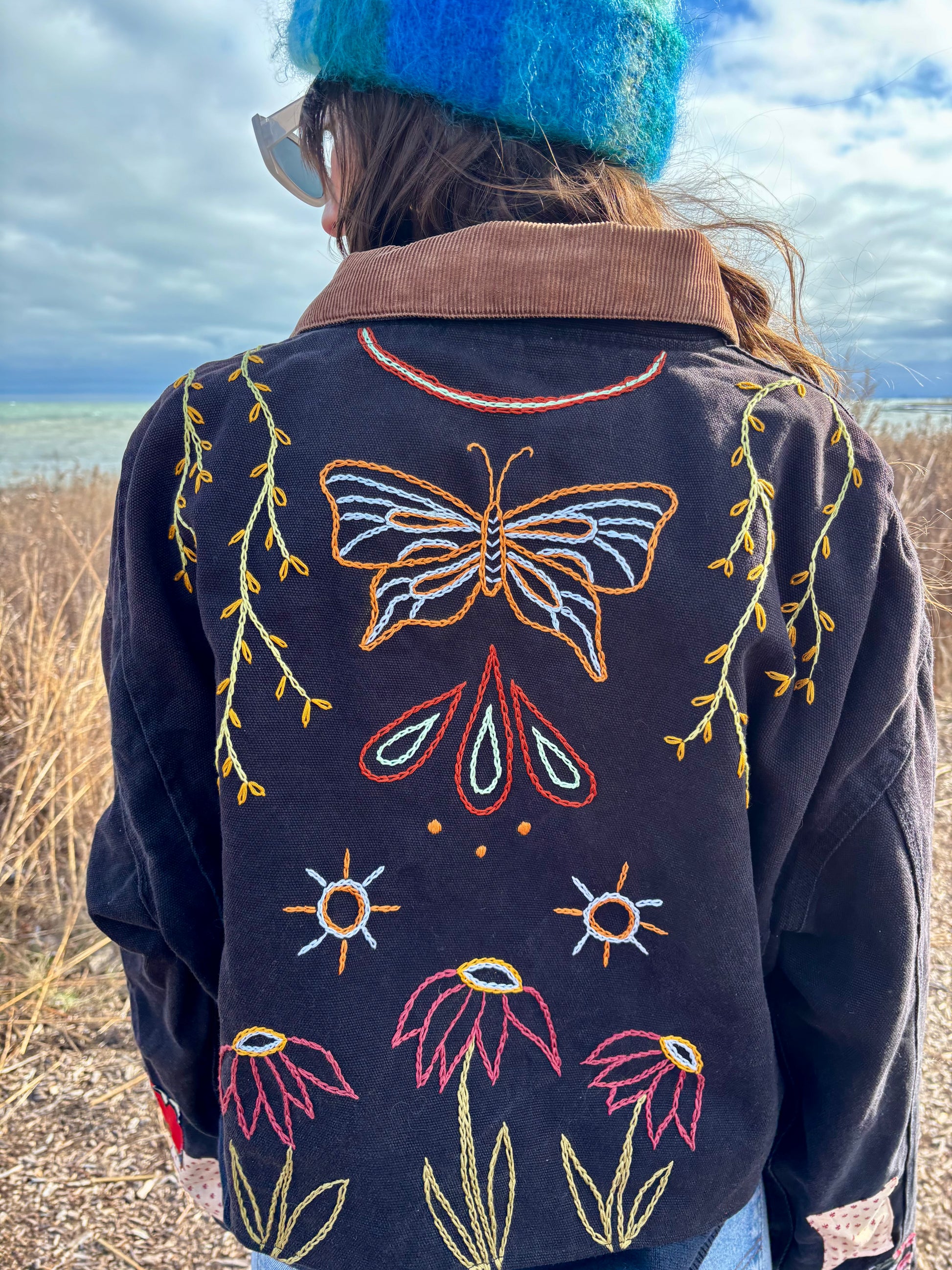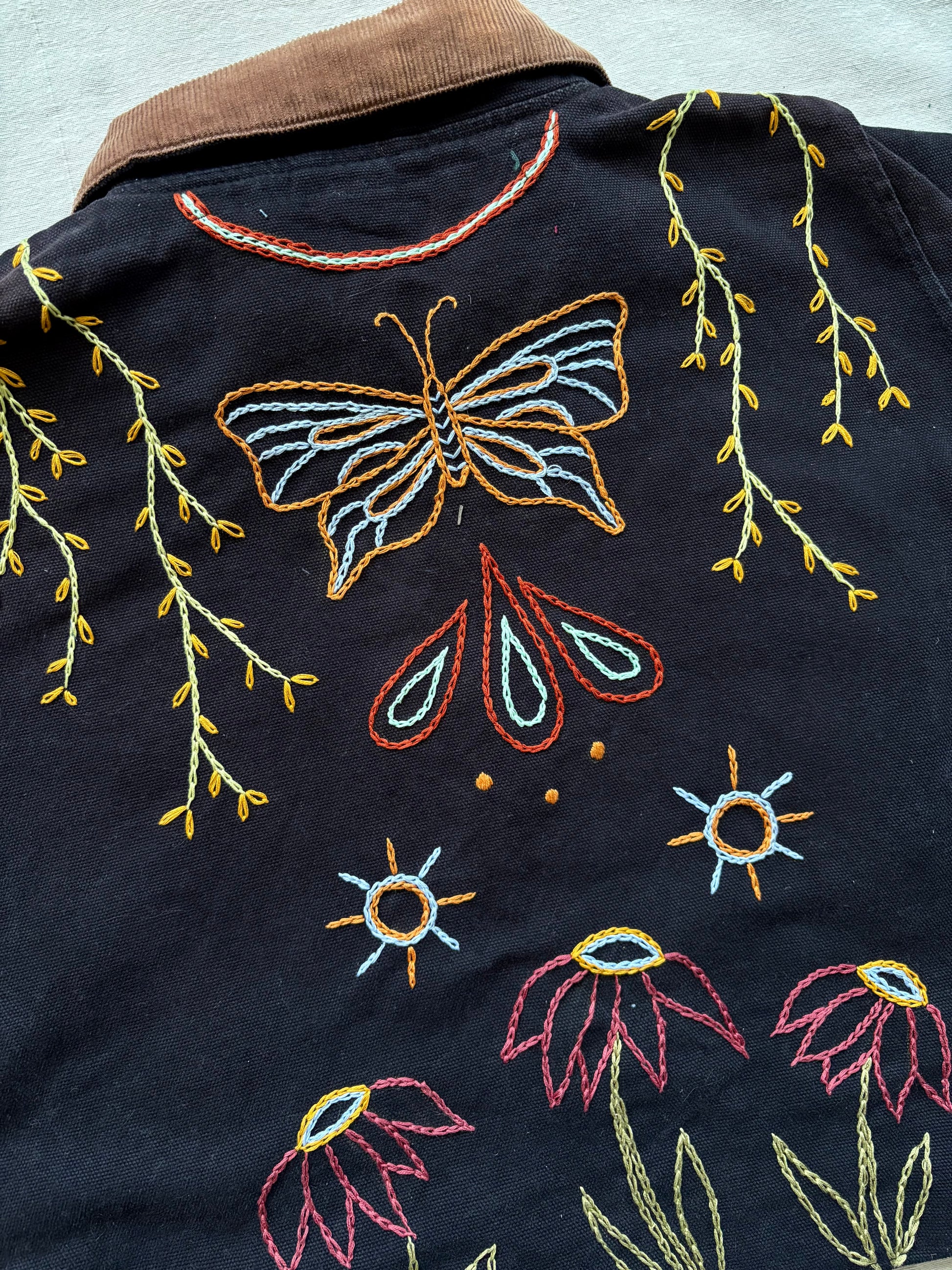 - Hand embroidered butterfly and floral motif covering the back and some on the front of the coat