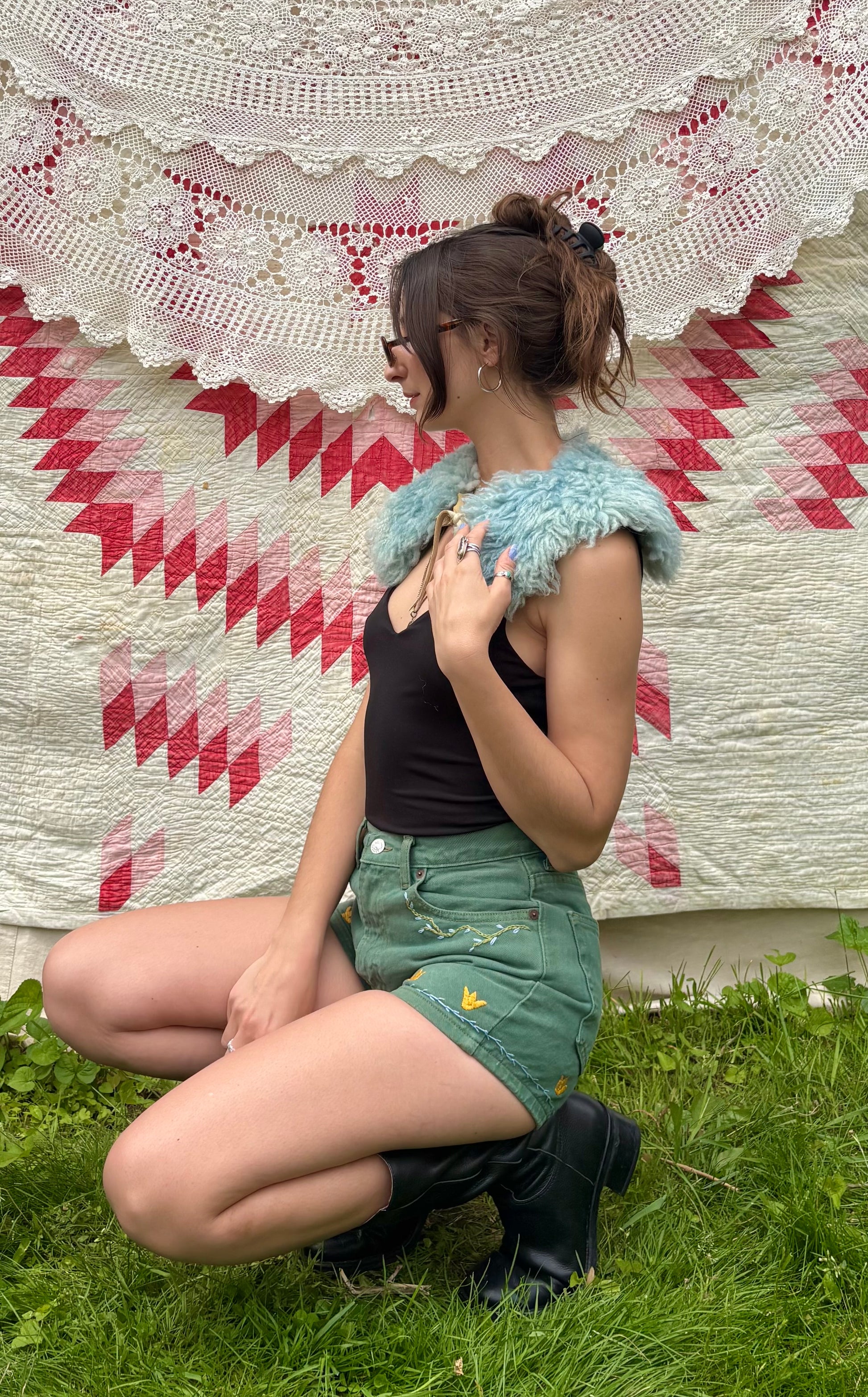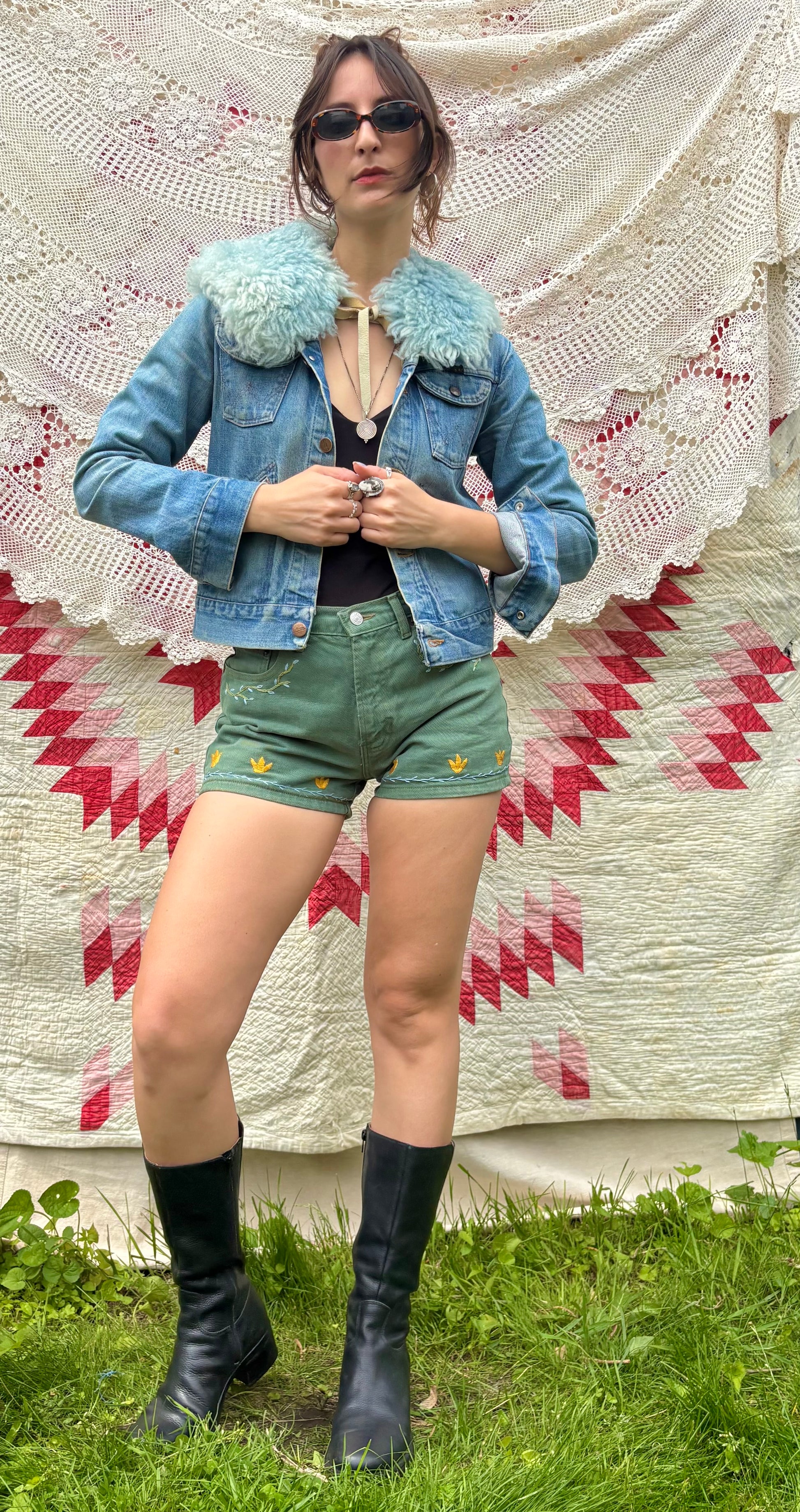 - Hand embroidered vines along the front pockets