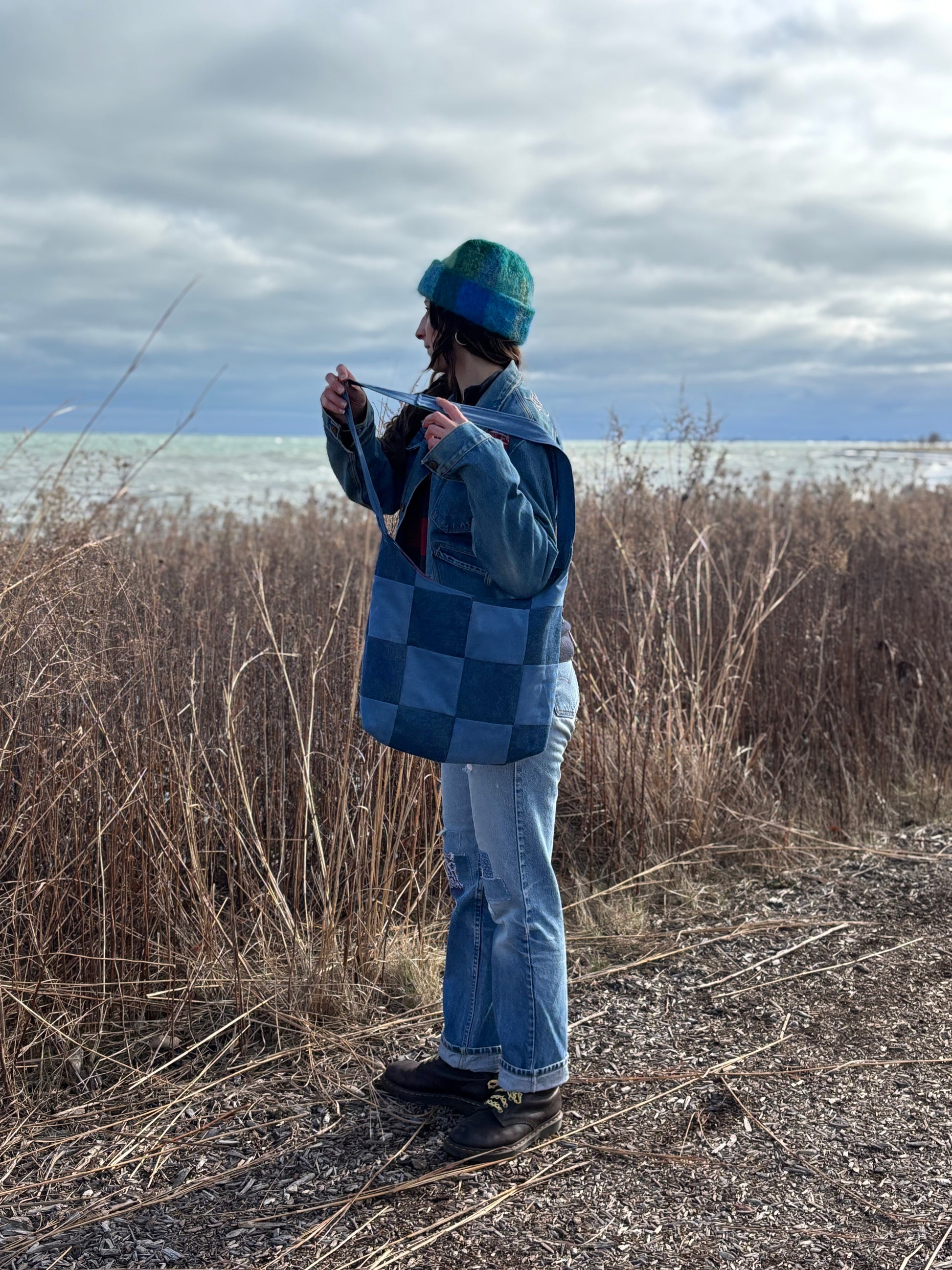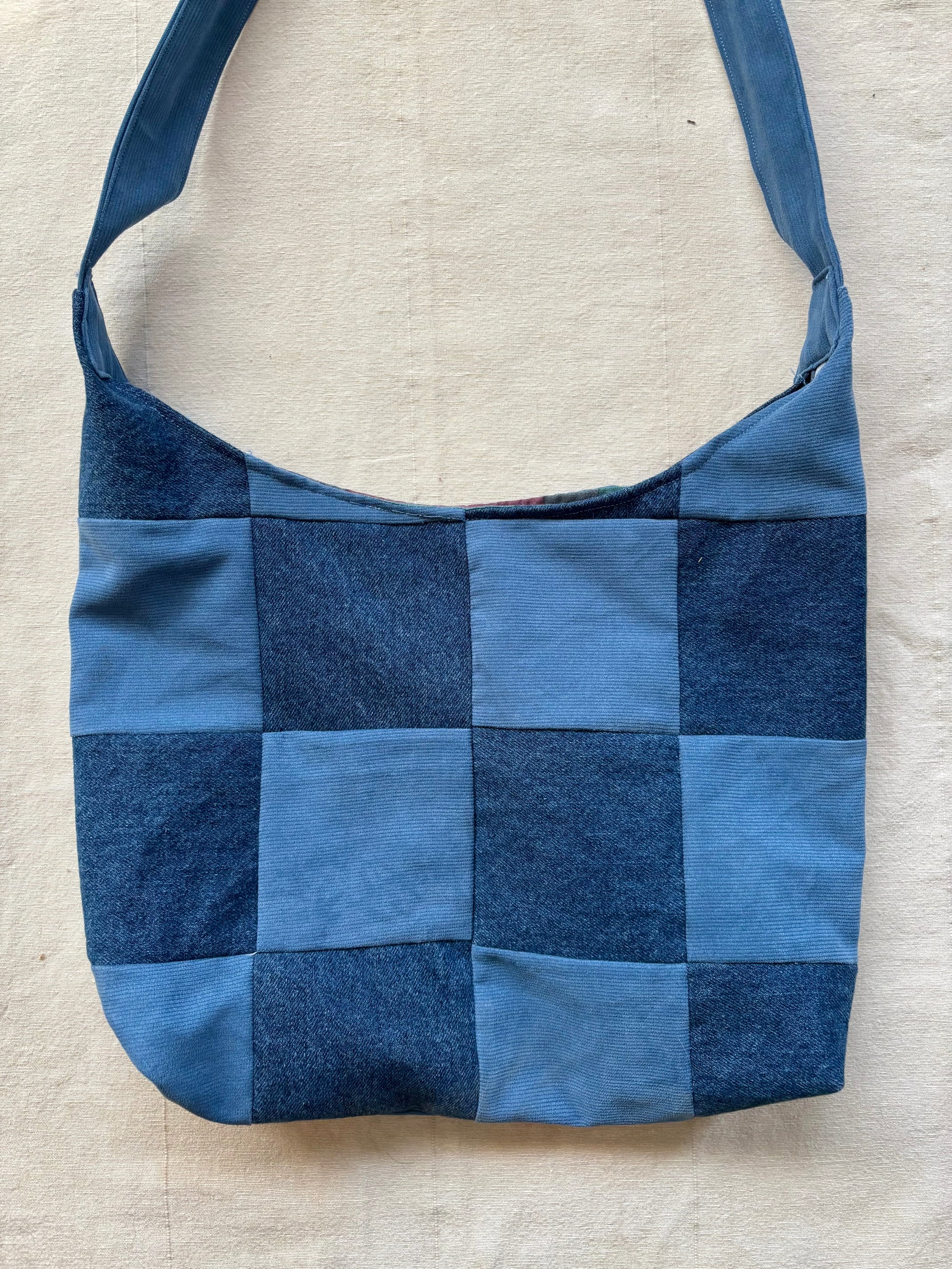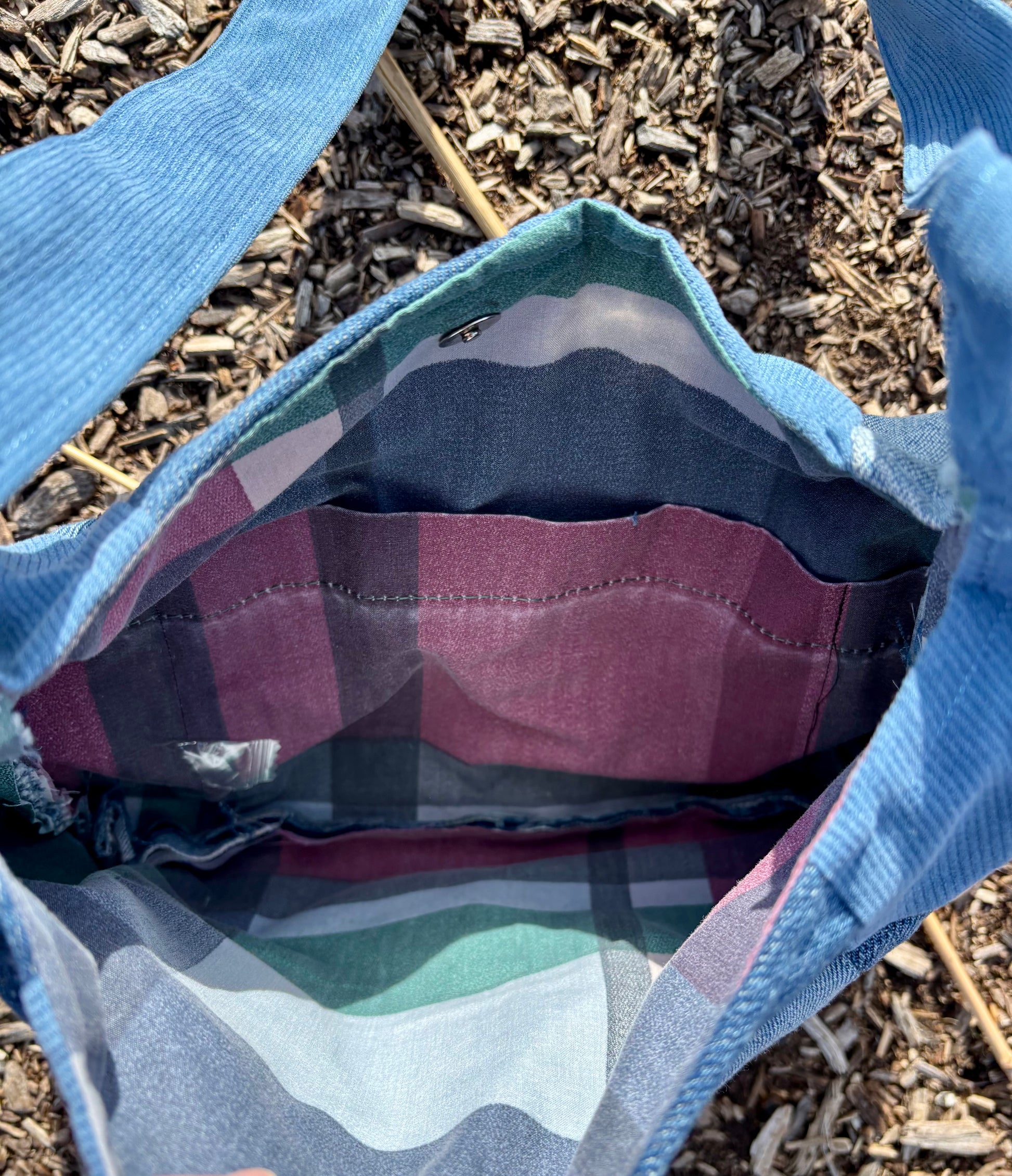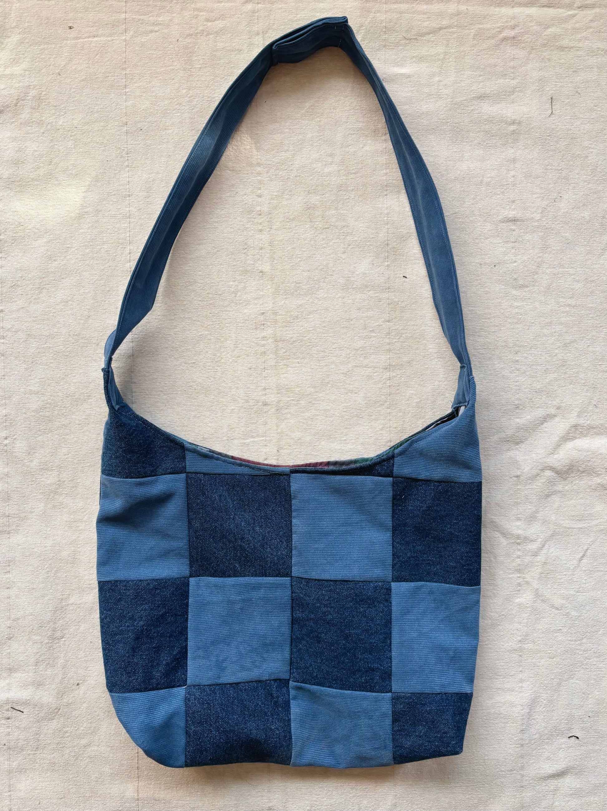 - Checkered quilted denim and corduroy fabric on outside of the bag