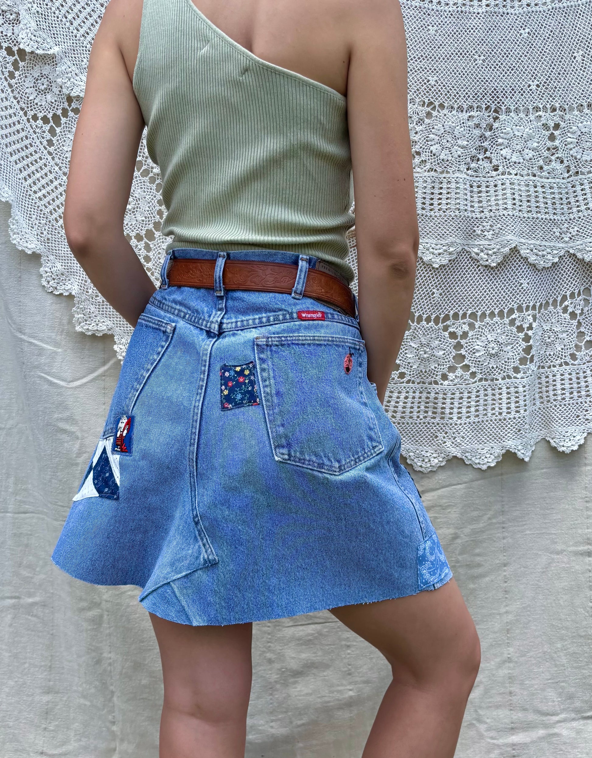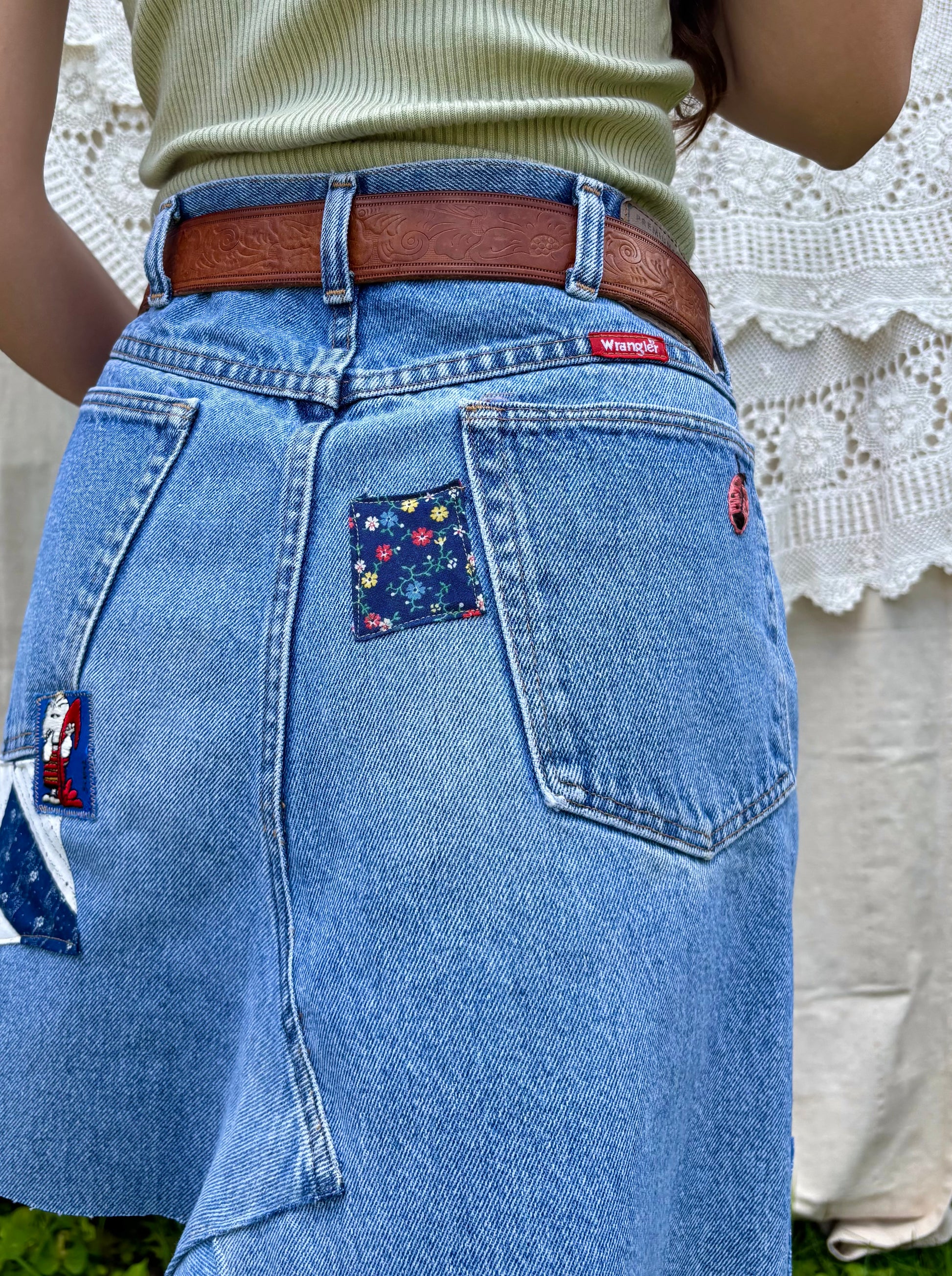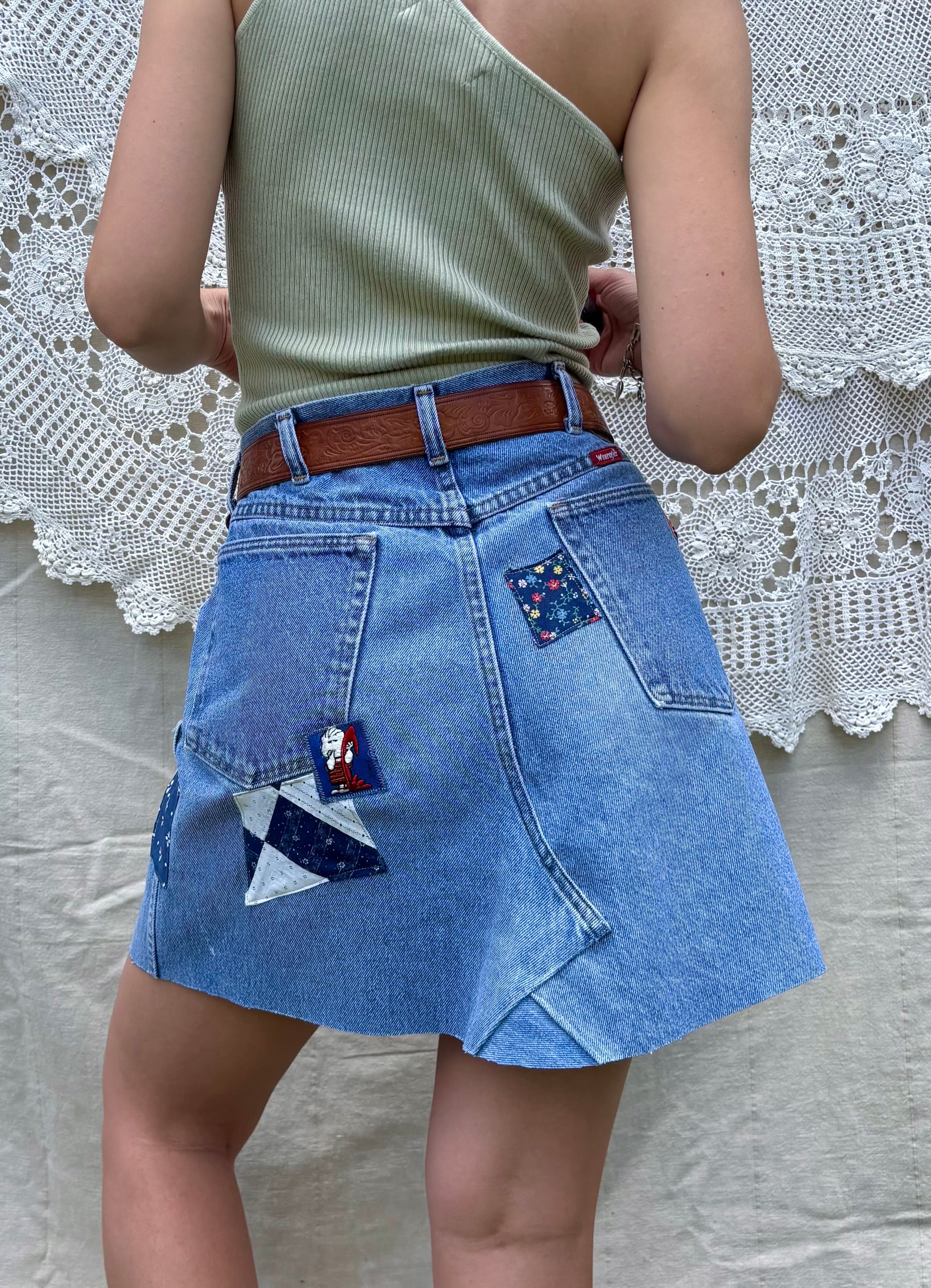- Light wash vintage Wrangler jeans, converted into a sweet mini skirt