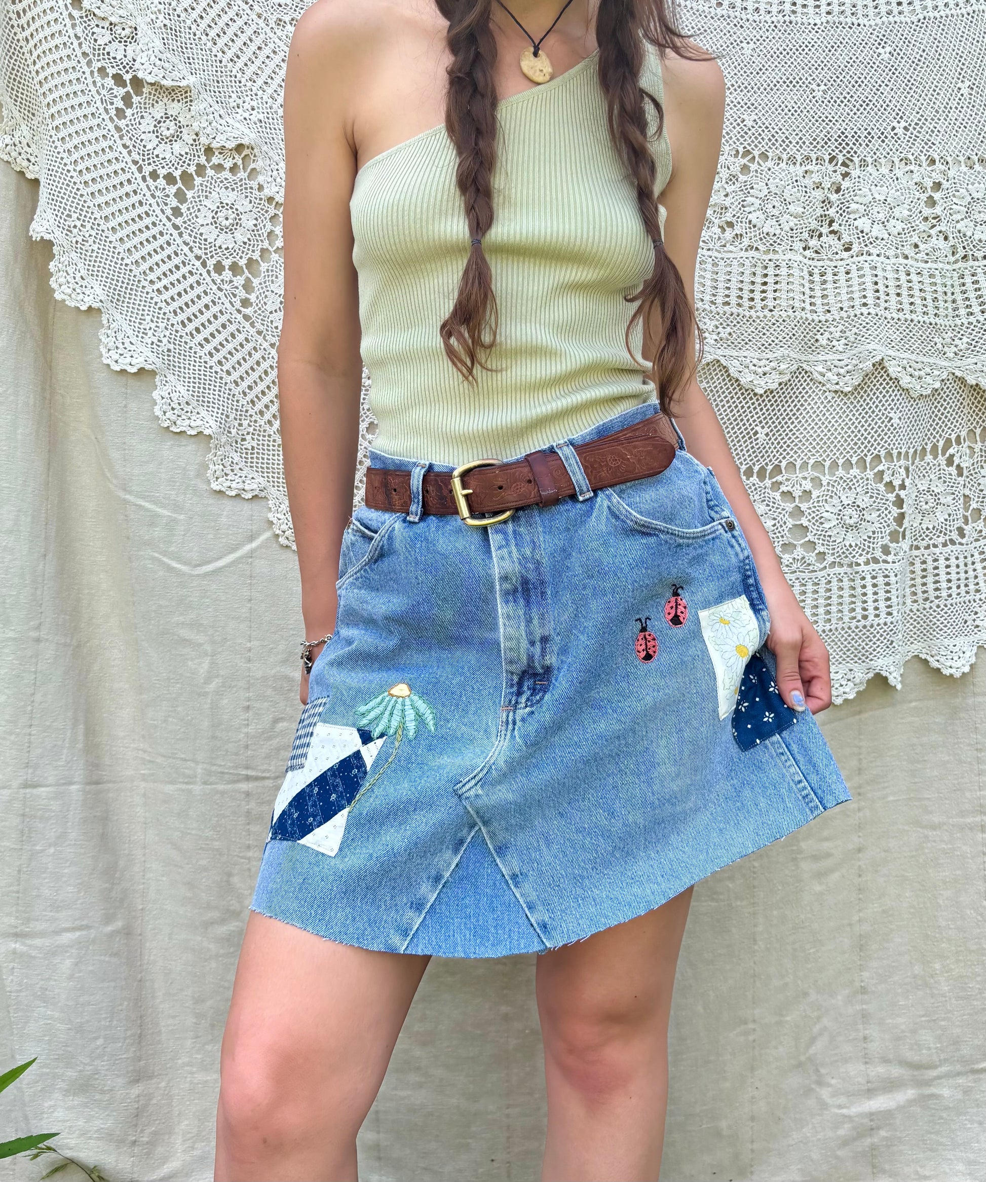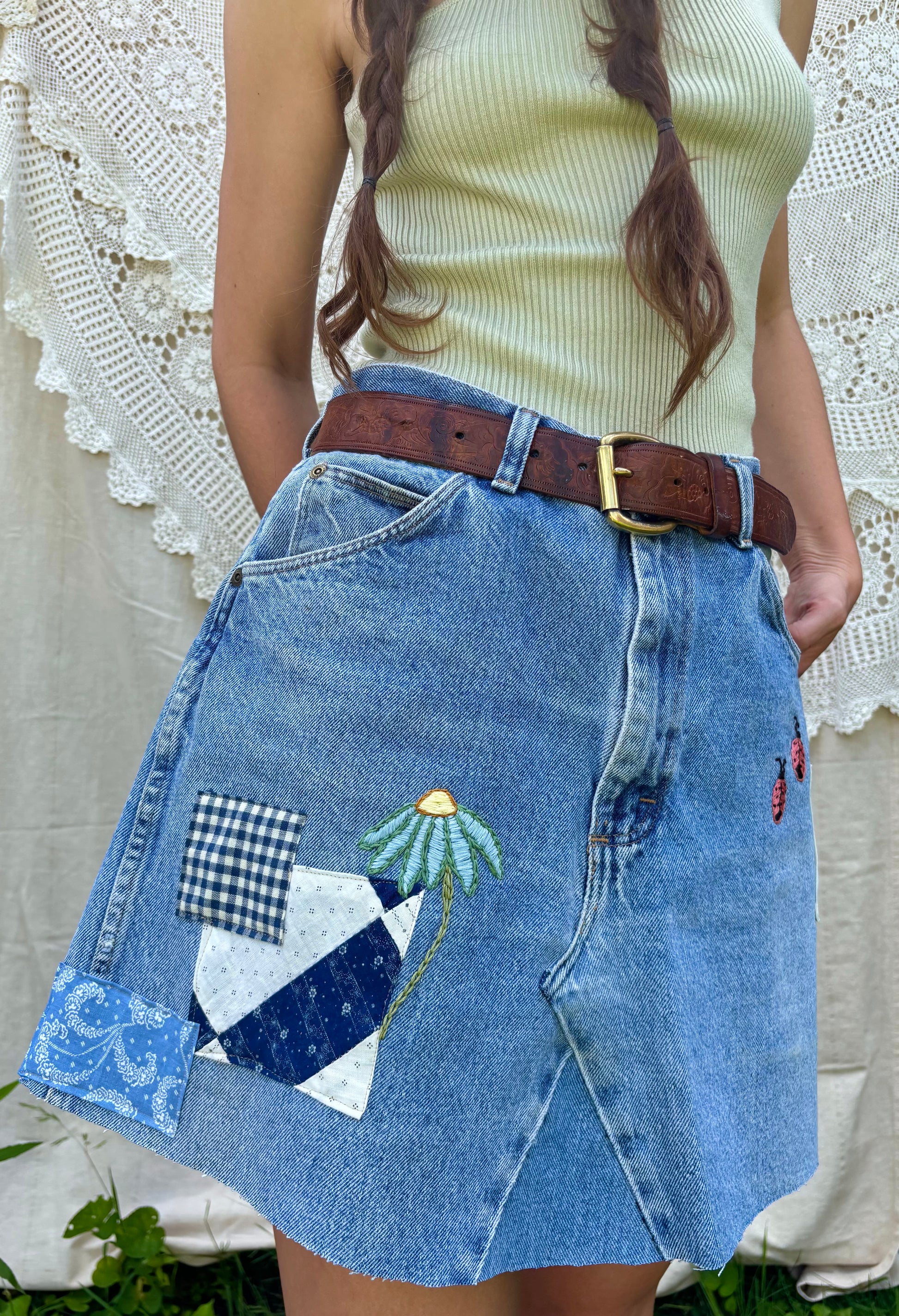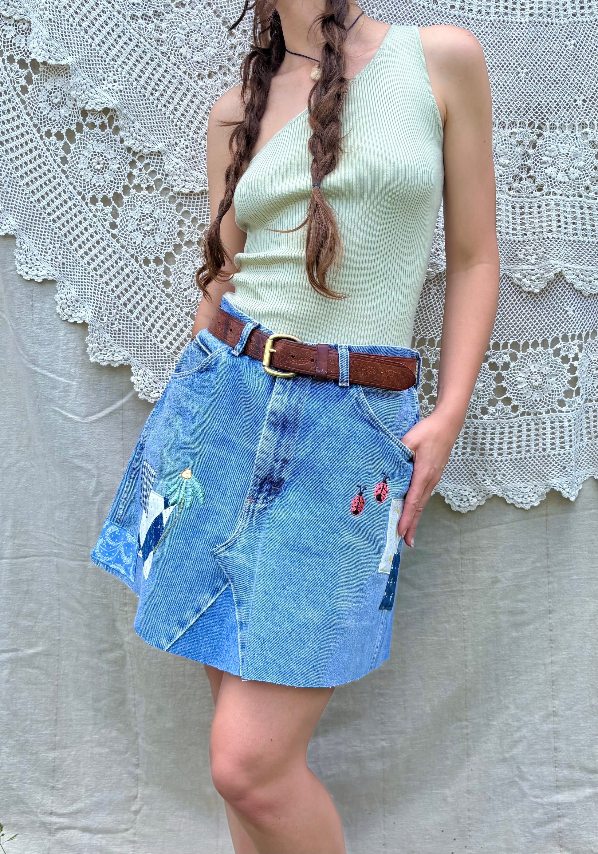 - Light wash vintage Wrangler jeans, converted into a sweet mini skirt