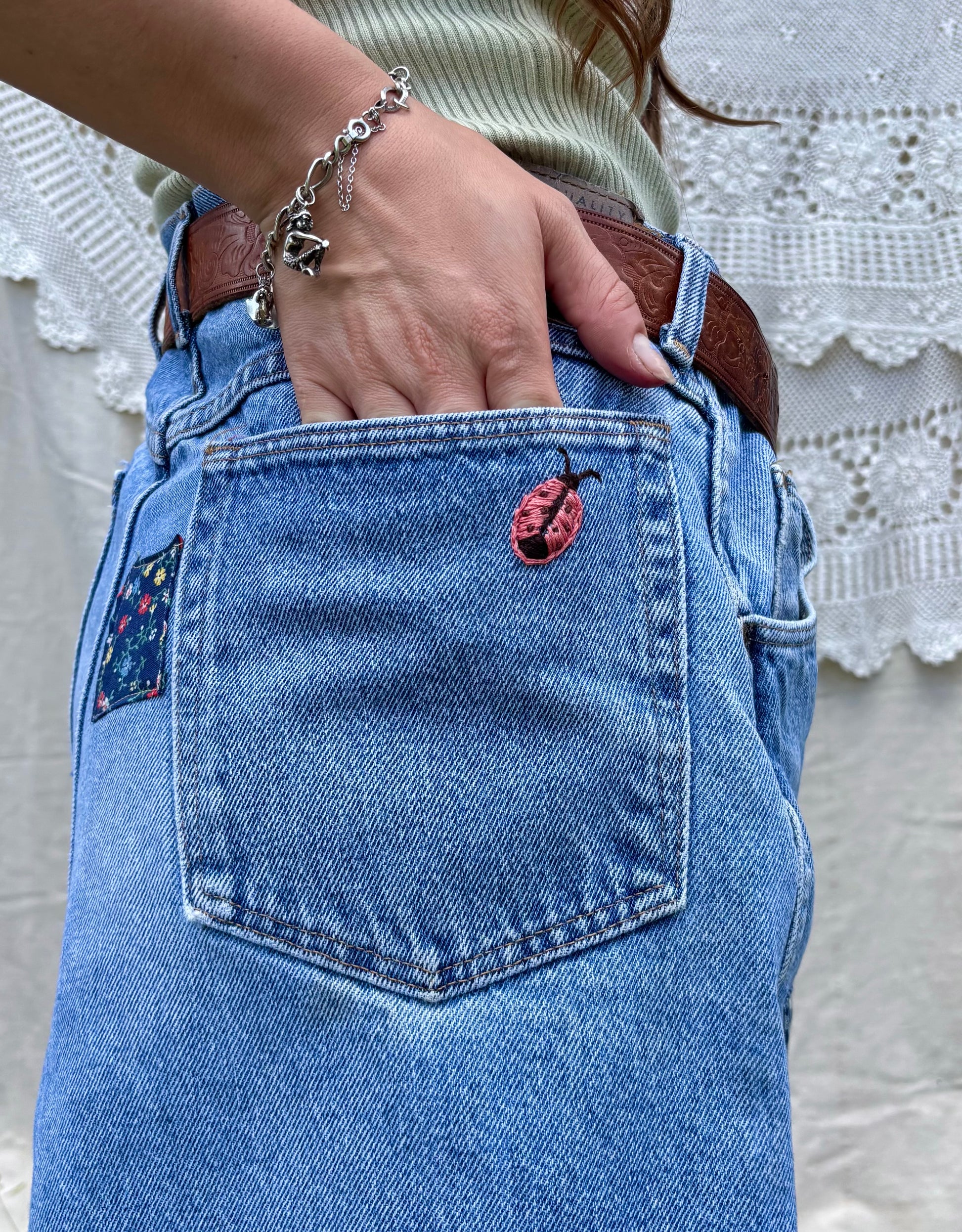 - Hand embroidered ladybugs on front and one on back pocket