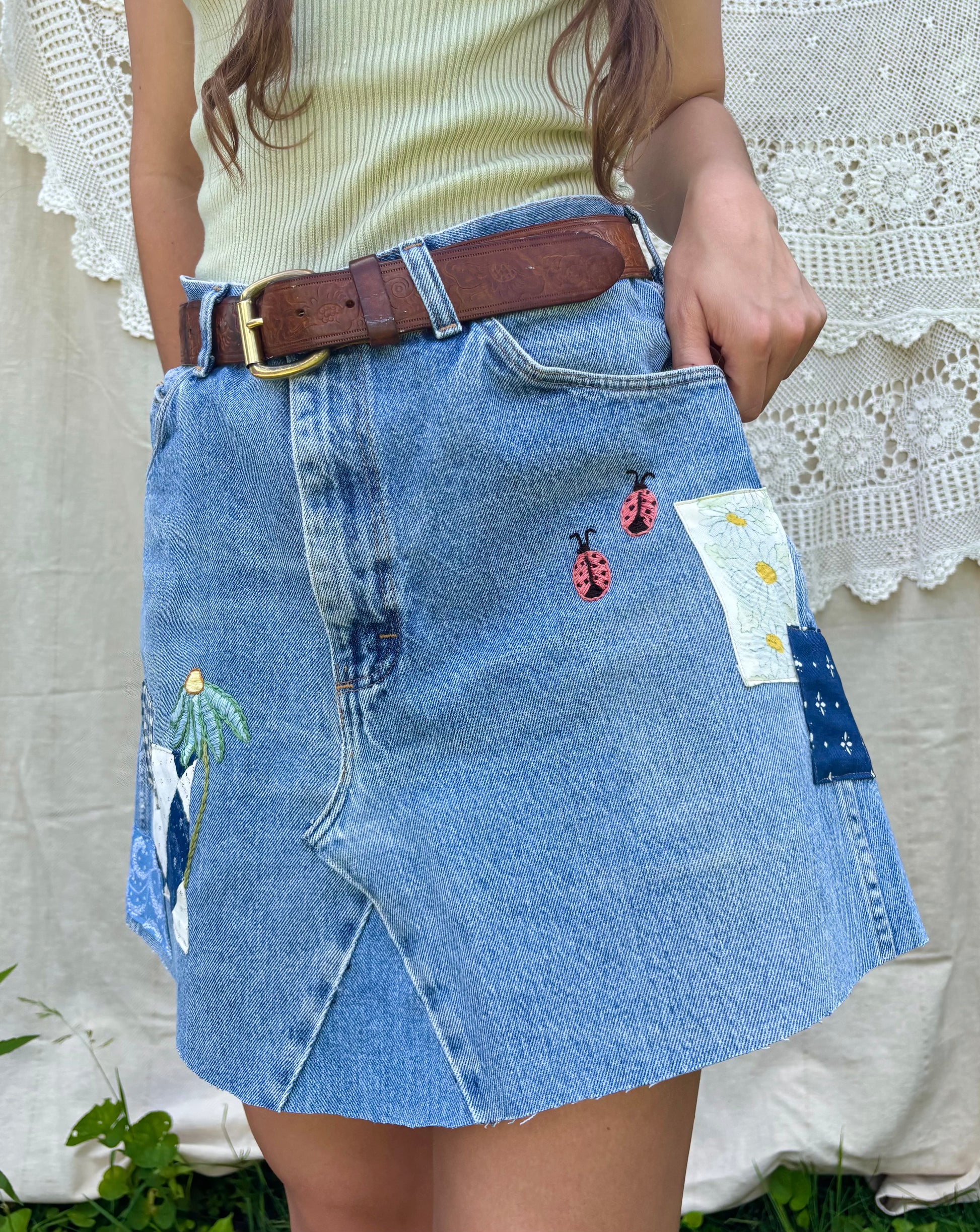 Ladybug Embroidered & Patched Wrangler Mini Skirt