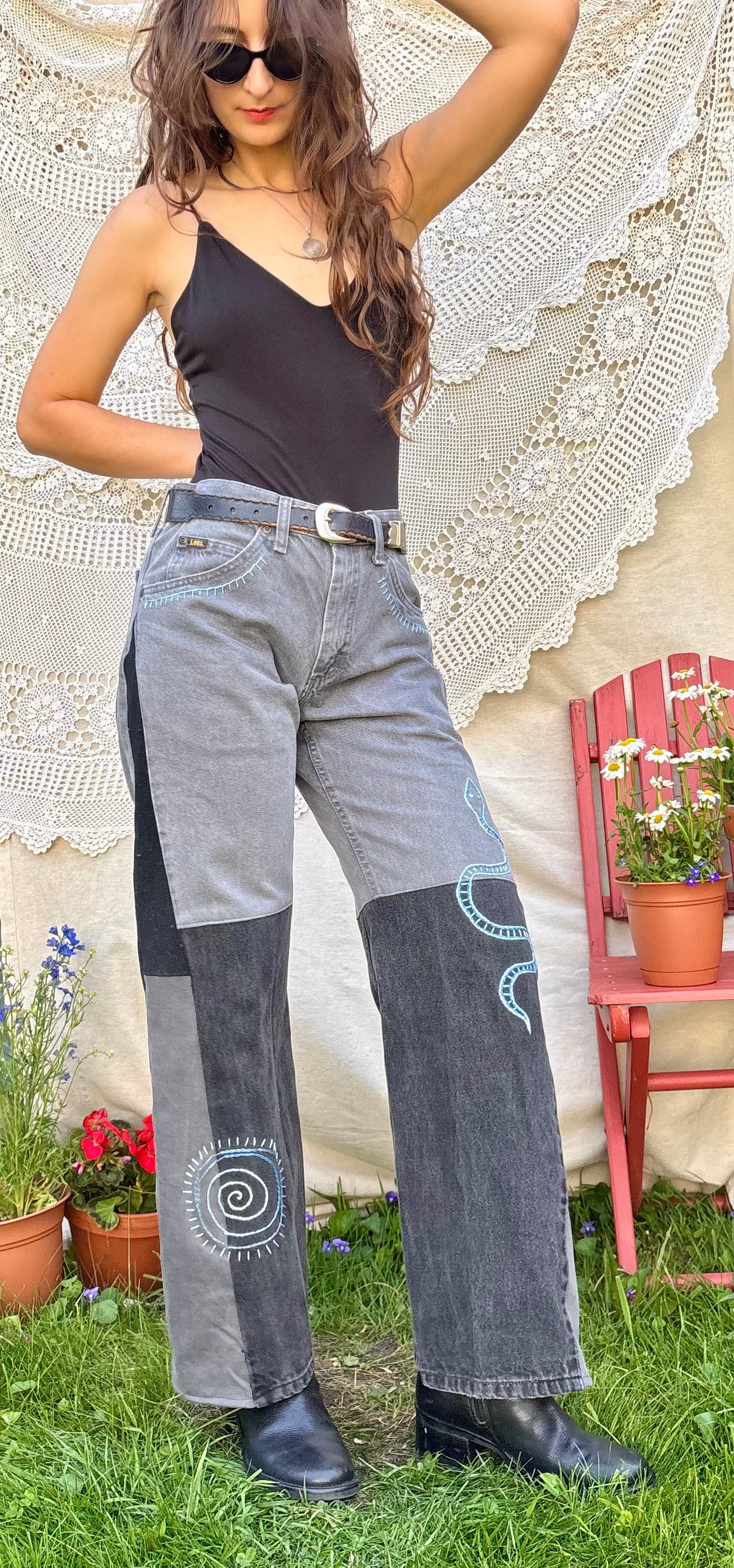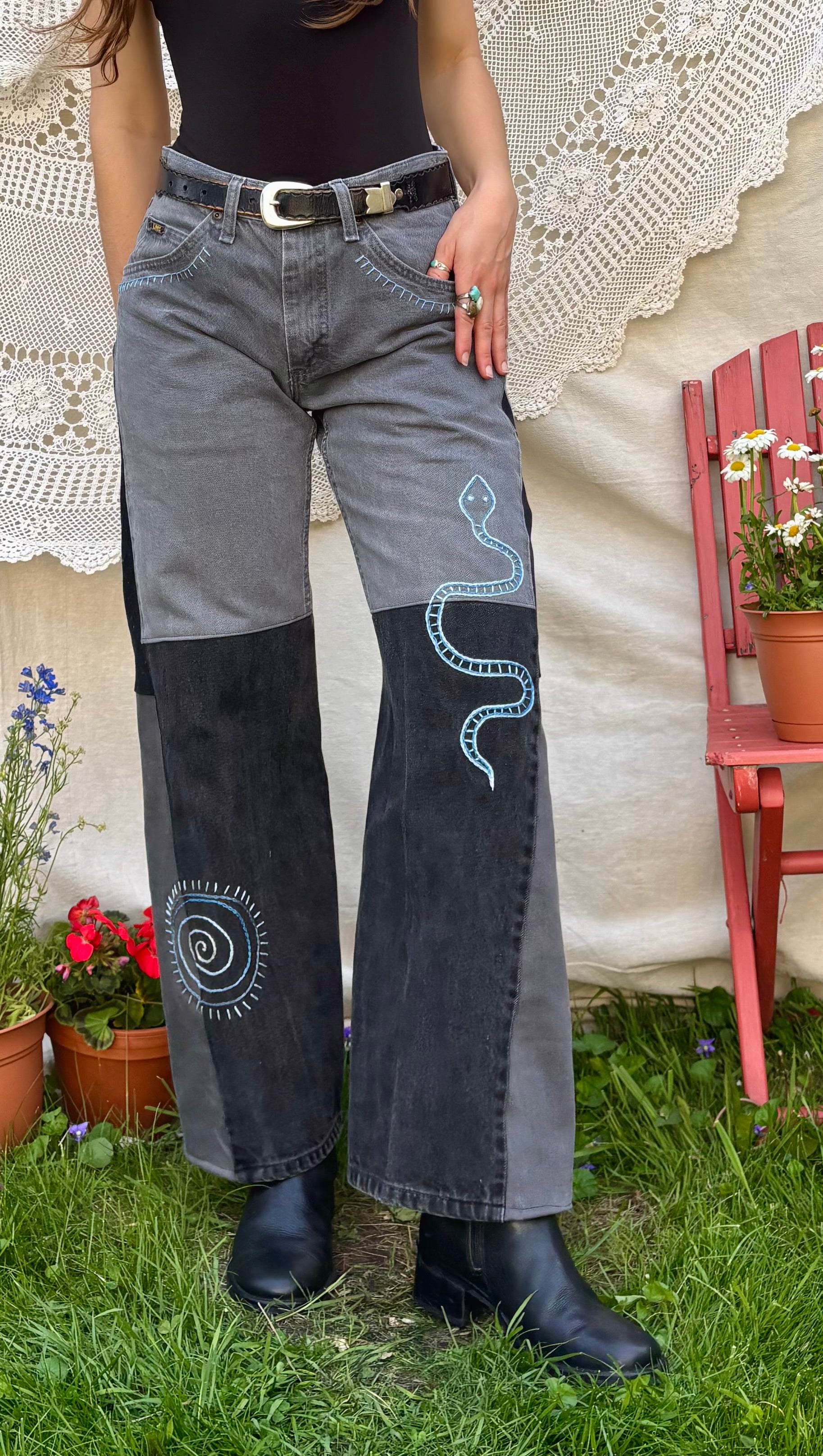 - Grey wash Lee jeans, converted into wide-legs/flares