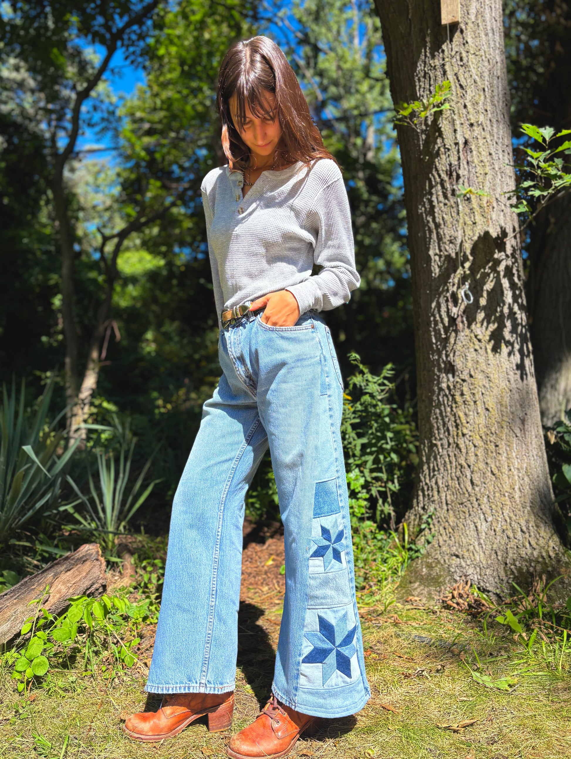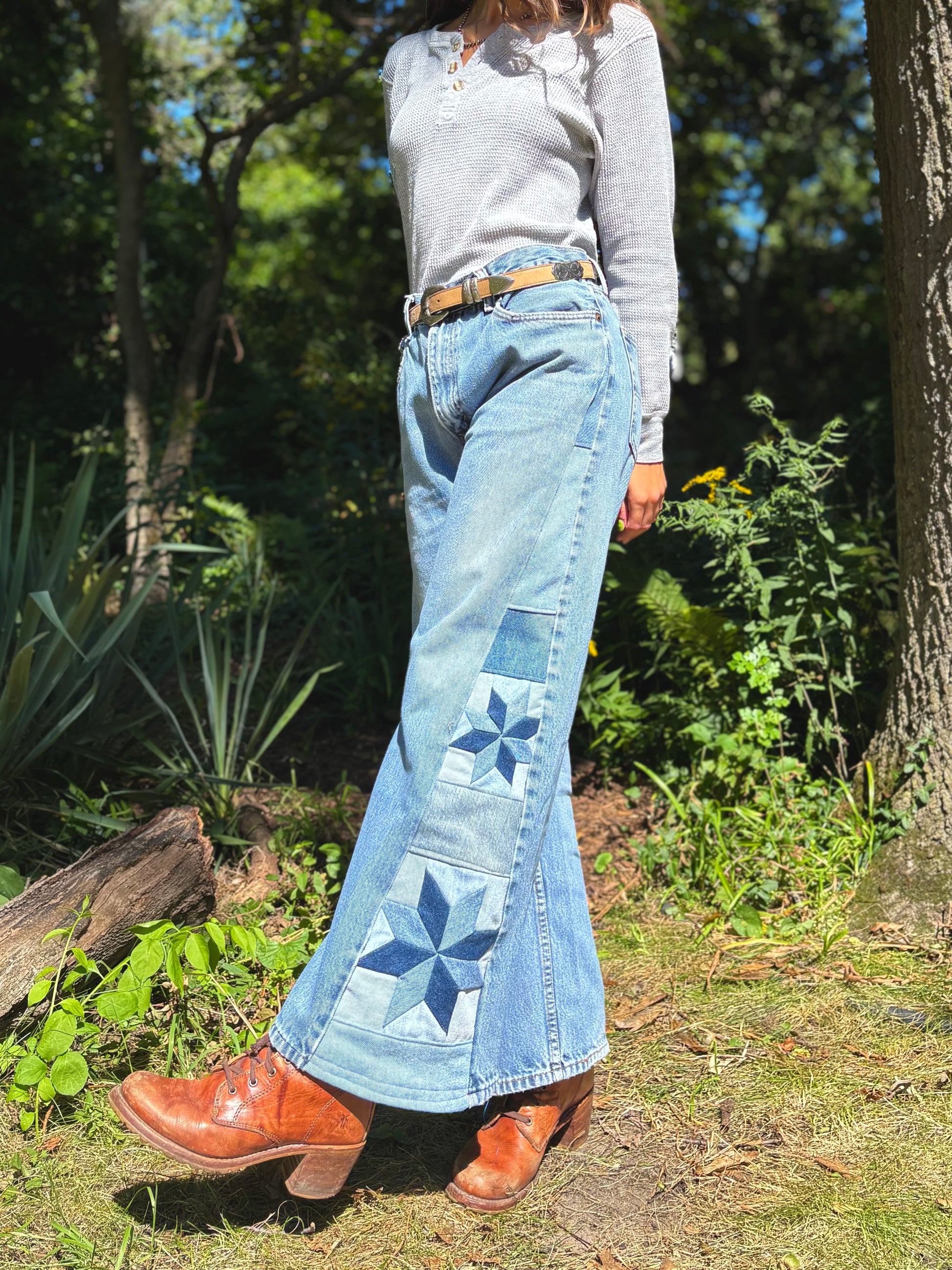 - Quilt star panel on side legs, constructed out of salvaged denim fabric