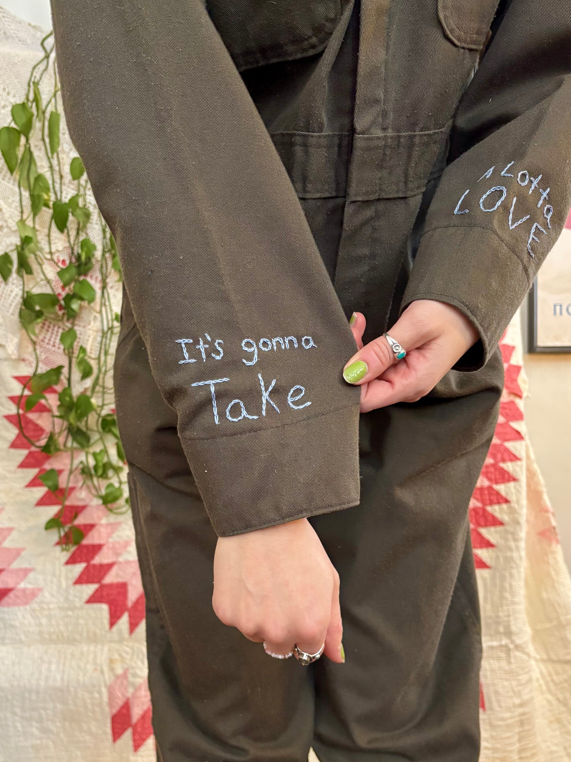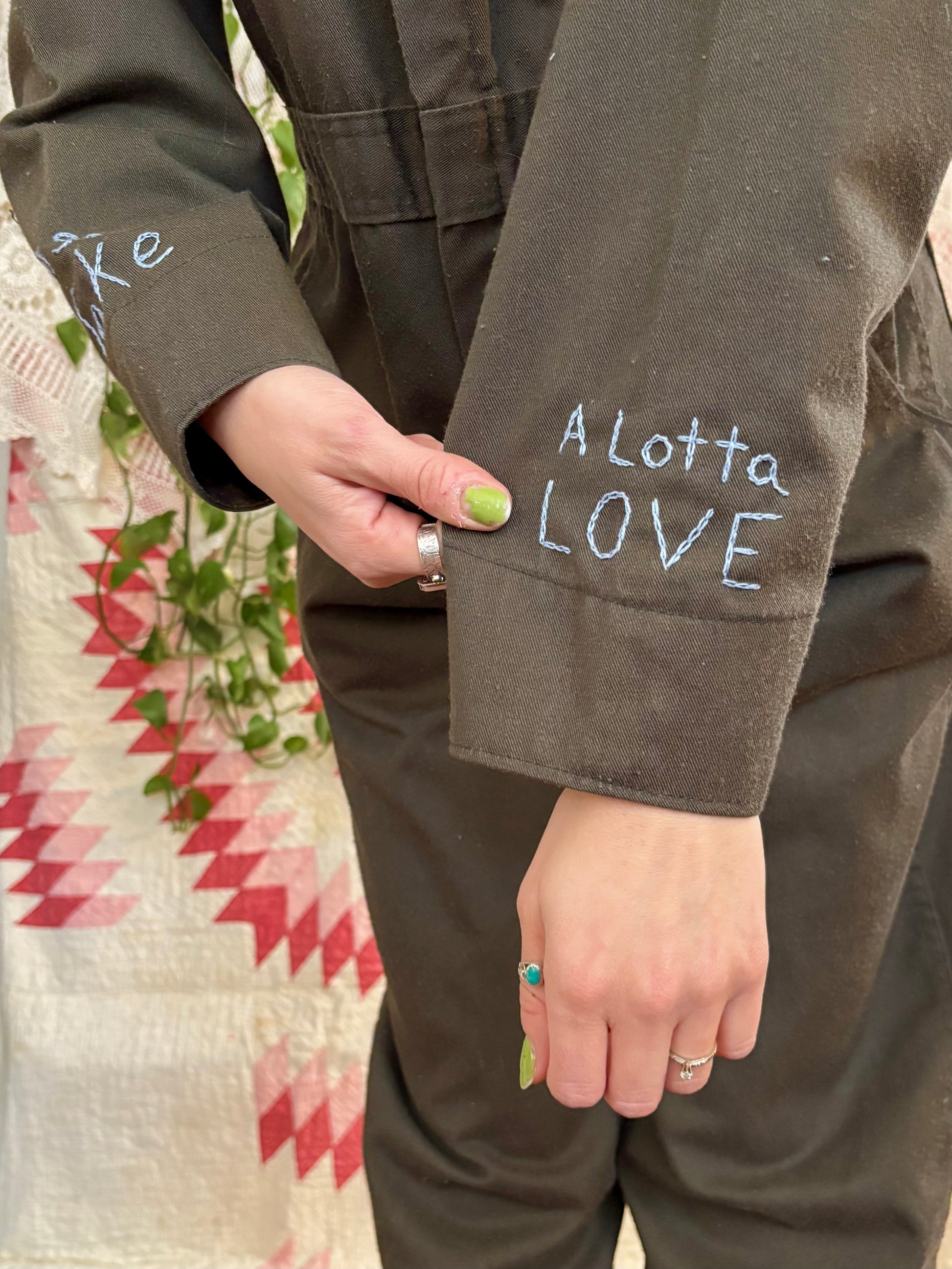 - Appliqué Neil Young lyrics on back, "Lotta Love", attached by hand using the blanket stitch. The letters are cotton brown and beige stripe corduroy fabric.