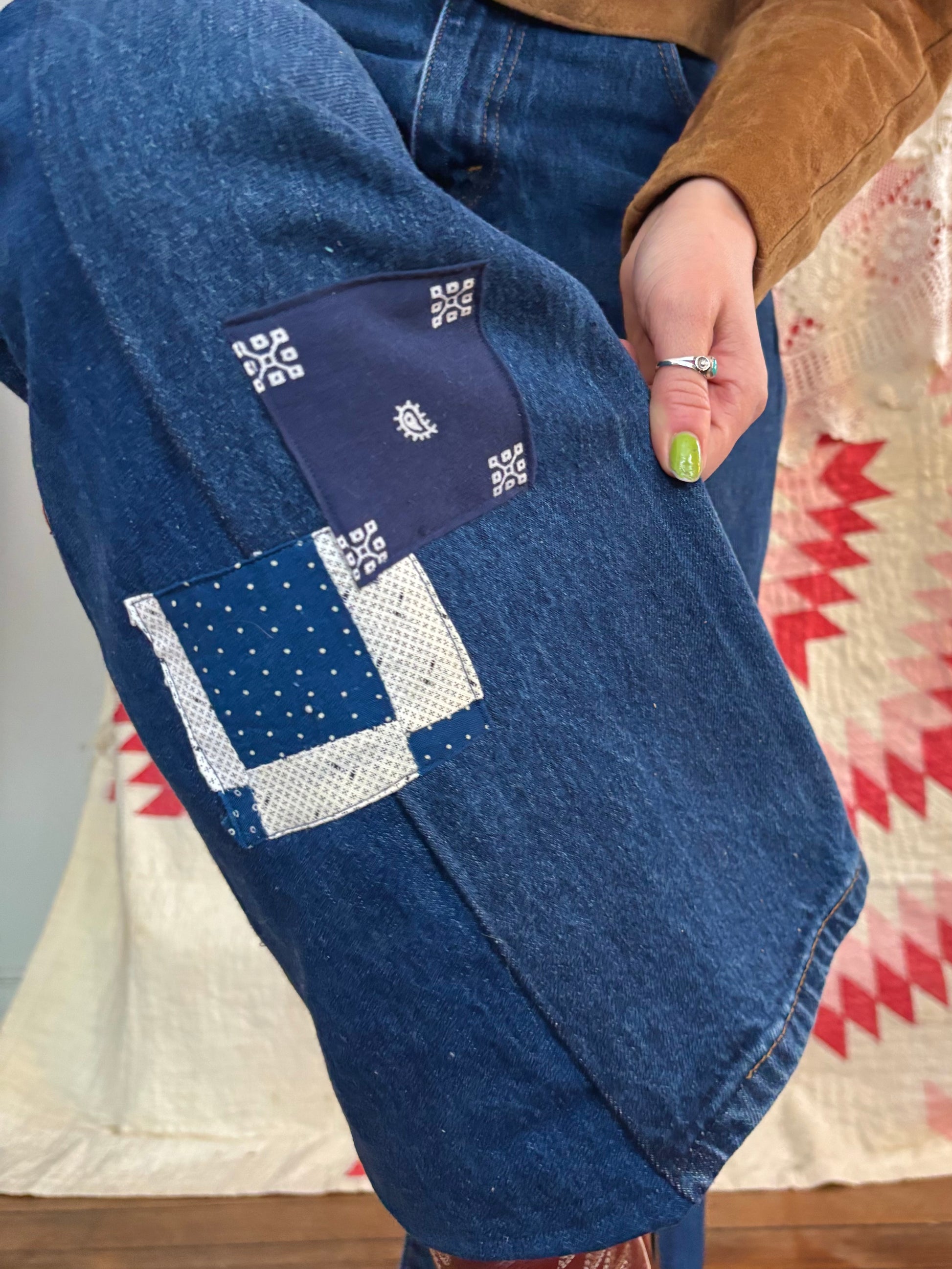 - One floral cotton patch on bum and two antique blue calico and bandana patches on right leg