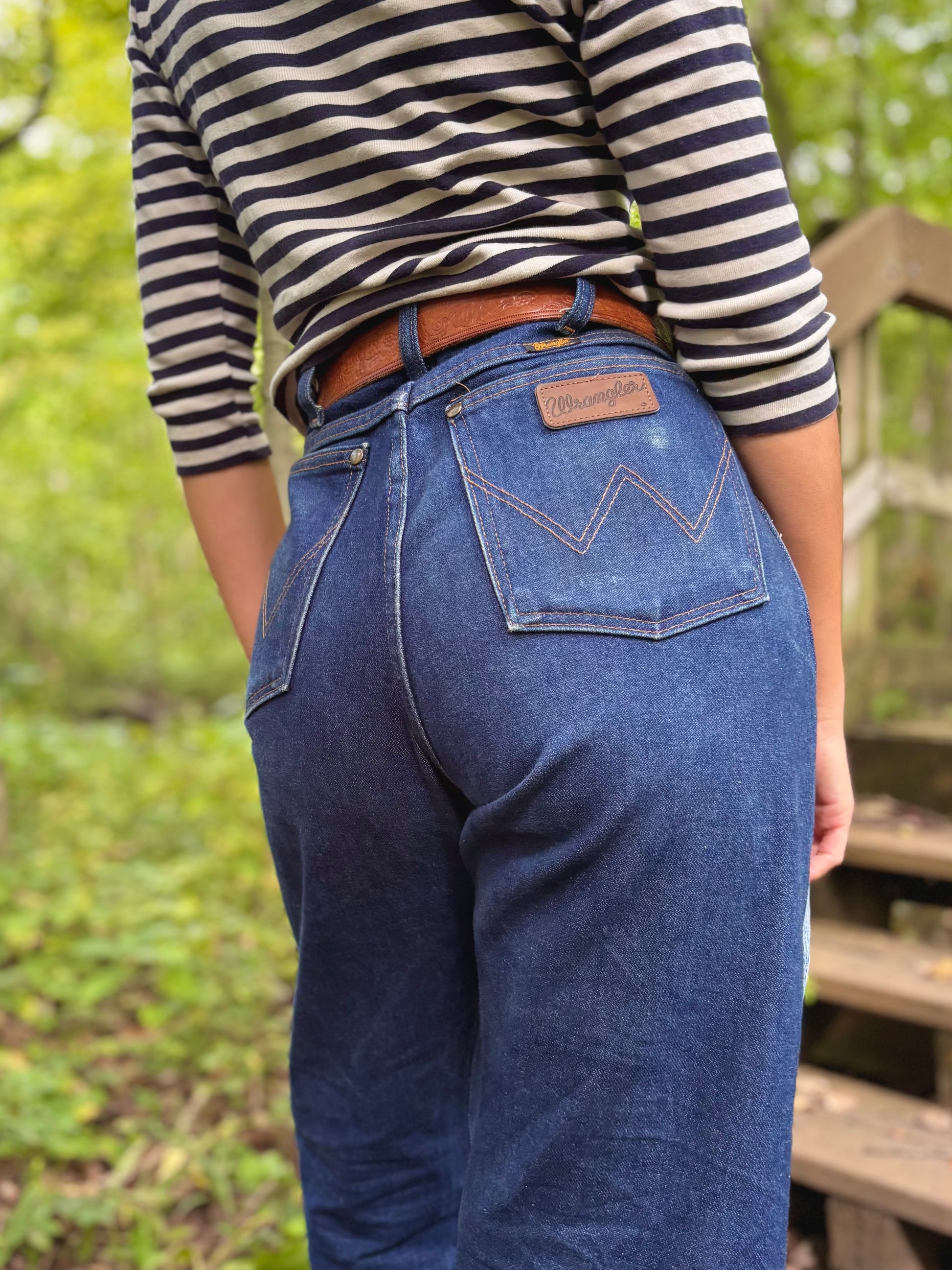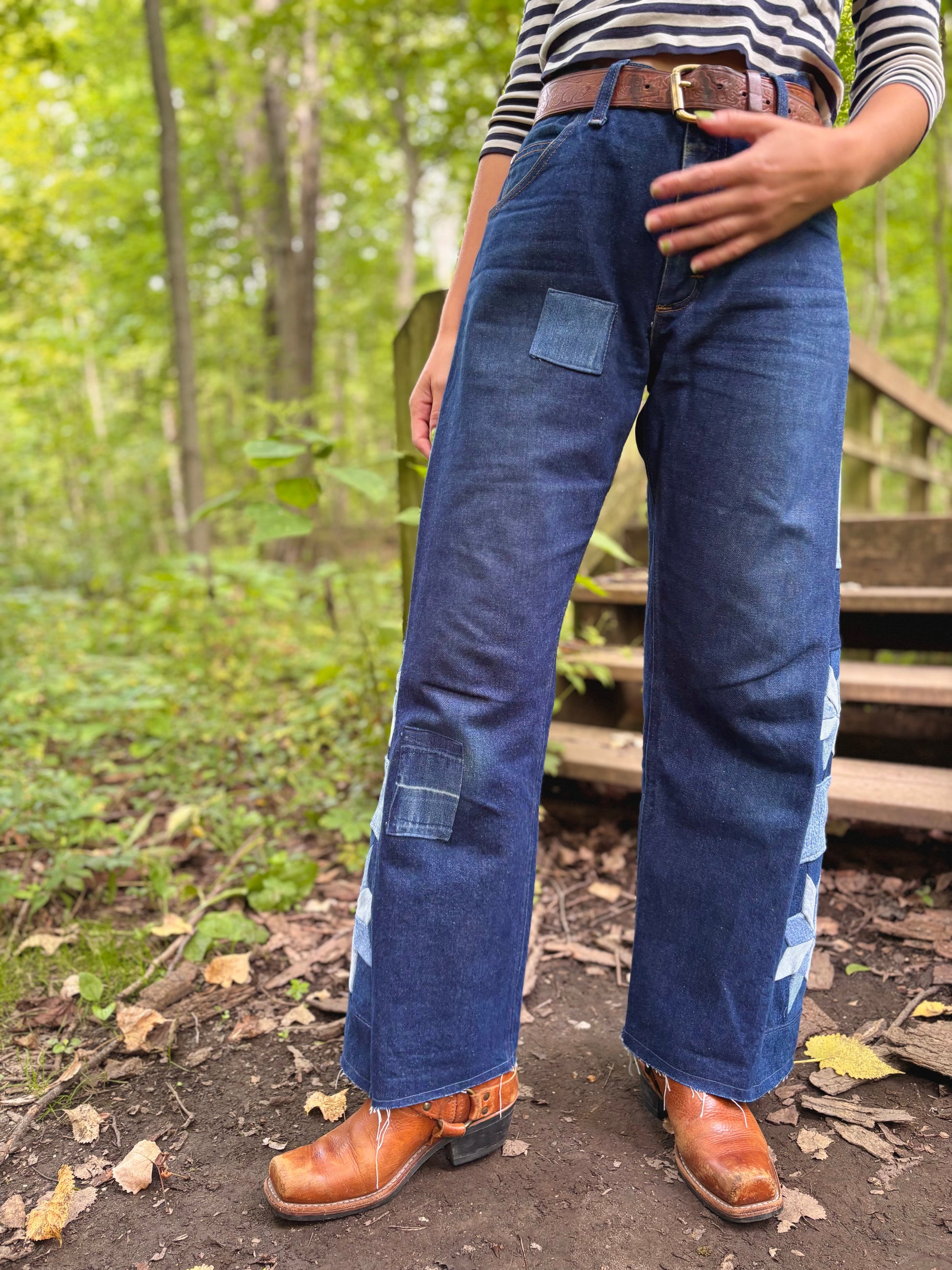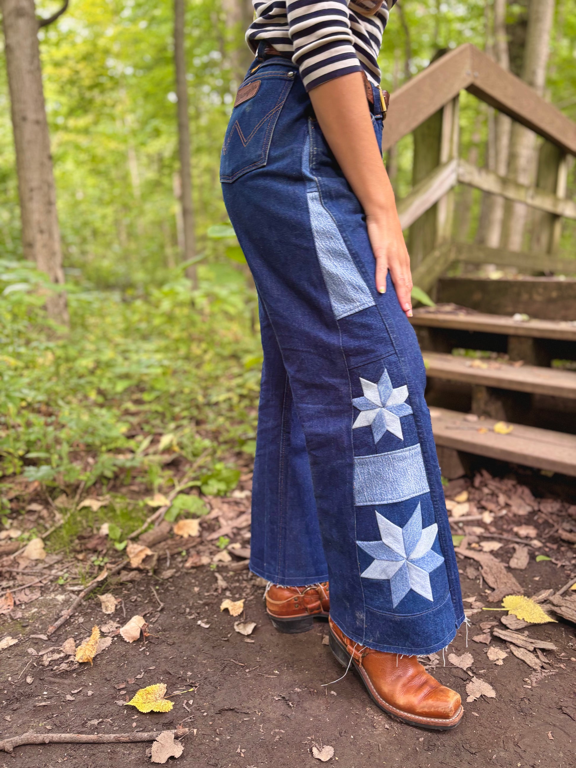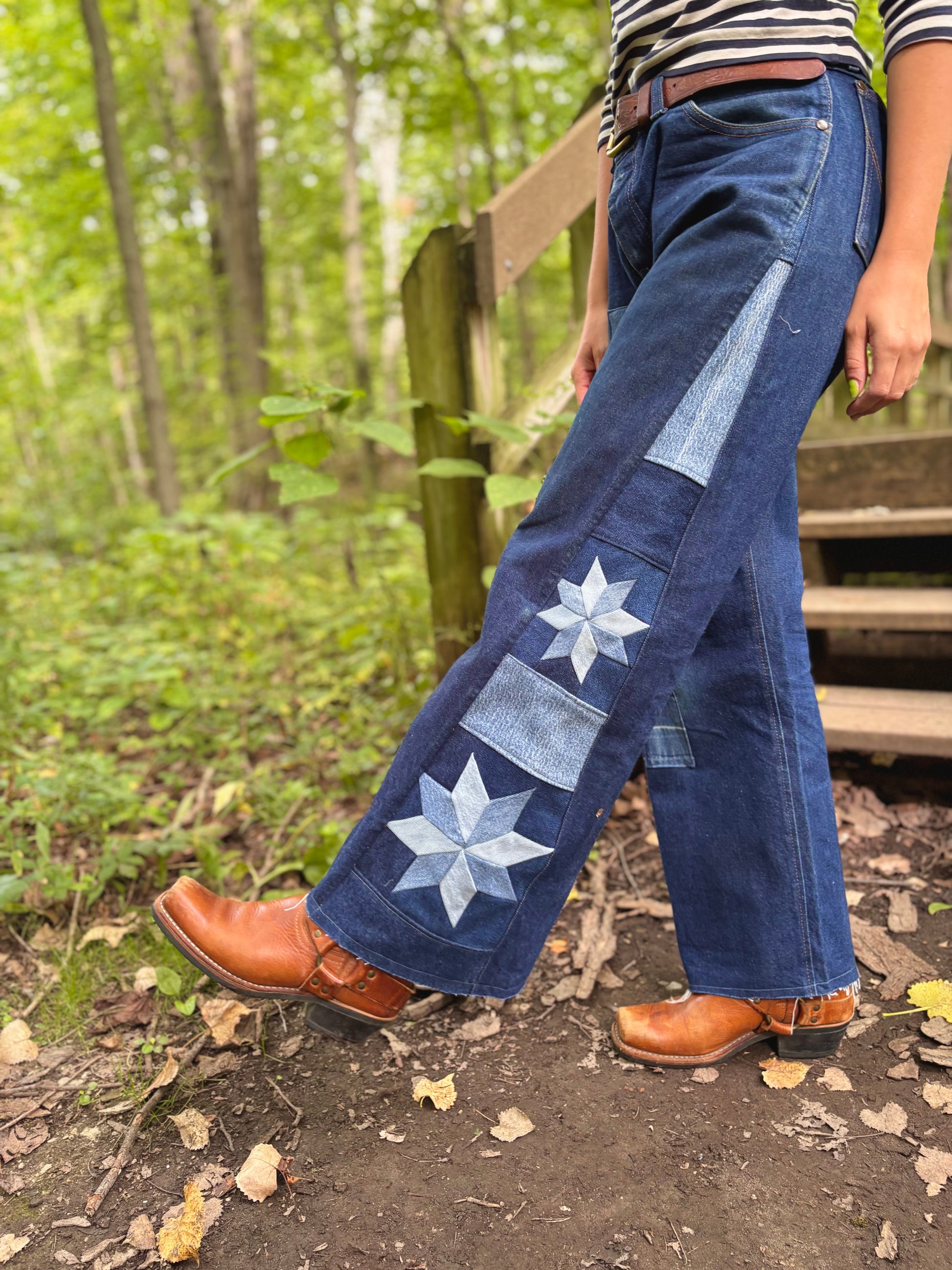 - Quilt star panel on side legs, constructed out of salvaged denim fabric