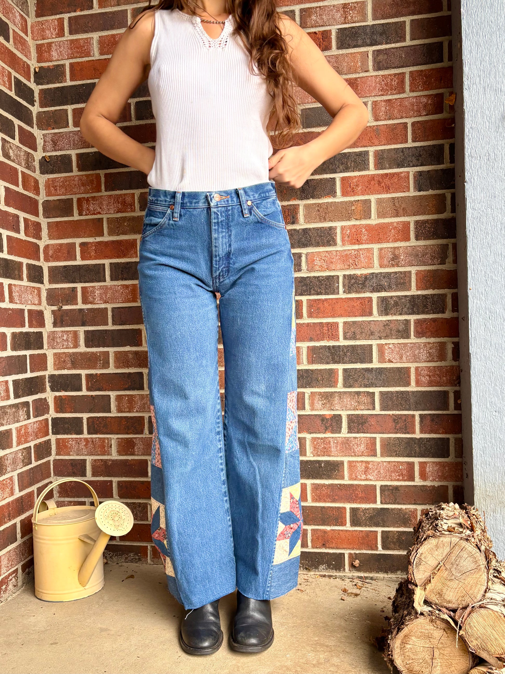 - Quilt star pinwheel panel on side legs, constructed out of vintage fabric in pink, blue and yellow color palette with denim fabric