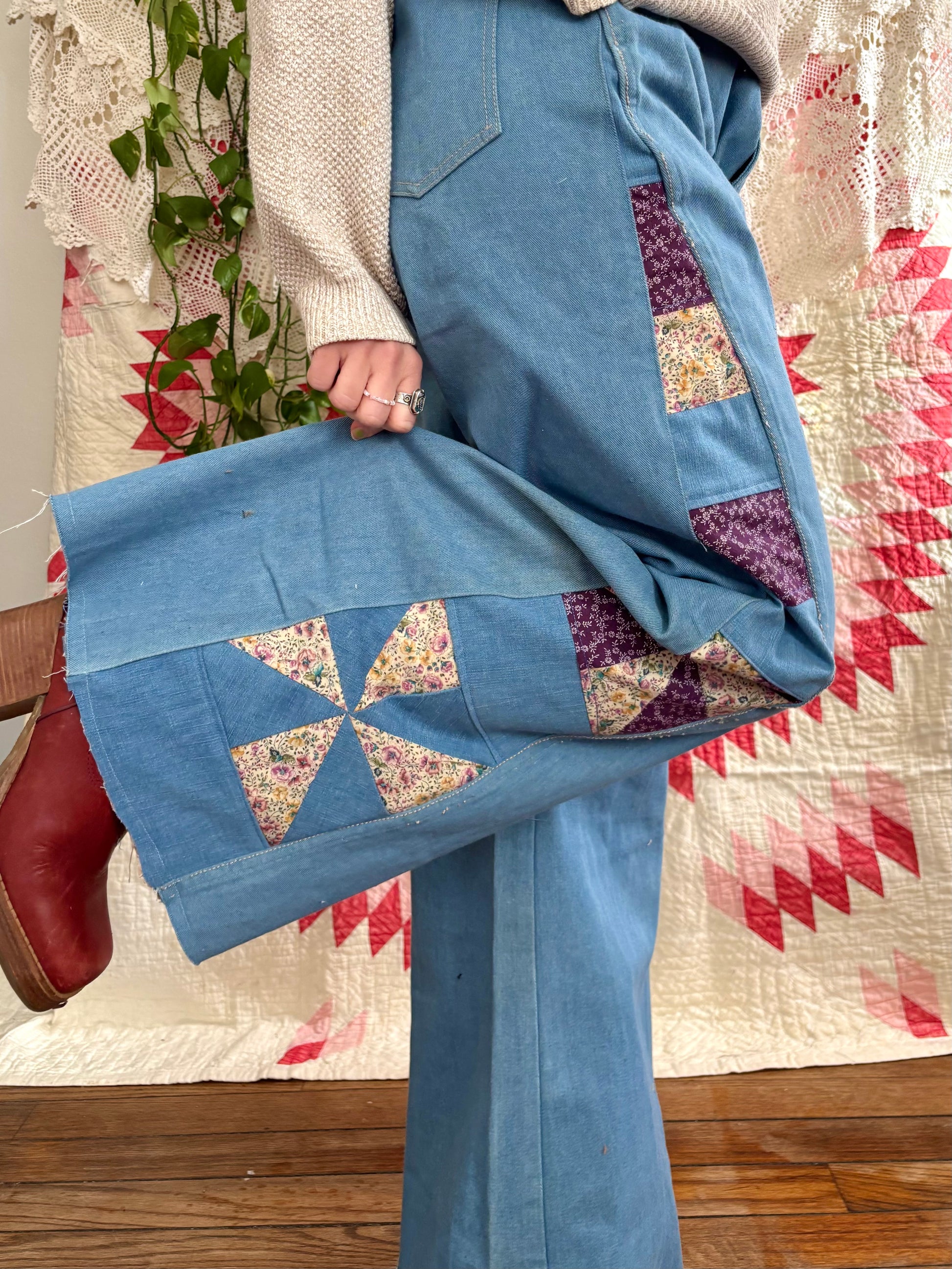 - Quilt pinwheel panel on side legs, constructed out of purple and cream floral cotton with salvaged denim fabric