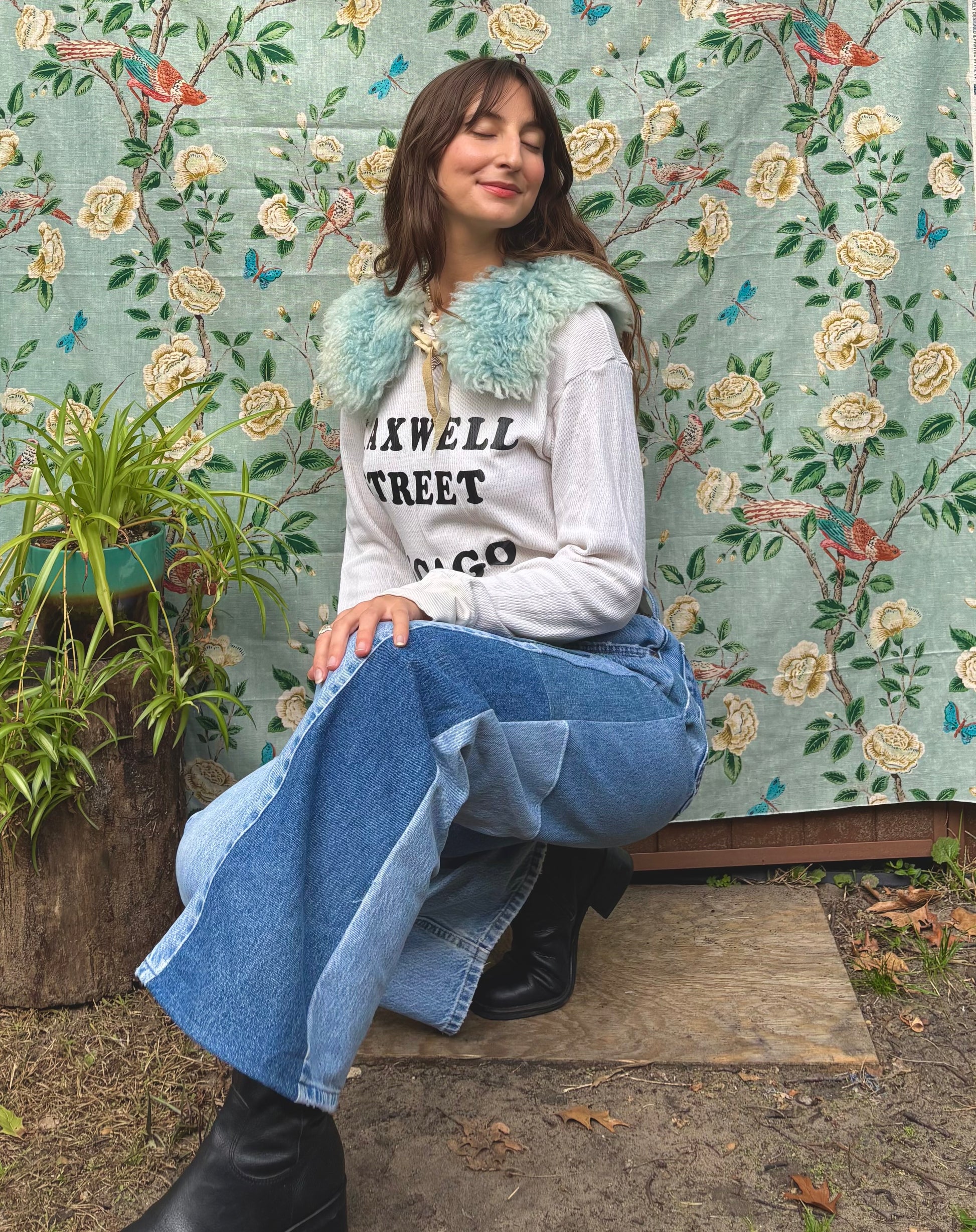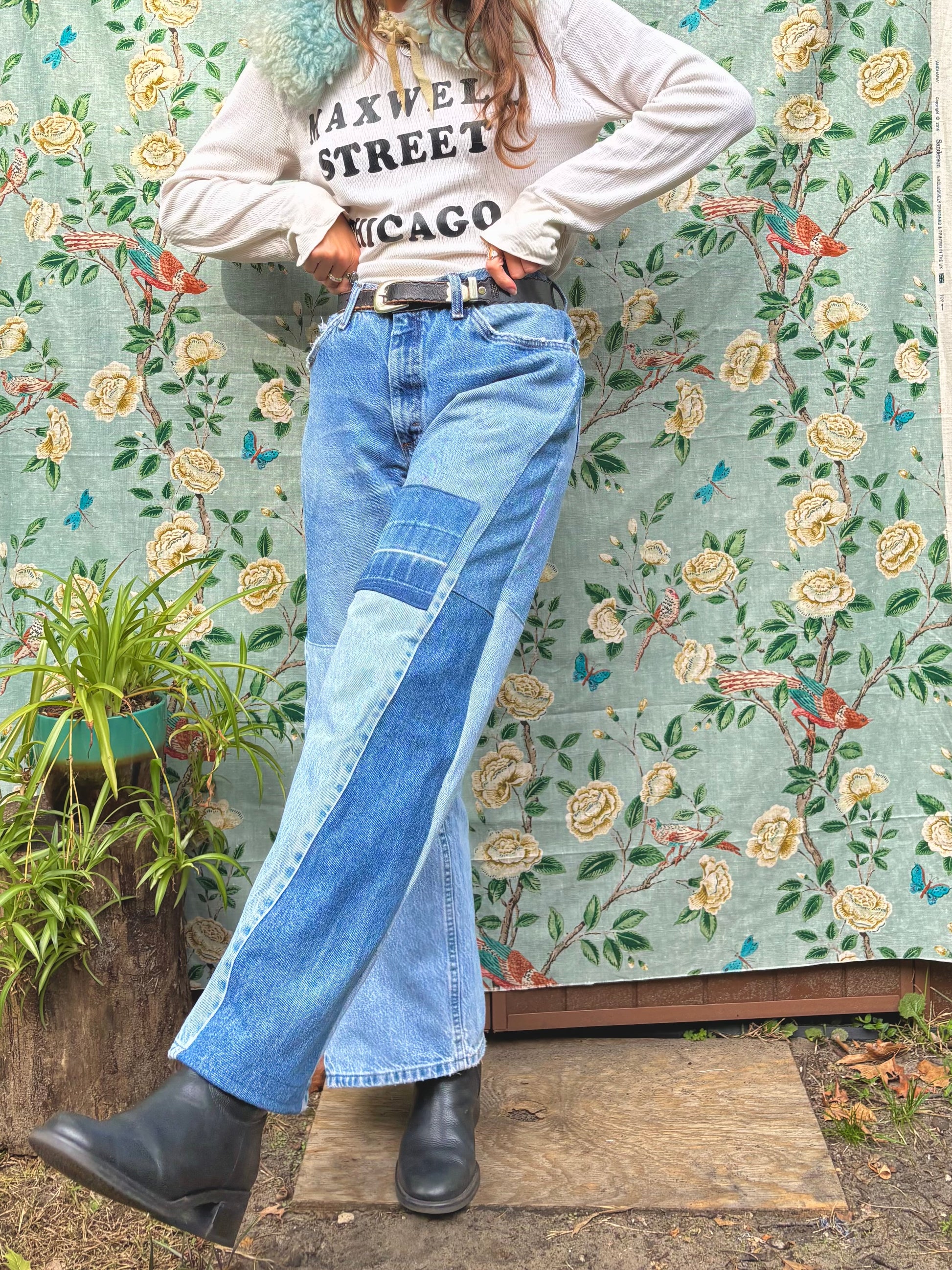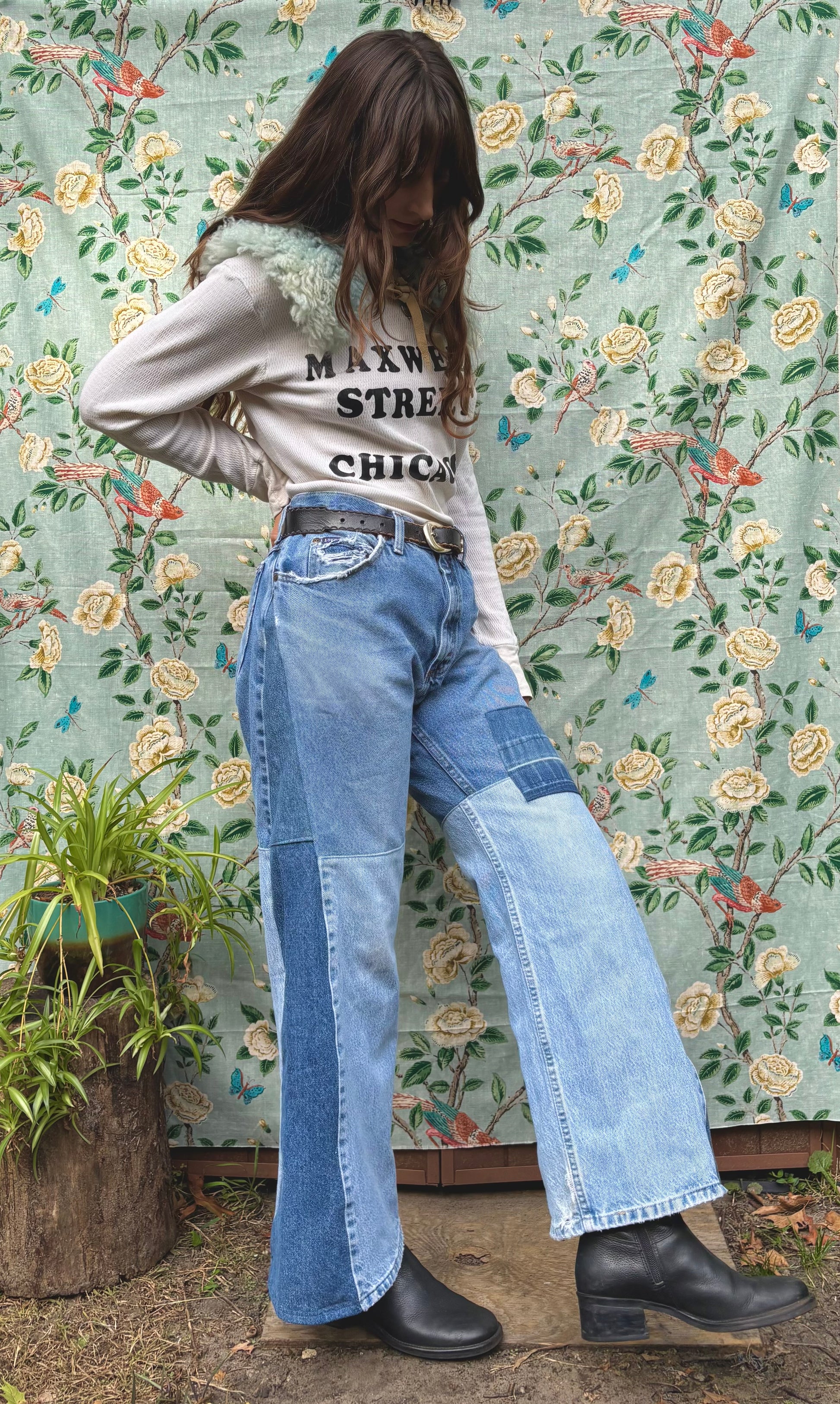 - Medium wash vintage 90s Lee jeans, converted into wide-legs/flares