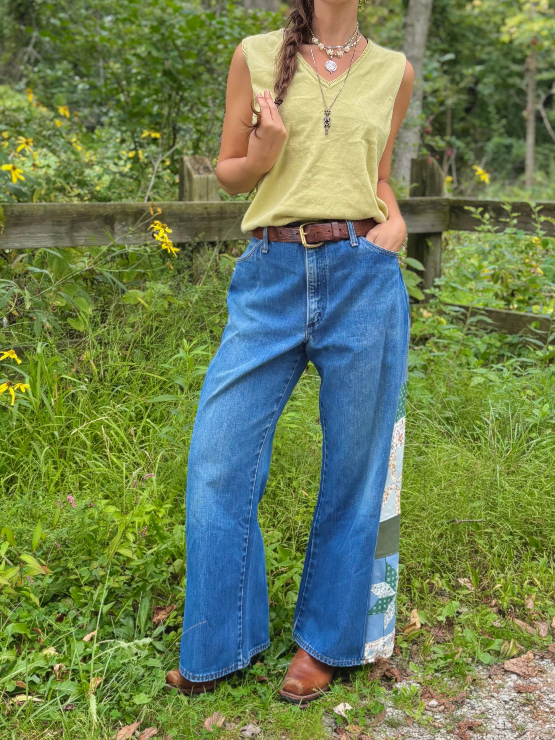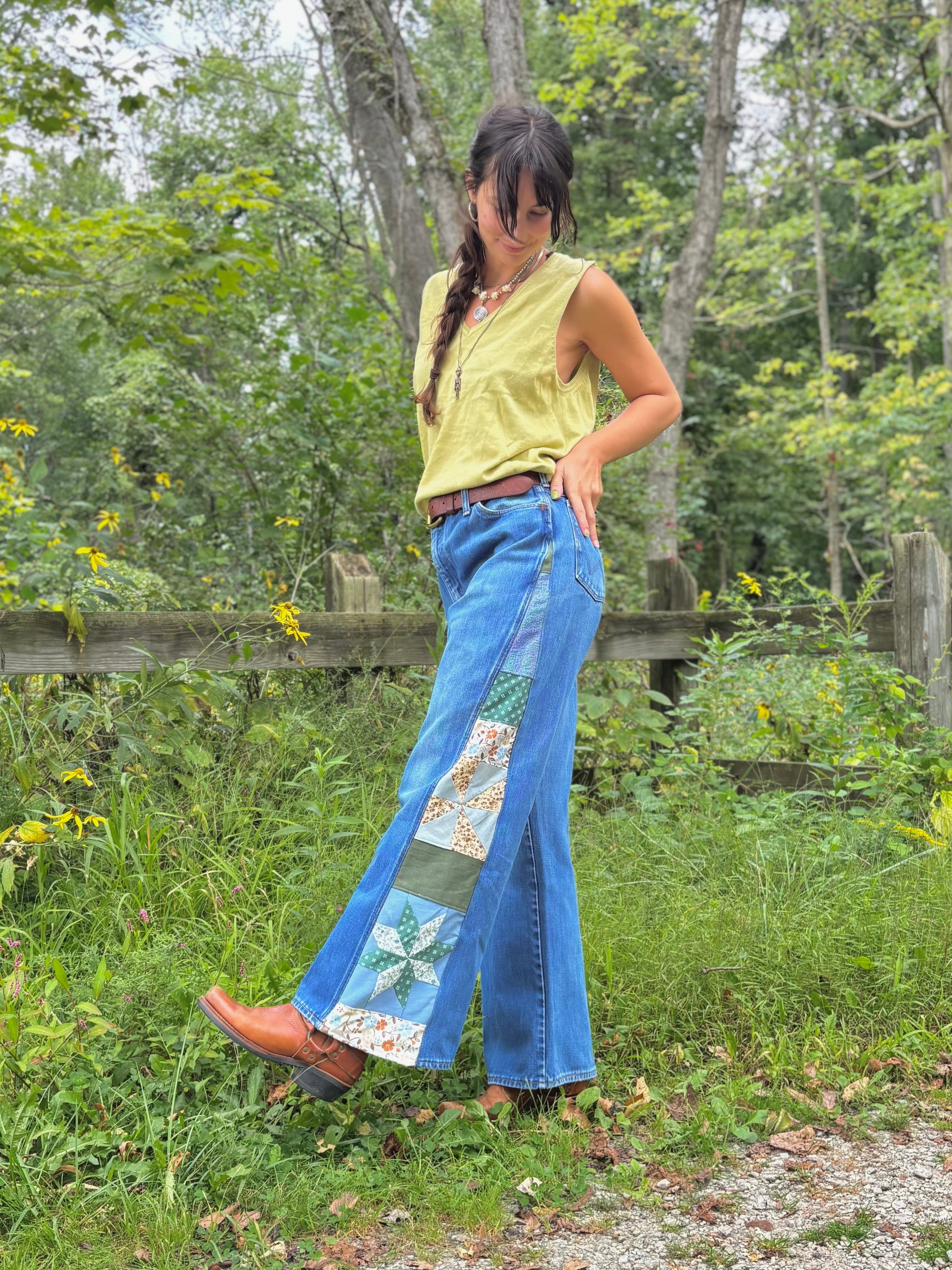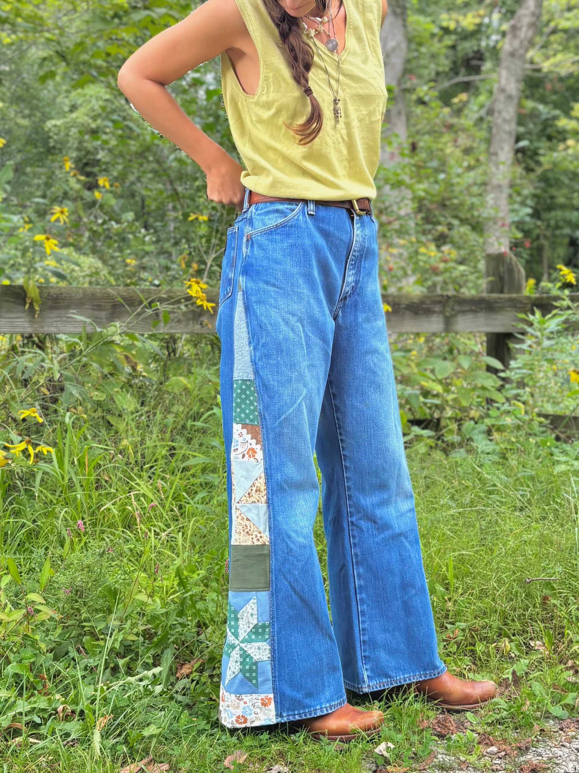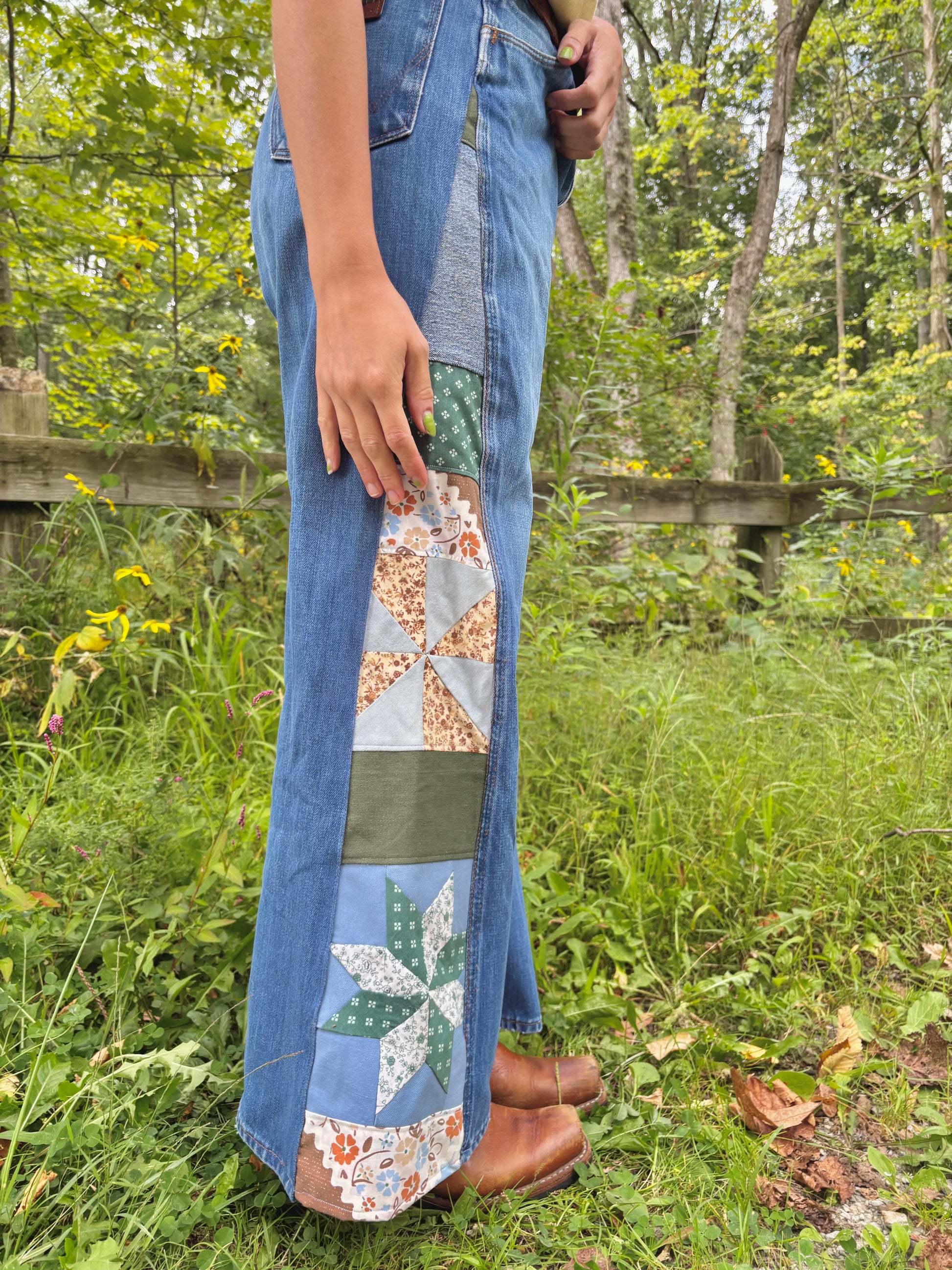 - Quilt pinwheel and star panel on side legs, constructed from vintage warm tone floral fabric and salvaged blue denim fabric