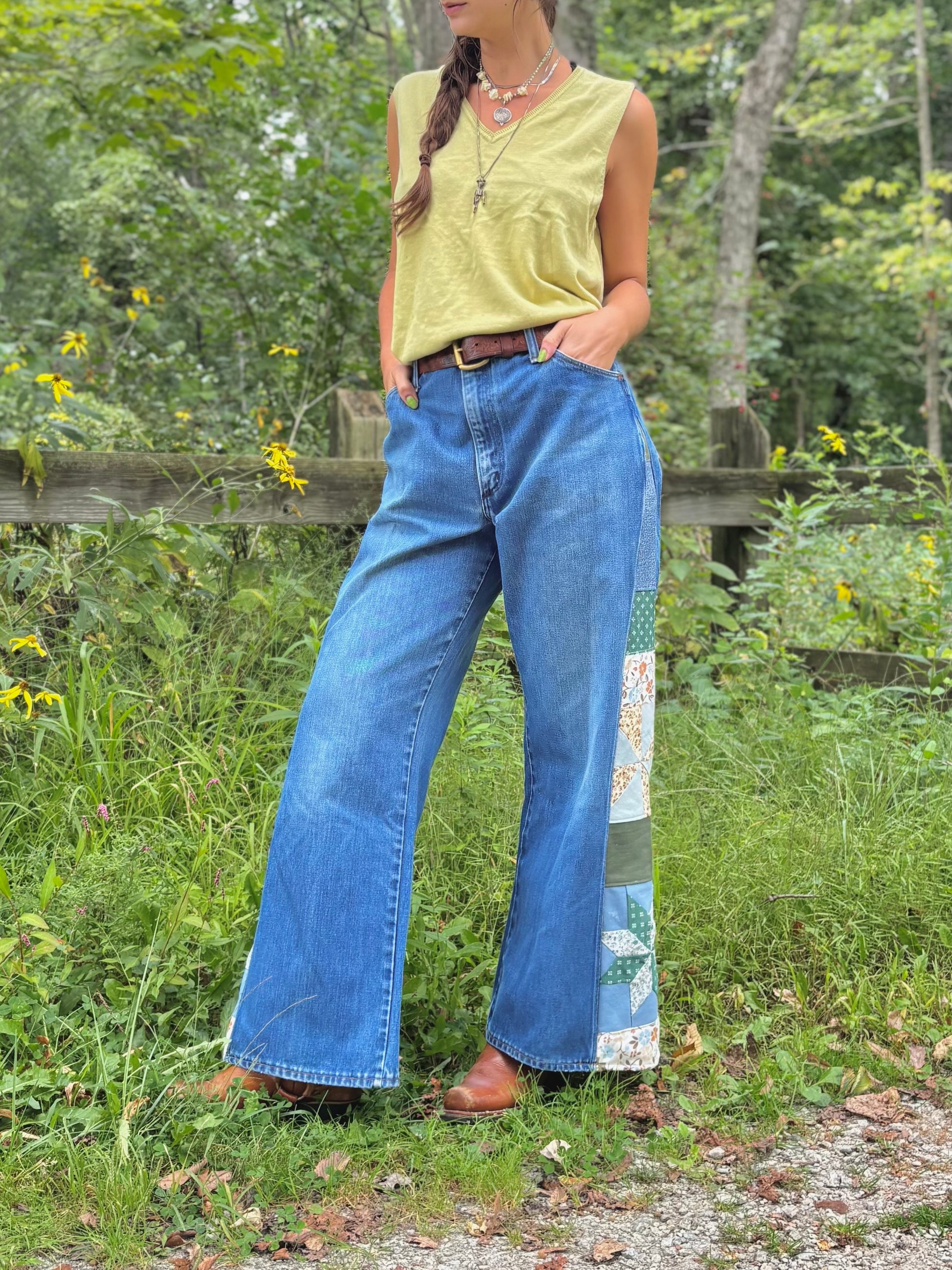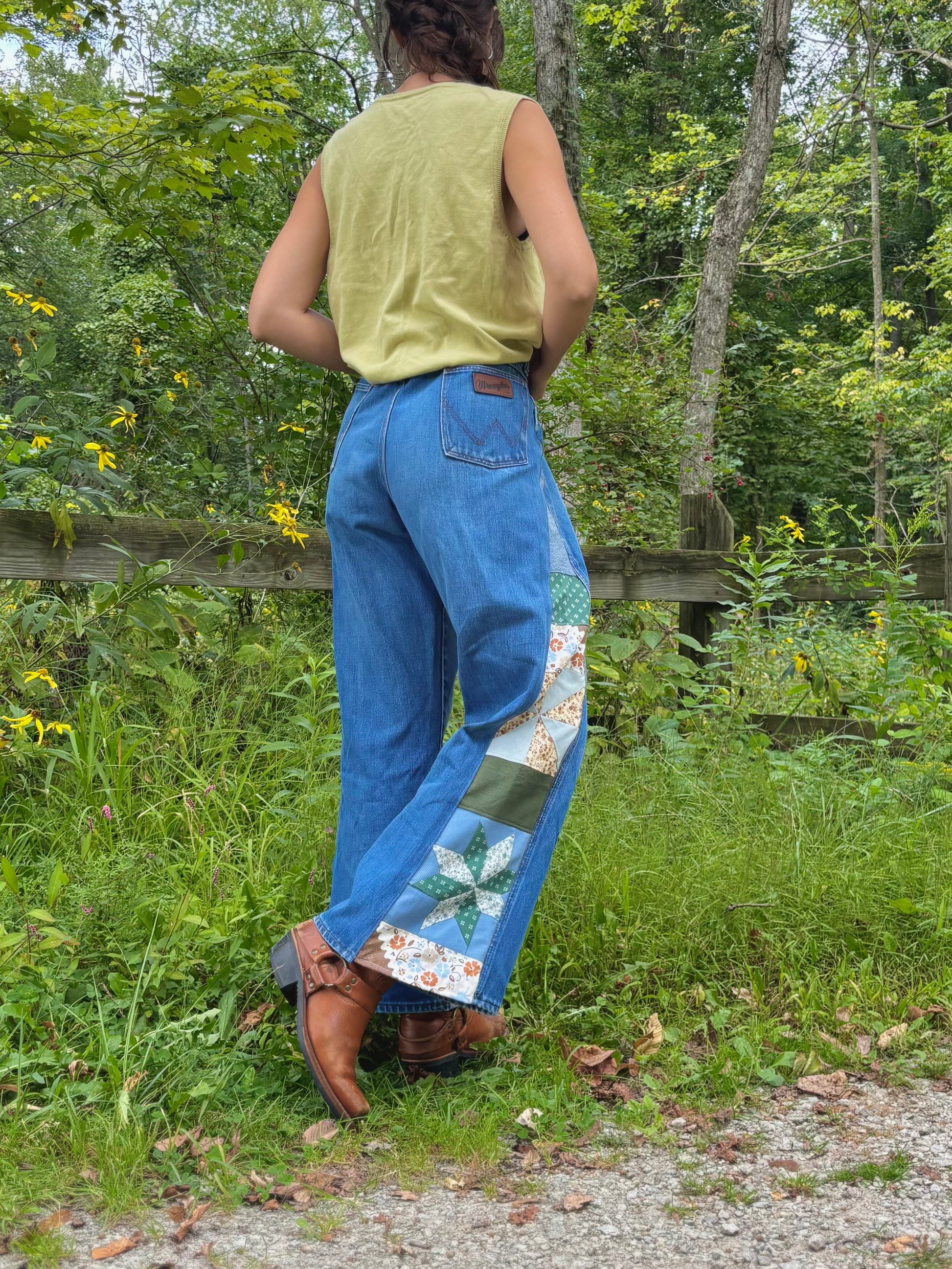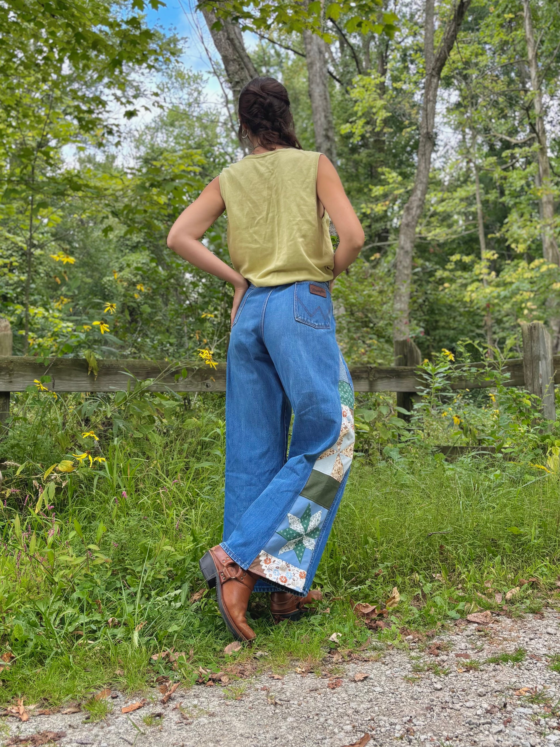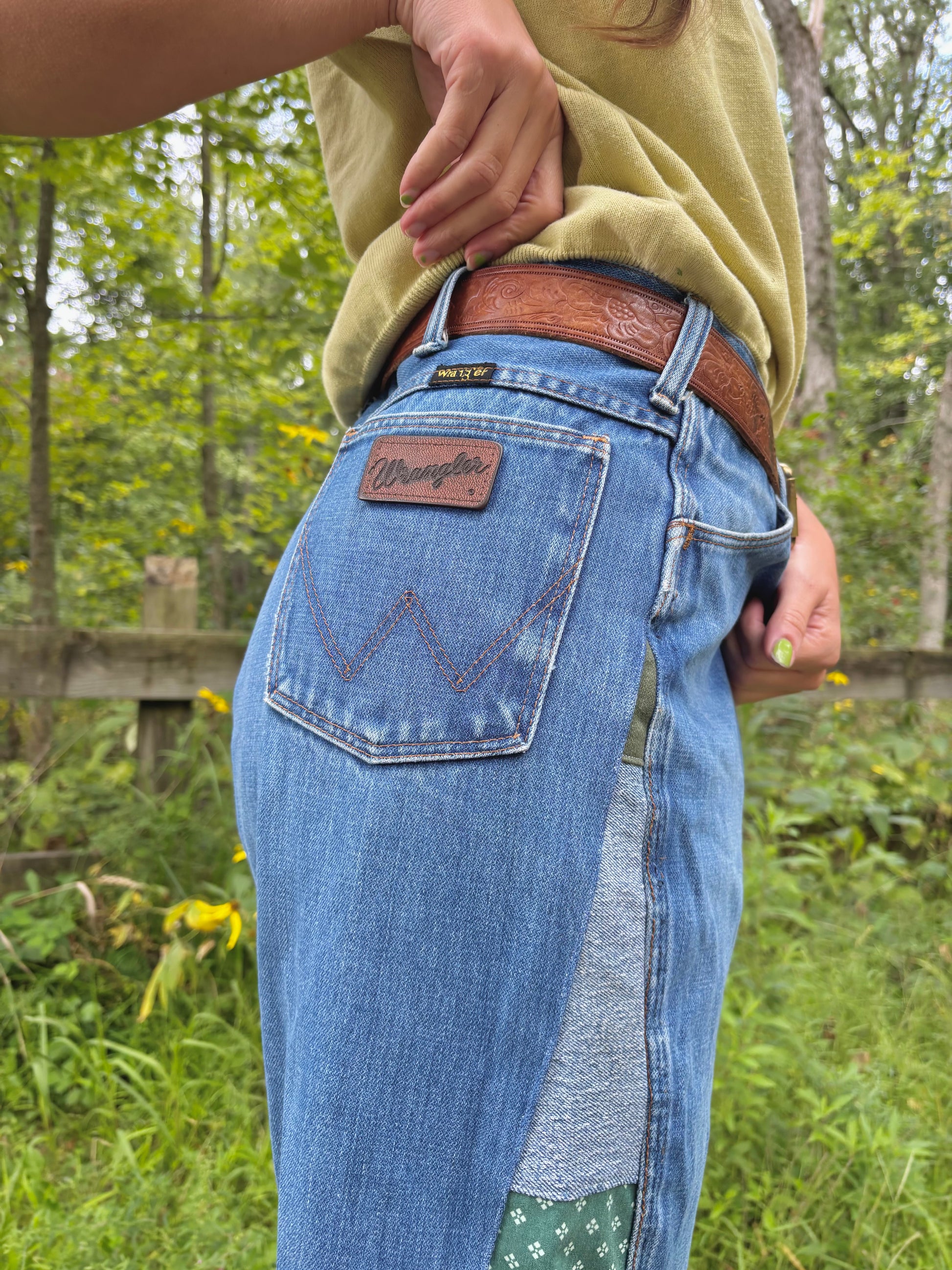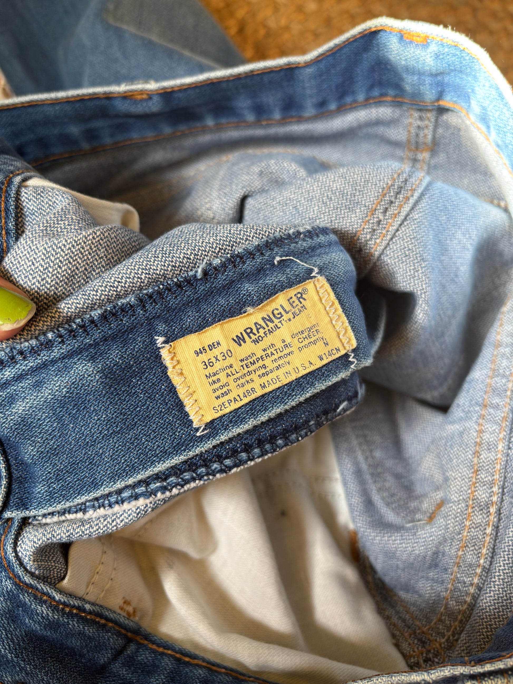 - Light/Medium wash vintage Wrangler jeans, worn in buttery soft, converted into wide-leg/flares