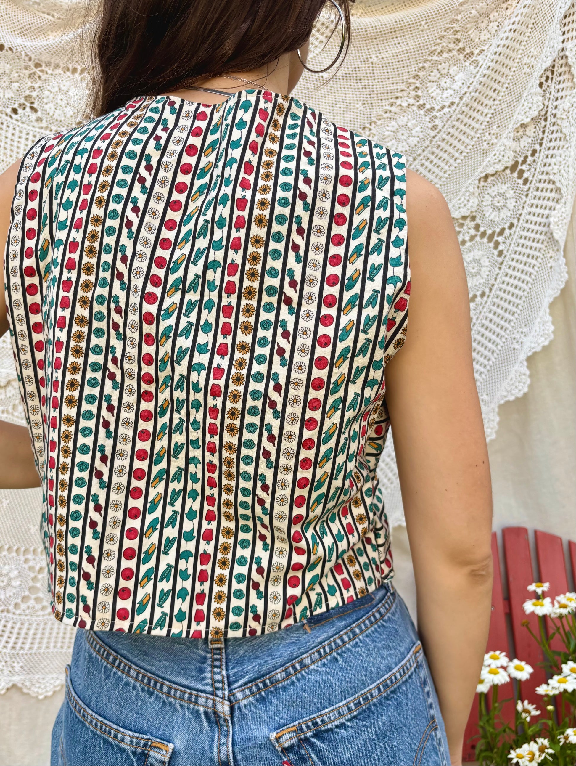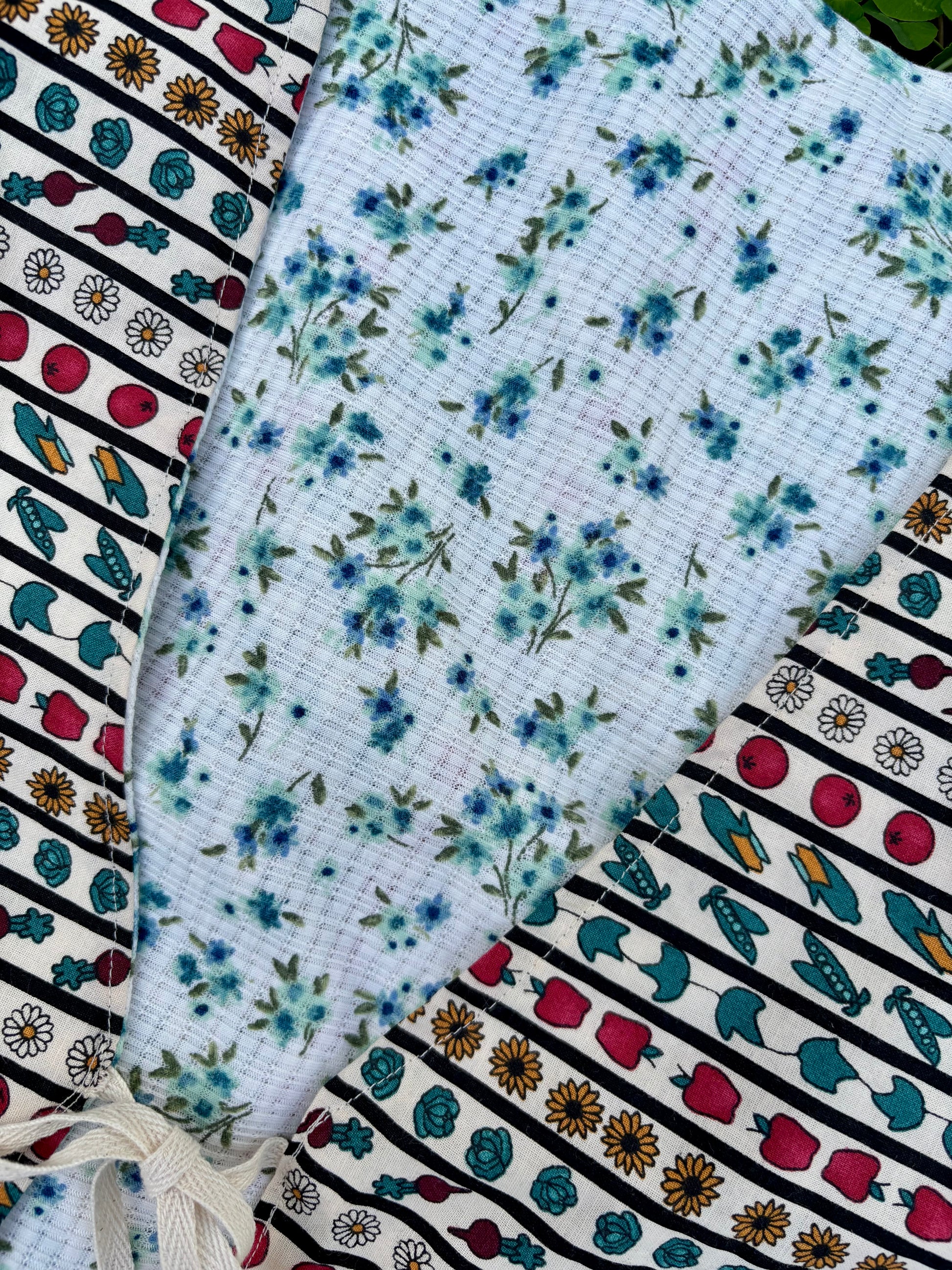 - Constructed from vintage cotton veggie print fabric and soft blue floral pointelle fabric