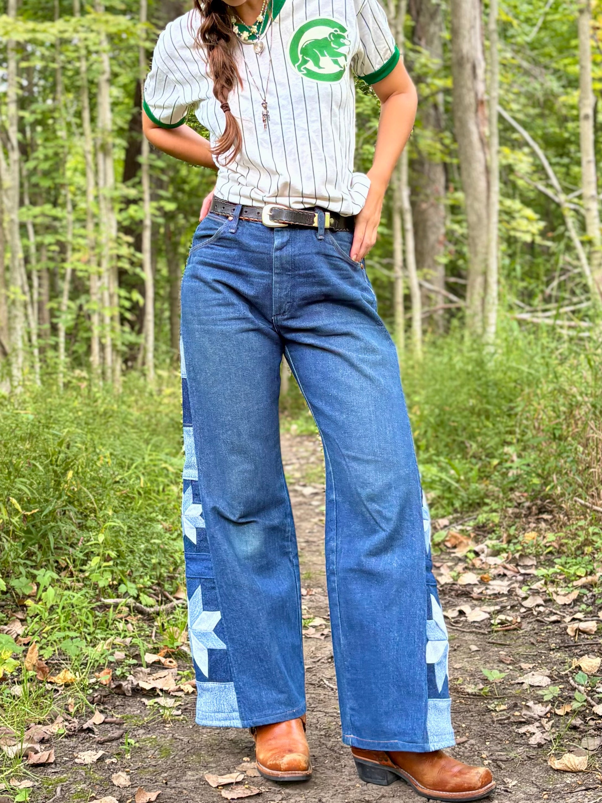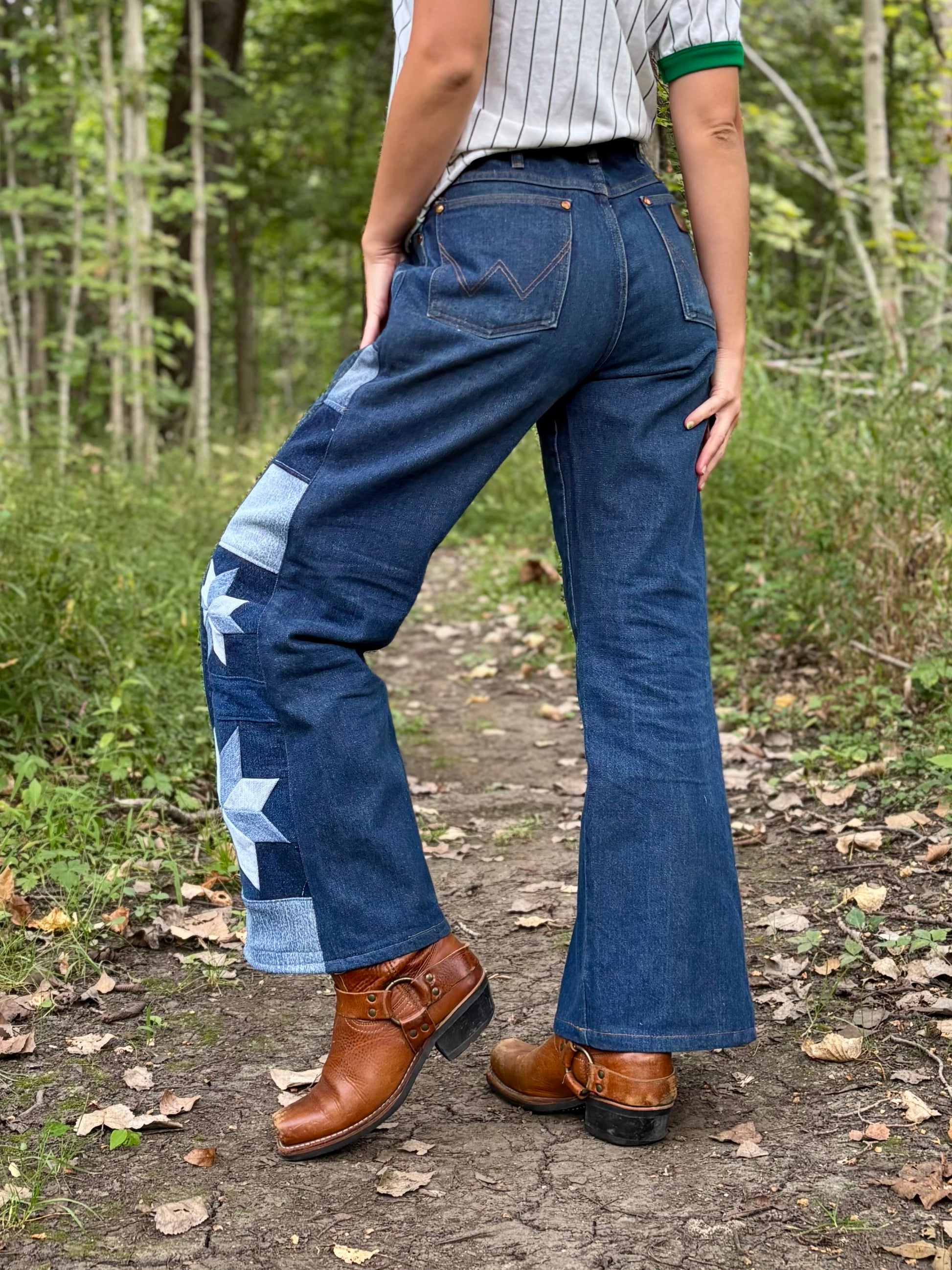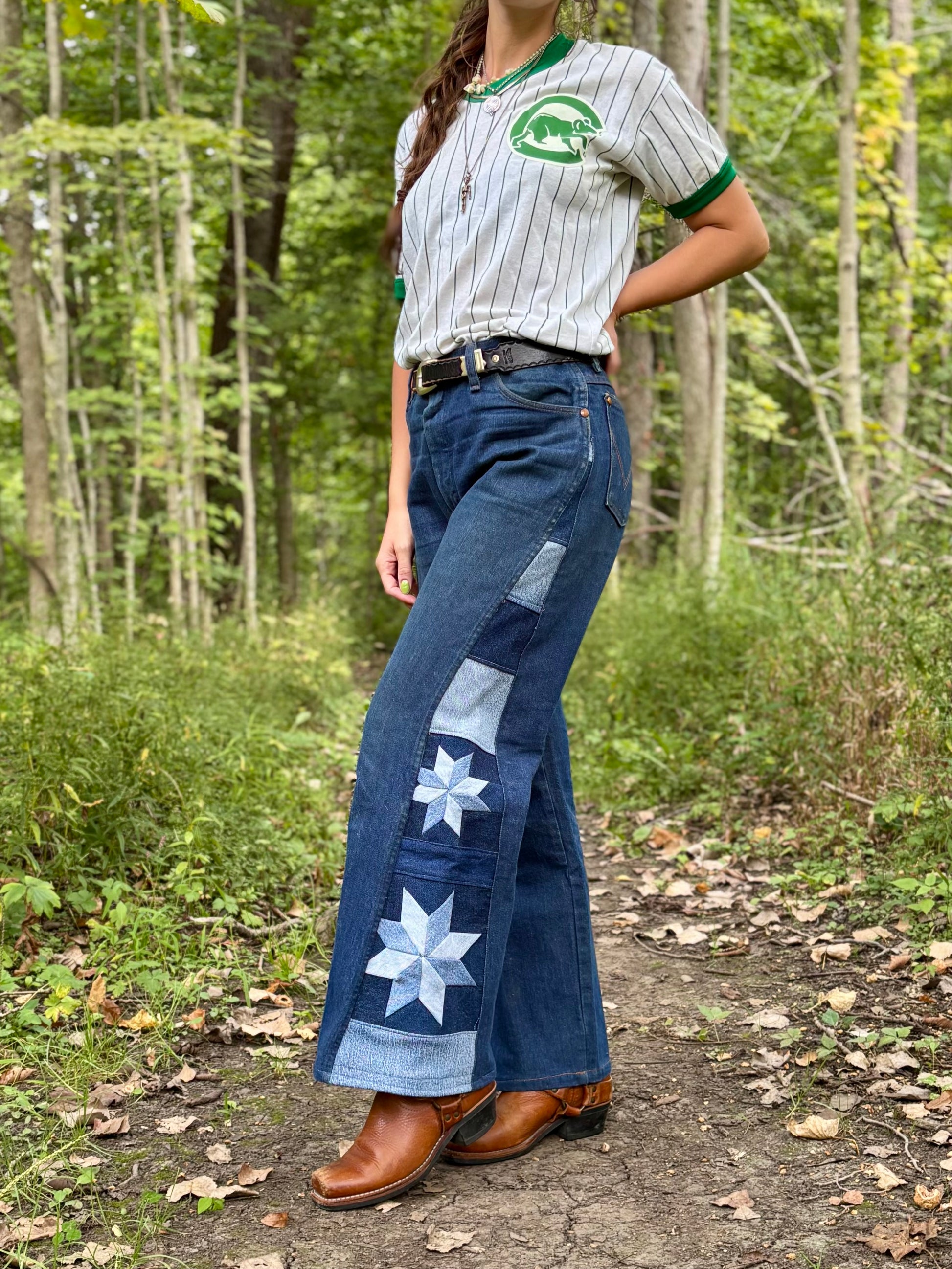 - Quilt star panel on side legs, constructed out of salvaged denim fabric