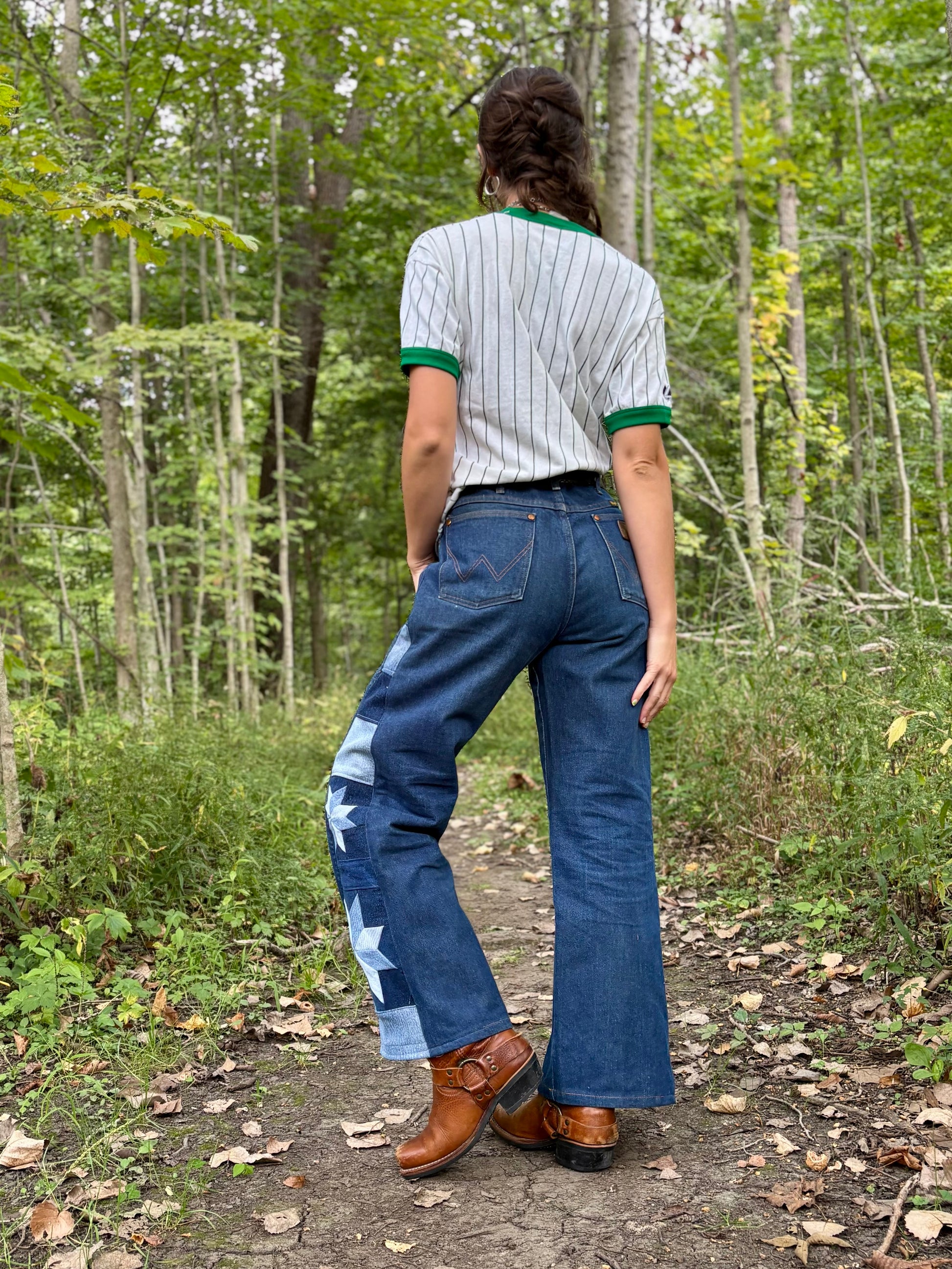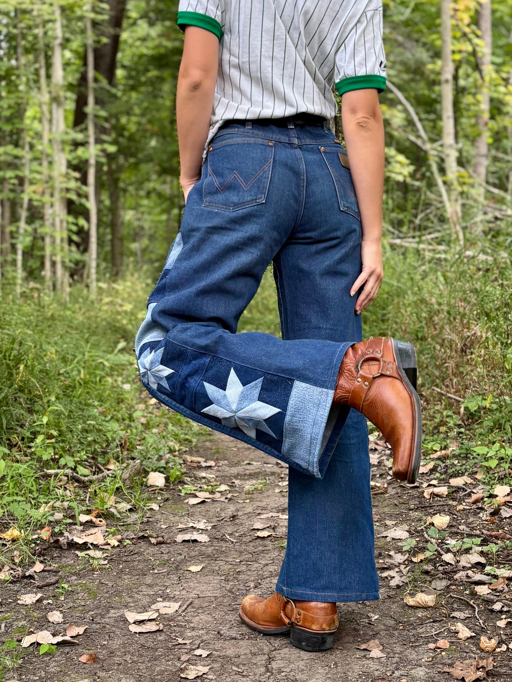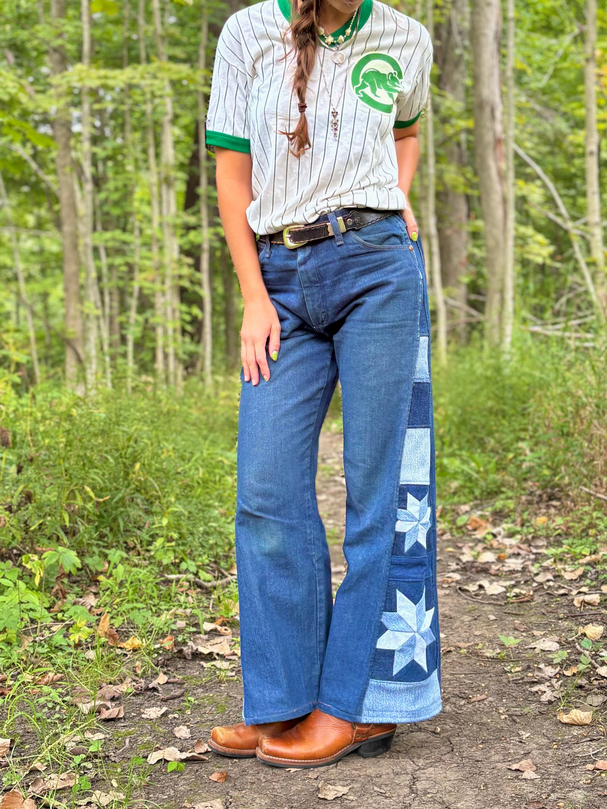 - Quilt star panel on side legs, constructed out of salvaged denim fabric