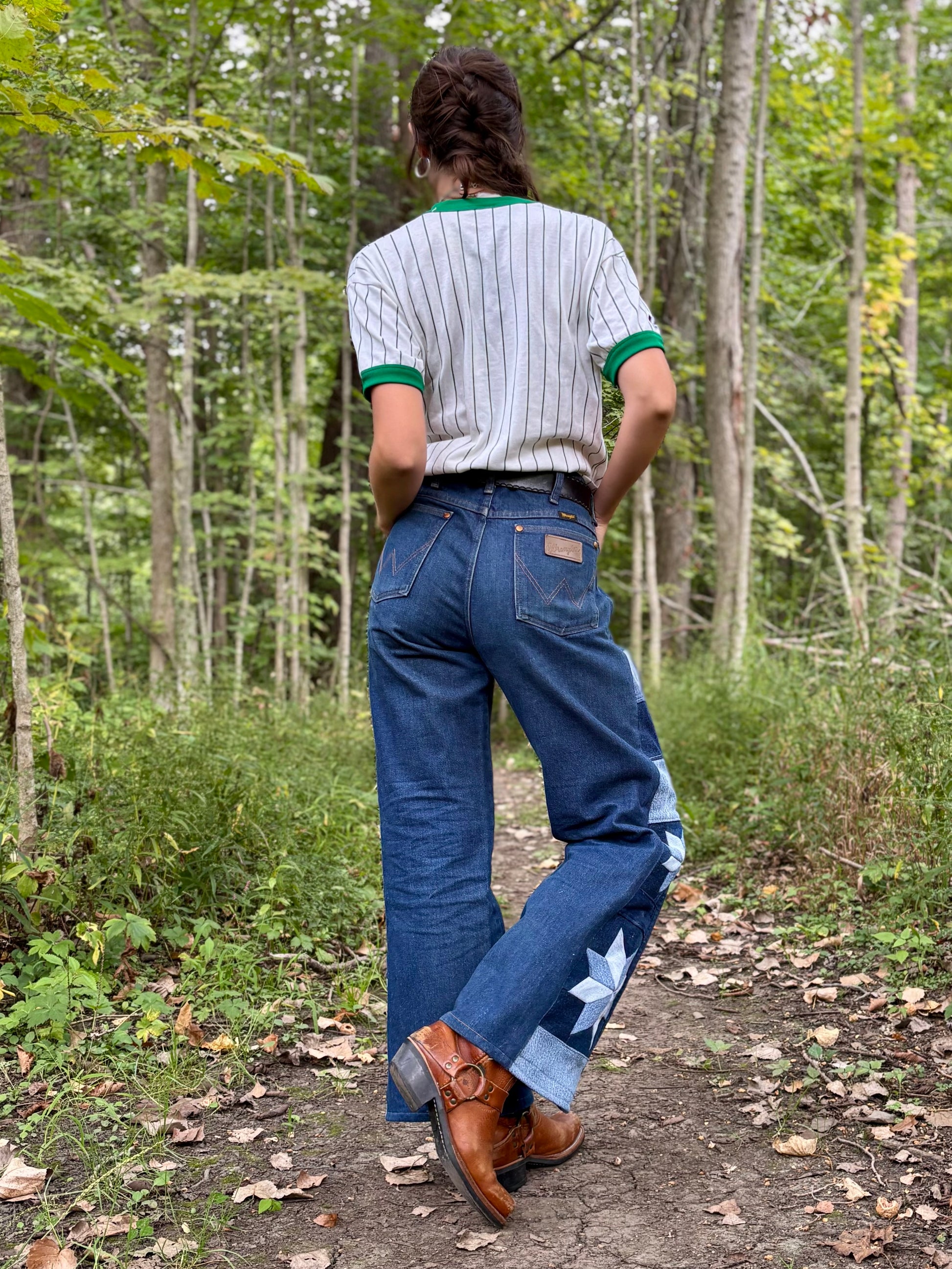 - Dark wash Wrangler jeans, converted into wide-legs